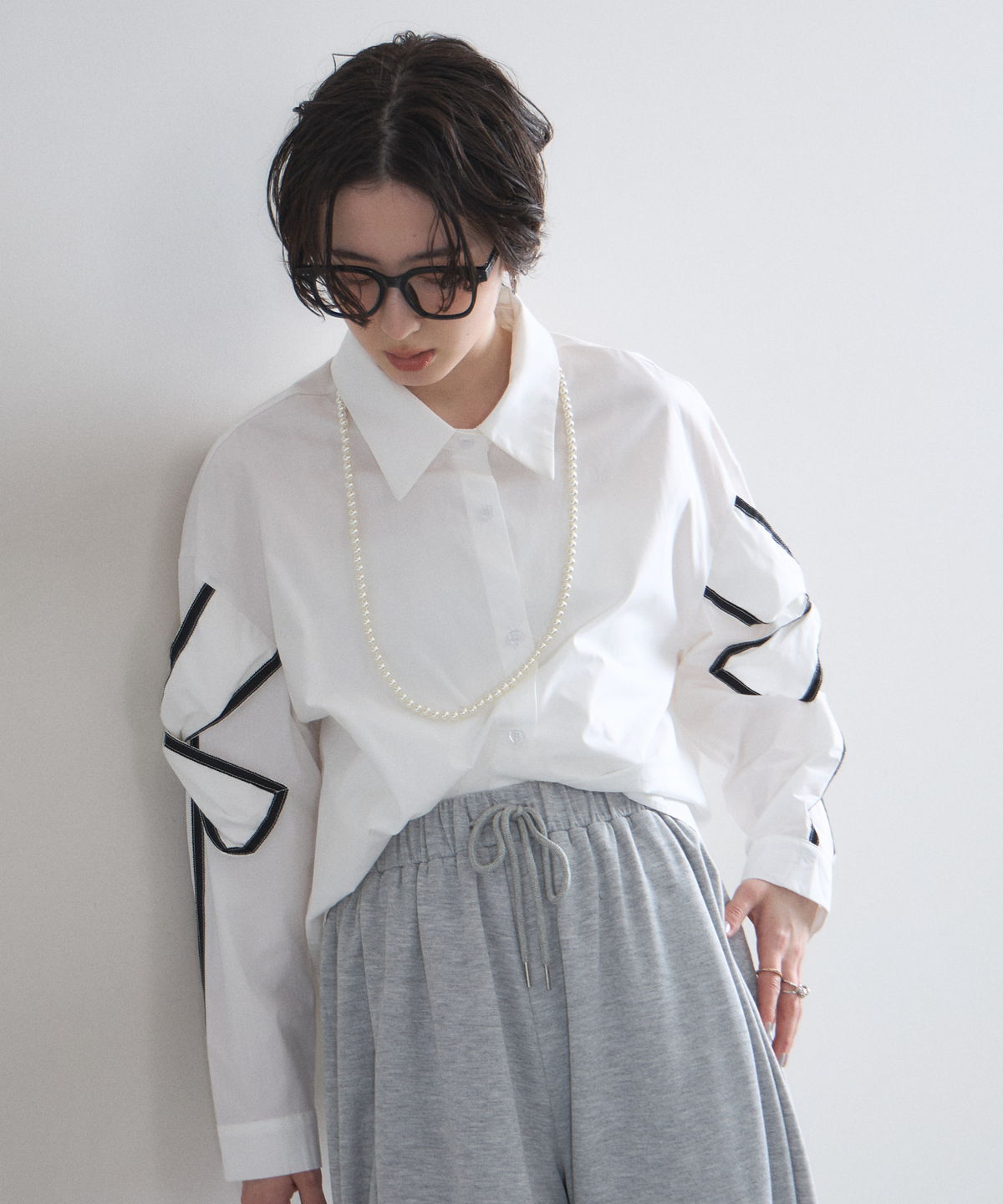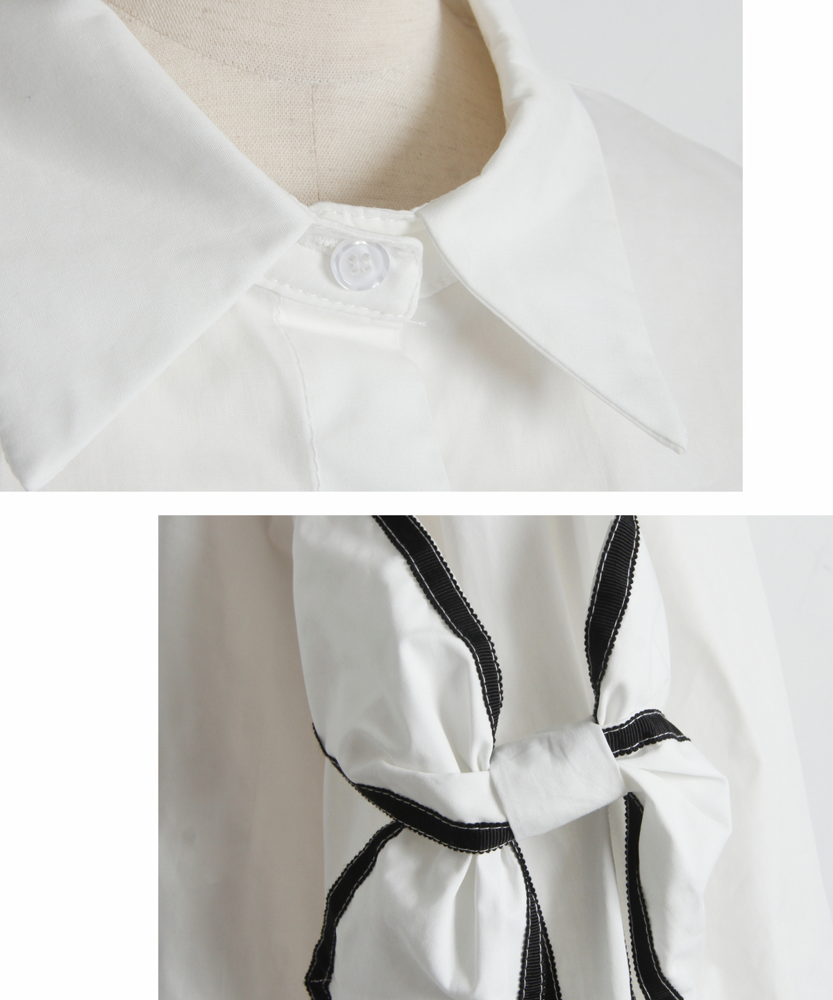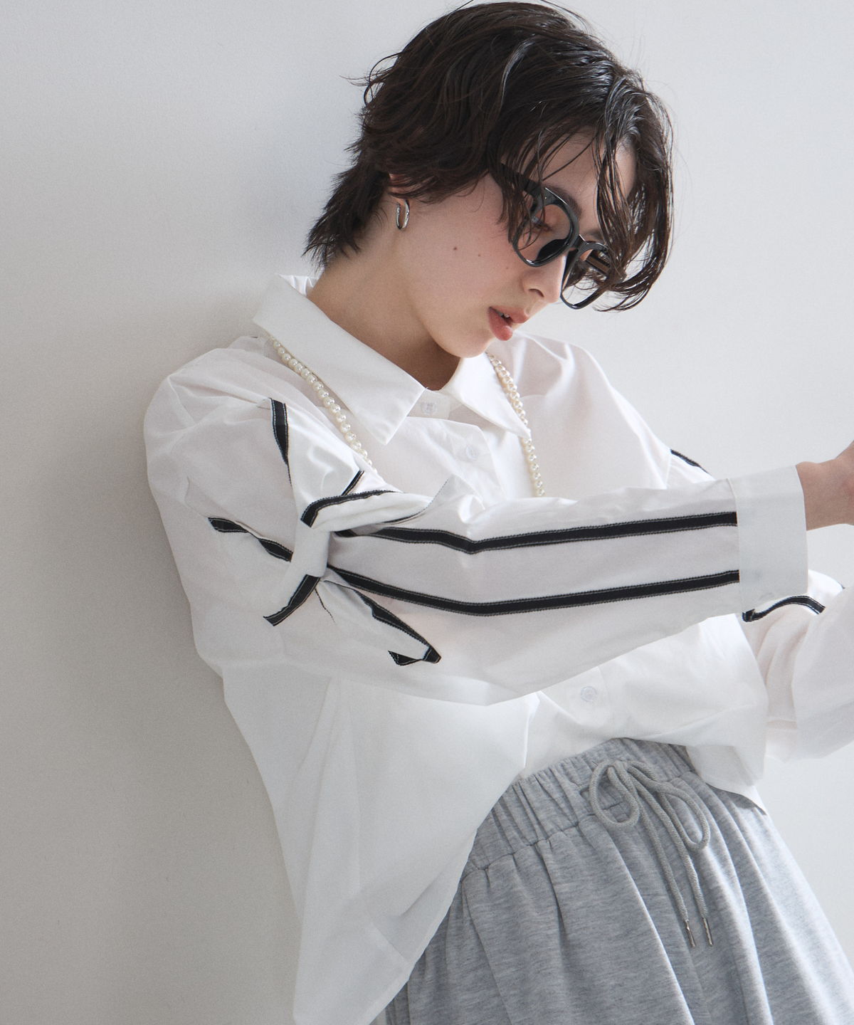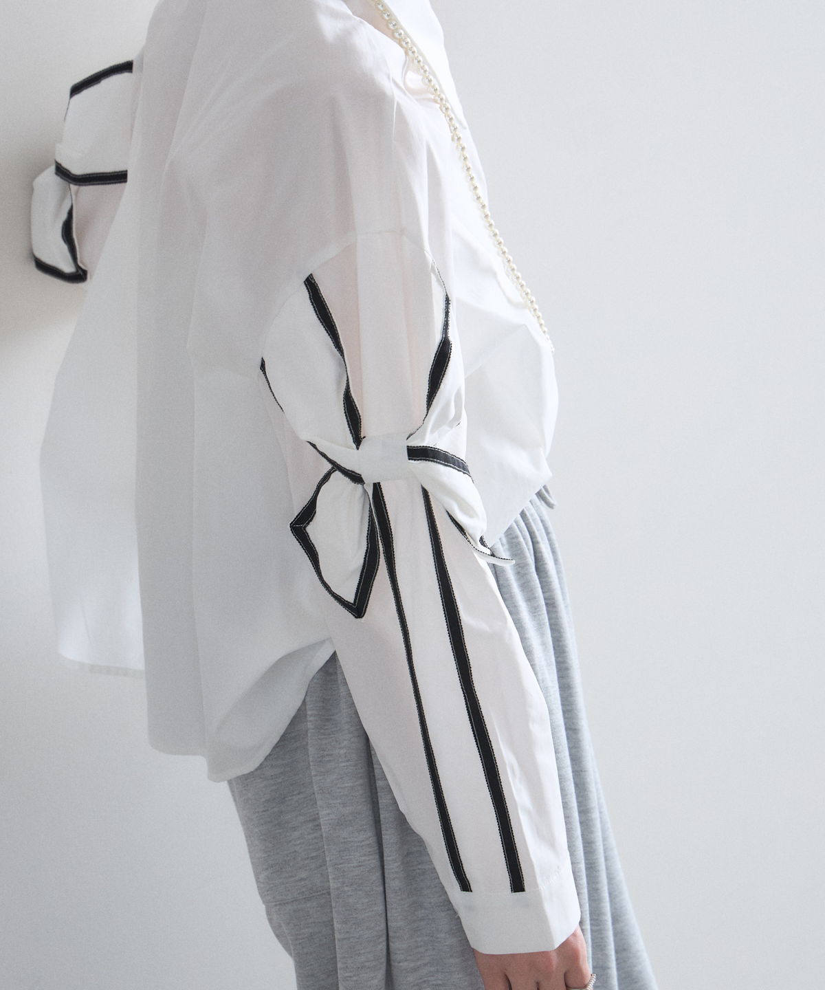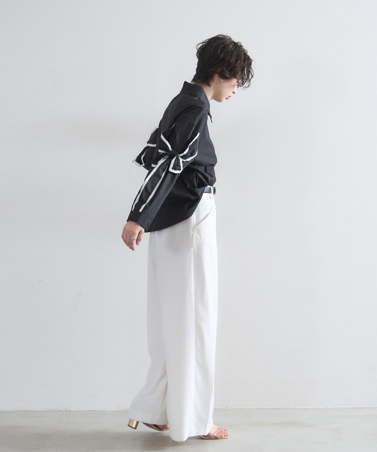 | 商品説明 | : | 袖のリボンデザインが目を惹く、大人可愛い主役級ブラウス。 袖にあしらわれた大胆なバイカラーのリボンモチーフが、1枚で華やかな印象を与えてくれるブラウスです。 ゆったりとしたワイドシルエットで抜け感を出しつつ、クリーンなシャツ襟が上品さをキープ。 モノトーン配色なので甘くなりすぎず、パンツにもスカートにも合わせやすい一着です。 |
