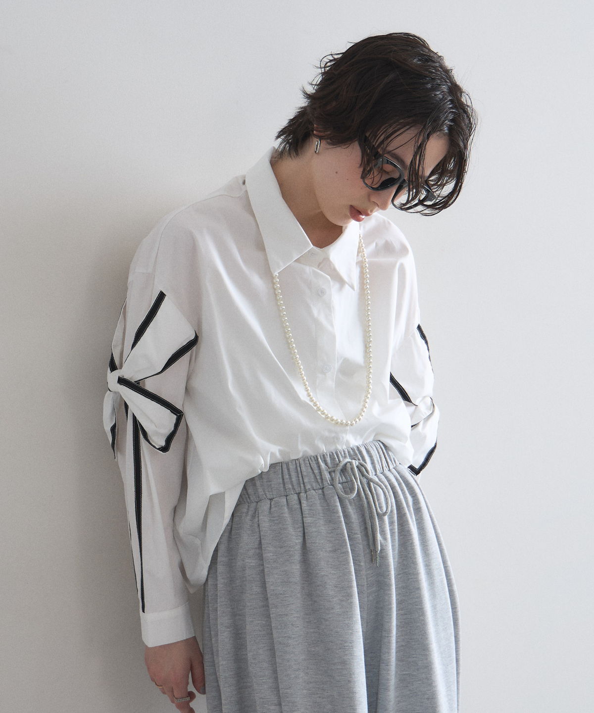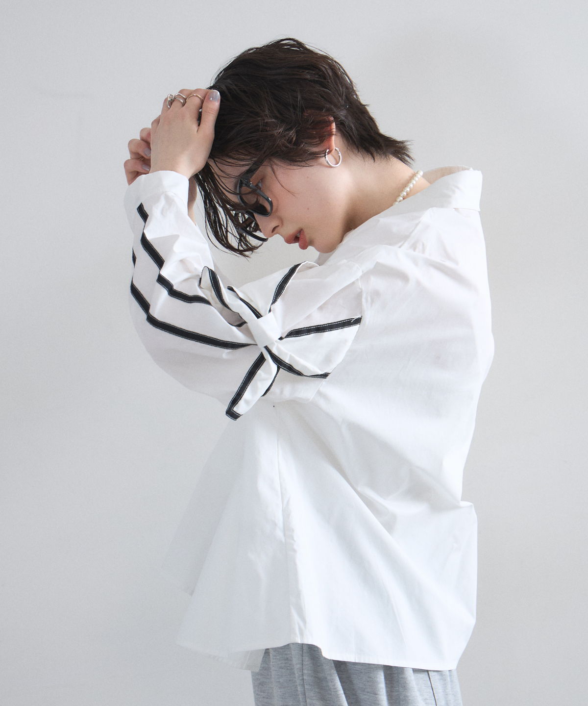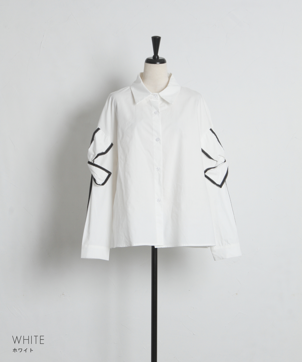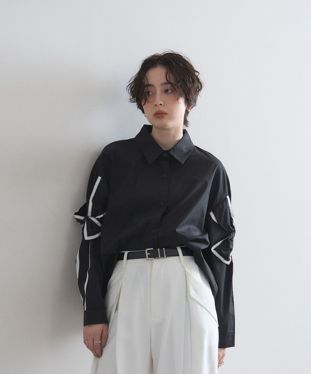 | 商品説明 | : | 袖のリボンデザインが目を惹く、大人可愛い主役級ブラウス。 袖にあしらわれた大胆なバイカラーのリボンモチーフが、1枚で華やかな印象を与えてくれるブラウスです。 ゆったりとしたワイドシルエットで抜け感を出しつつ、クリーンなシャツ襟が上品さをキープ。 モノトーン配色なので甘くなりすぎず、パンツにもスカートにも合わせやすい一着です。 |