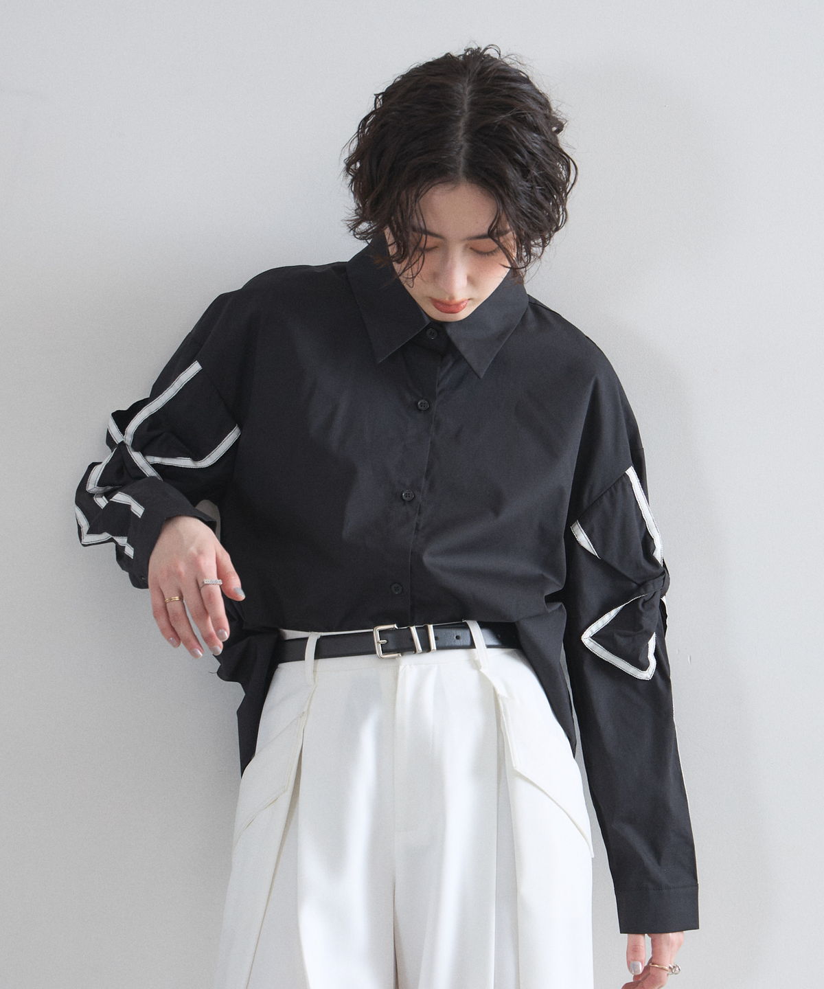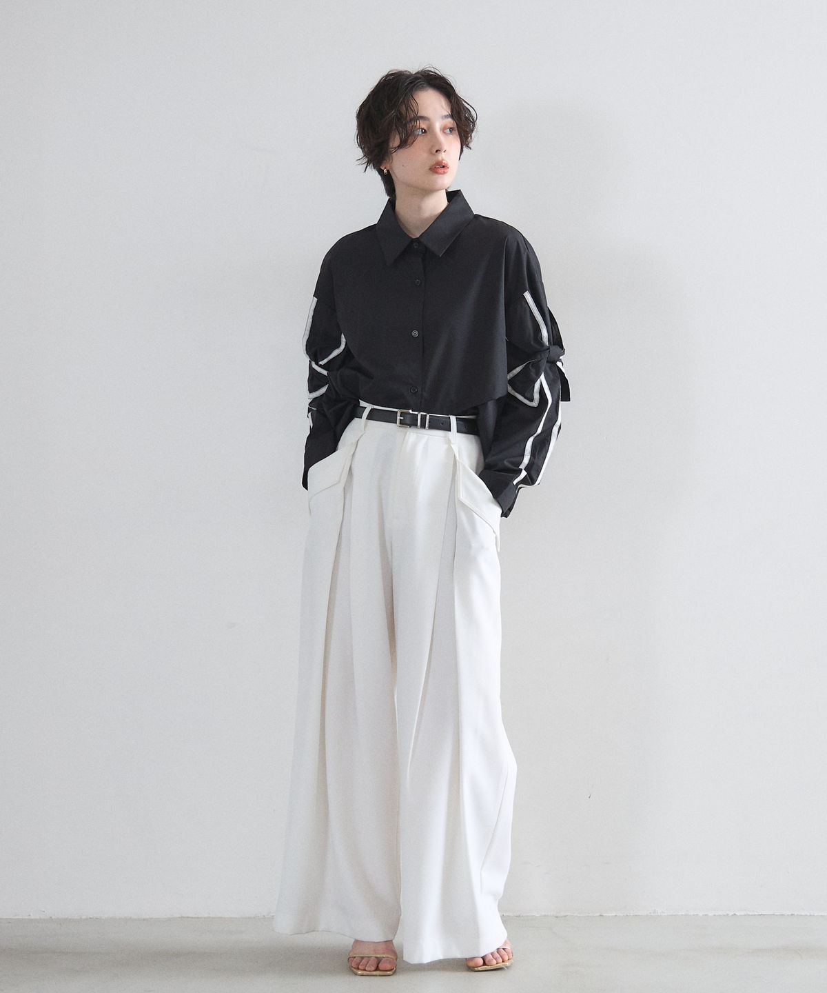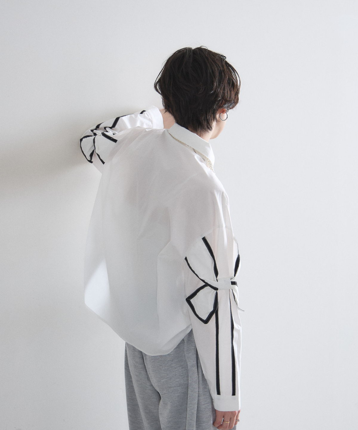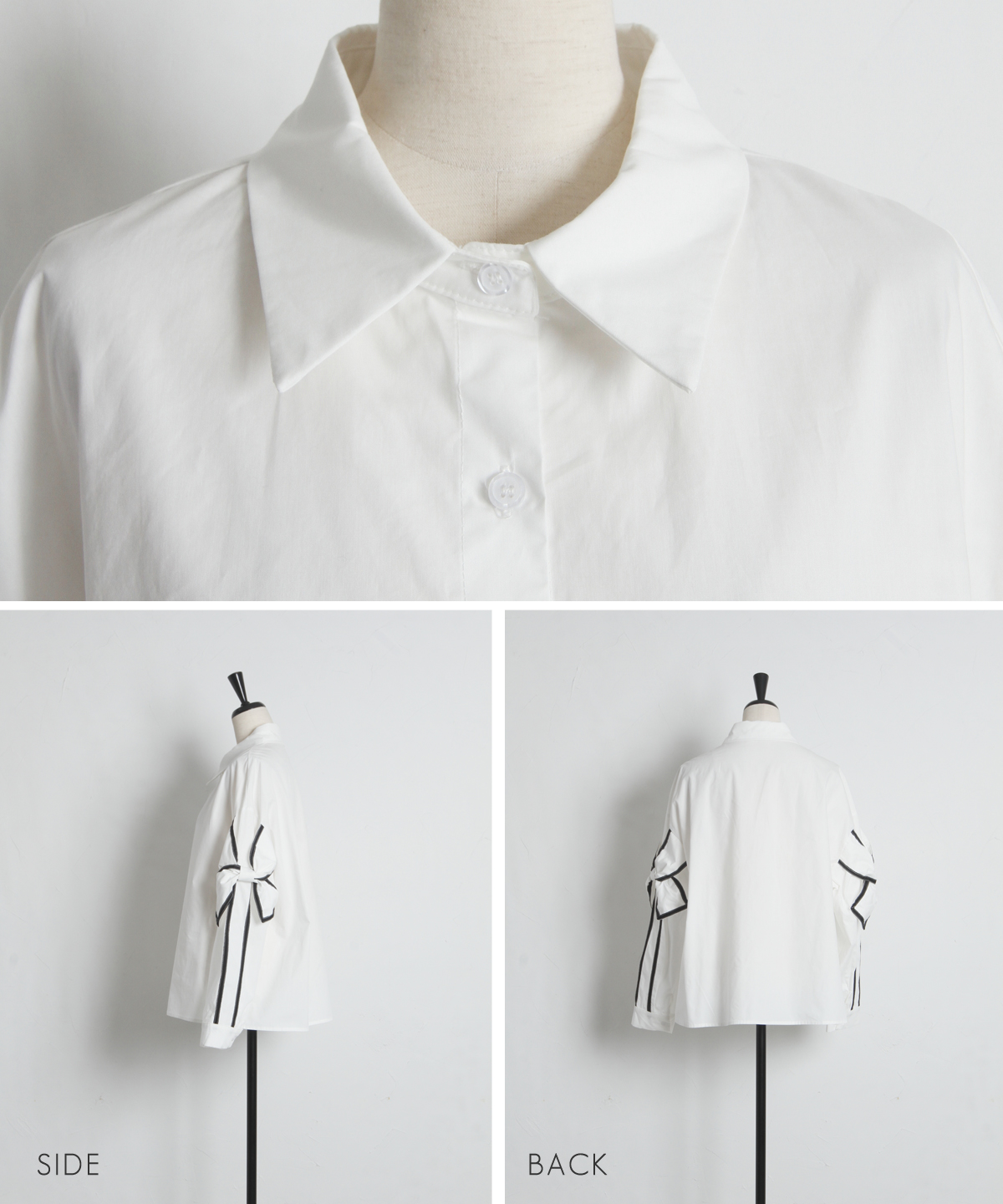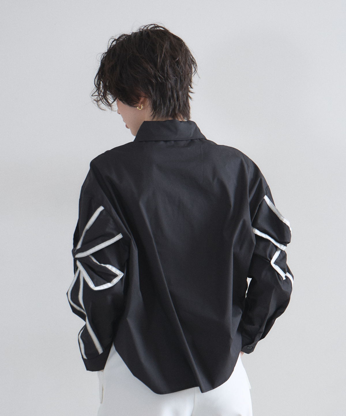 | 商品説明 | : | 袖のリボンデザインが目を惹く、大人可愛い主役級ブラウス。 袖にあしらわれた大胆なバイカラーのリボンモチーフが、1枚で華やかな印象を与えてくれるブラウスです。 ゆったりとしたワイドシルエットで抜け感を出しつつ、クリーンなシャツ襟が上品さをキープ。 モノトーン配色なので甘くなりすぎず、パンツにもスカートにも合わせやすい一着です。 |