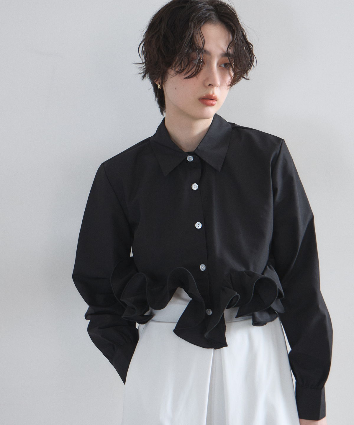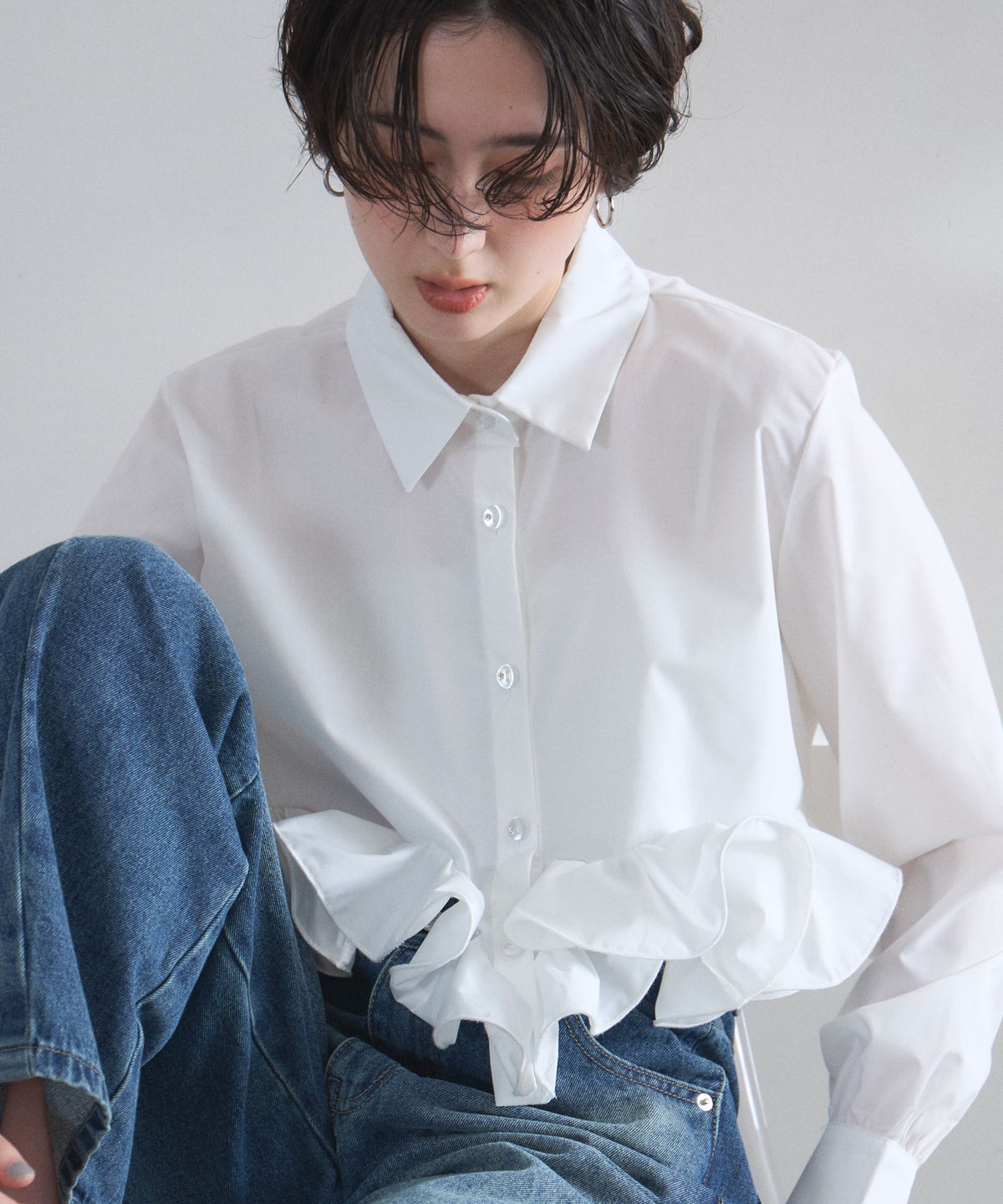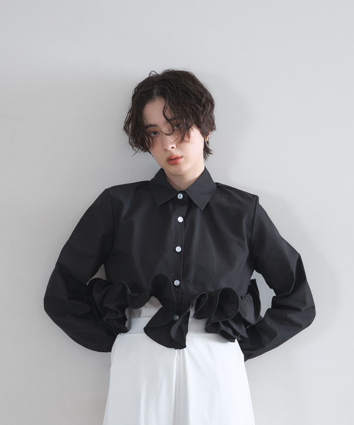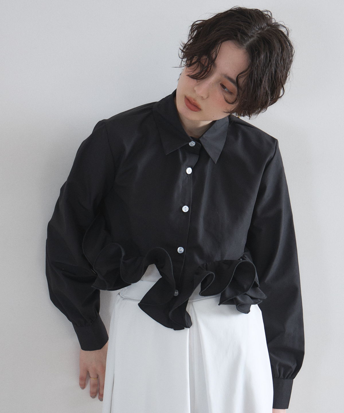 | 商品説明 | : | 裾の立体的なフリルが、モードで甘いアクセントを添えるショートシャツ。 大胆に波打つ裾のフリルデザインが目を引く、存在感たっぷりのブラウスです。 トレンドのクロップド丈(短めの着丈)なので、 ハイウエストのボトムスと合わせるだけでスタイルアップが叶います。 クリーンなシャツ襟とボリューム感のあるフリルのバランスが絶妙で、 日常の装いをクラスアップさせてくれる一着です。 |