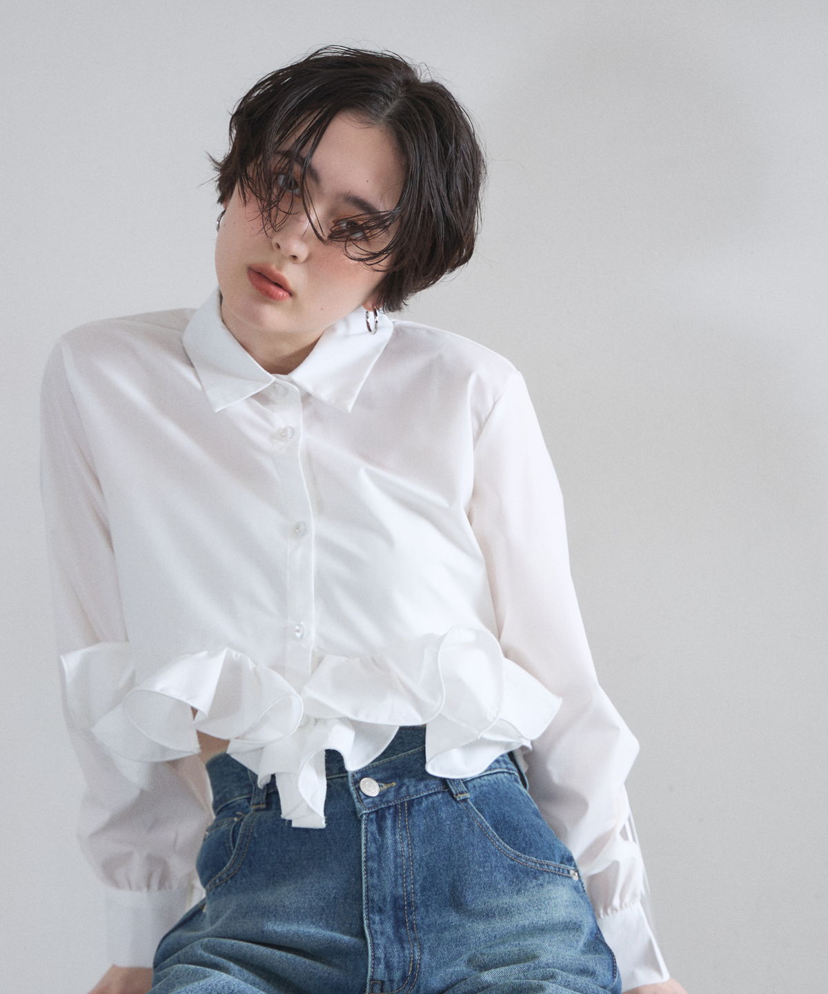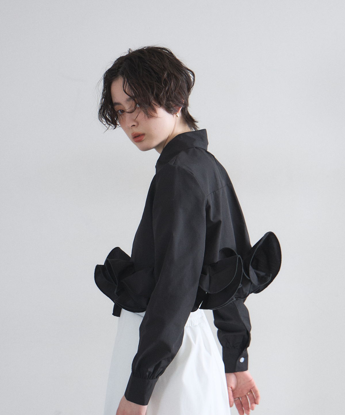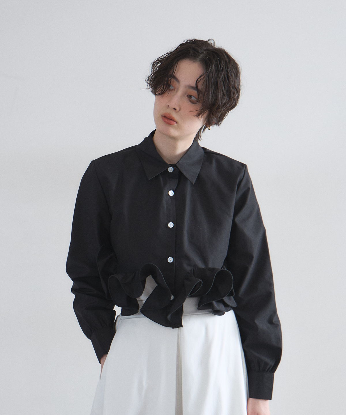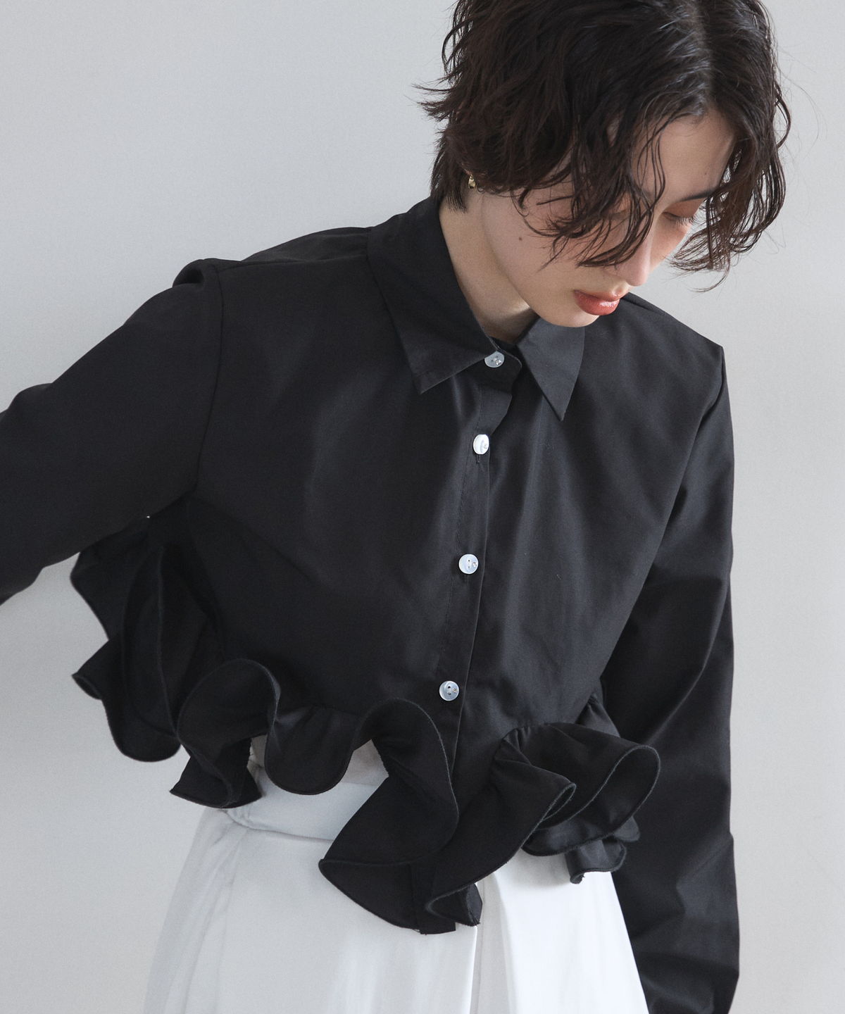 | 商品説明 | : | 裾の立体的なフリルが、モードで甘いアクセントを添えるショートシャツ。 大胆に波打つ裾のフリルデザインが目を引く、存在感たっぷりのブラウスです。 トレンドのクロップド丈(短めの着丈)なので、 ハイウエストのボトムスと合わせるだけでスタイルアップが叶います。 クリーンなシャツ襟とボリューム感のあるフリルのバランスが絶妙で、 日常の装いをクラスアップさせてくれる一着です。 |