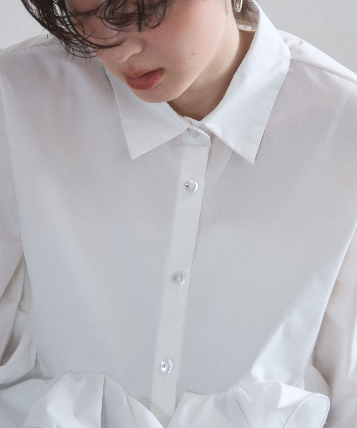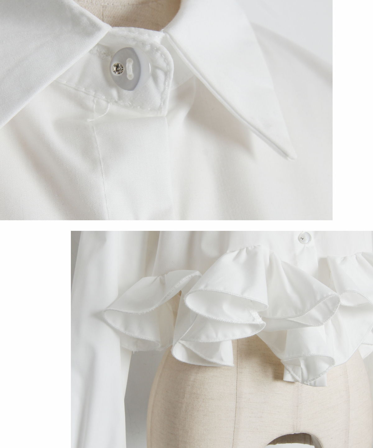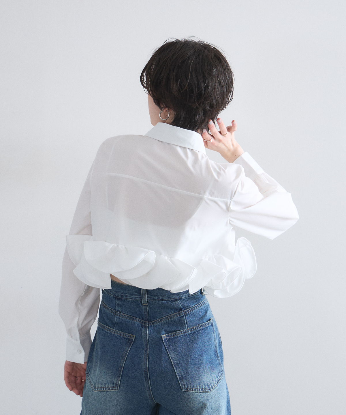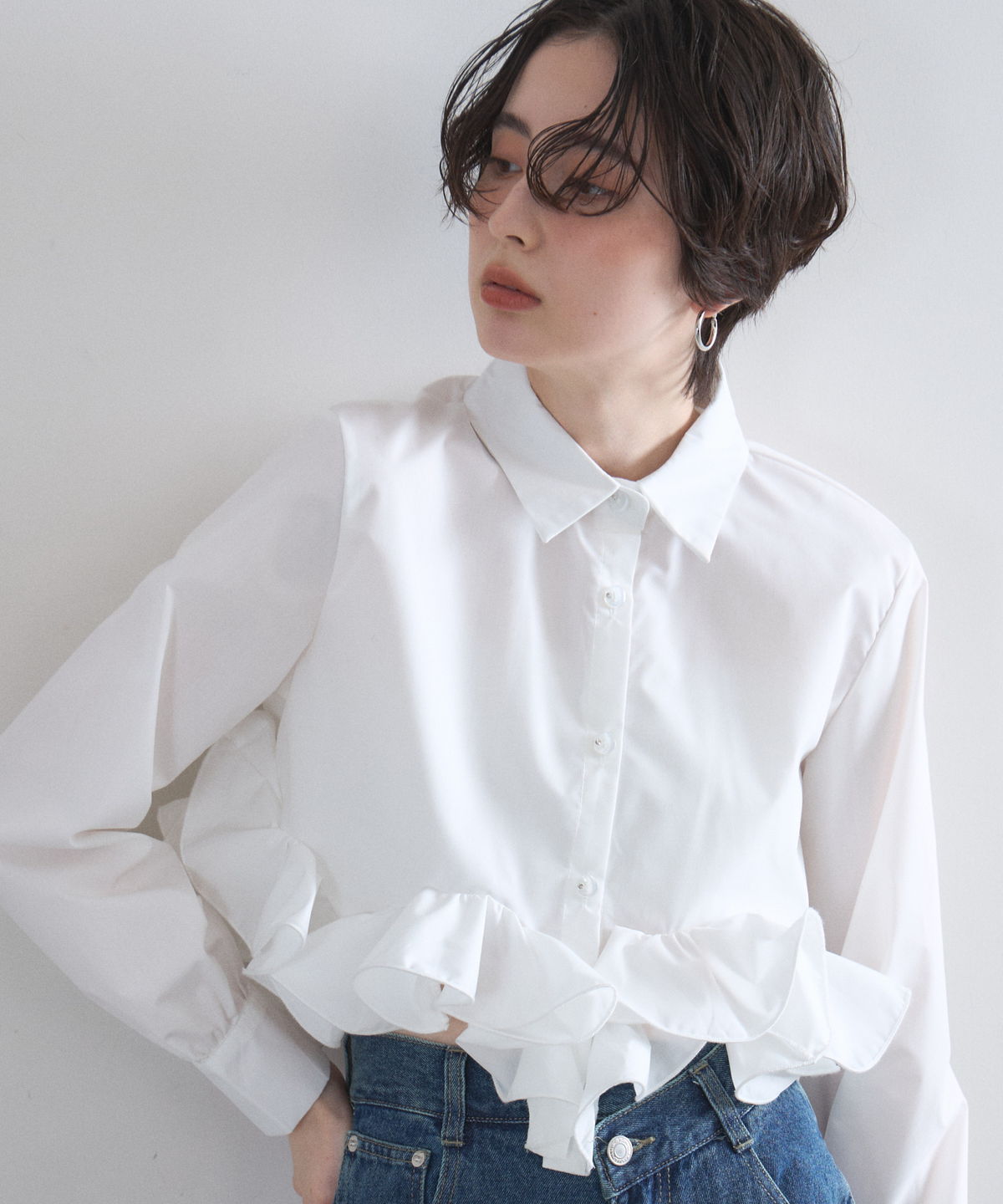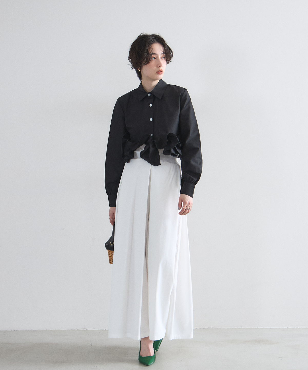 | 商品説明 | : | 裾の立体的なフリルが、モードで甘いアクセントを添えるショートシャツ。 大胆に波打つ裾のフリルデザインが目を引く、存在感たっぷりのブラウスです。 トレンドのクロップド丈(短めの着丈)なので、 ハイウエストのボトムスと合わせるだけでスタイルアップが叶います。 クリーンなシャツ襟とボリューム感のあるフリルのバランスが絶妙で、 日常の装いをクラスアップさせてくれる一着です。 |