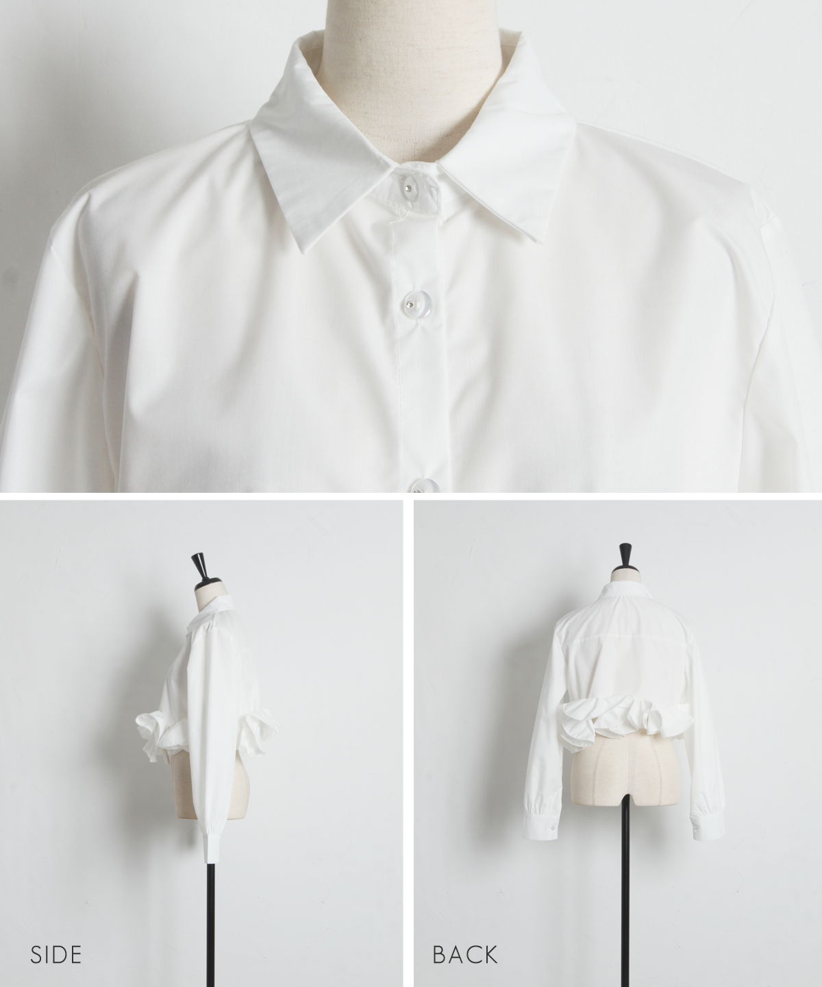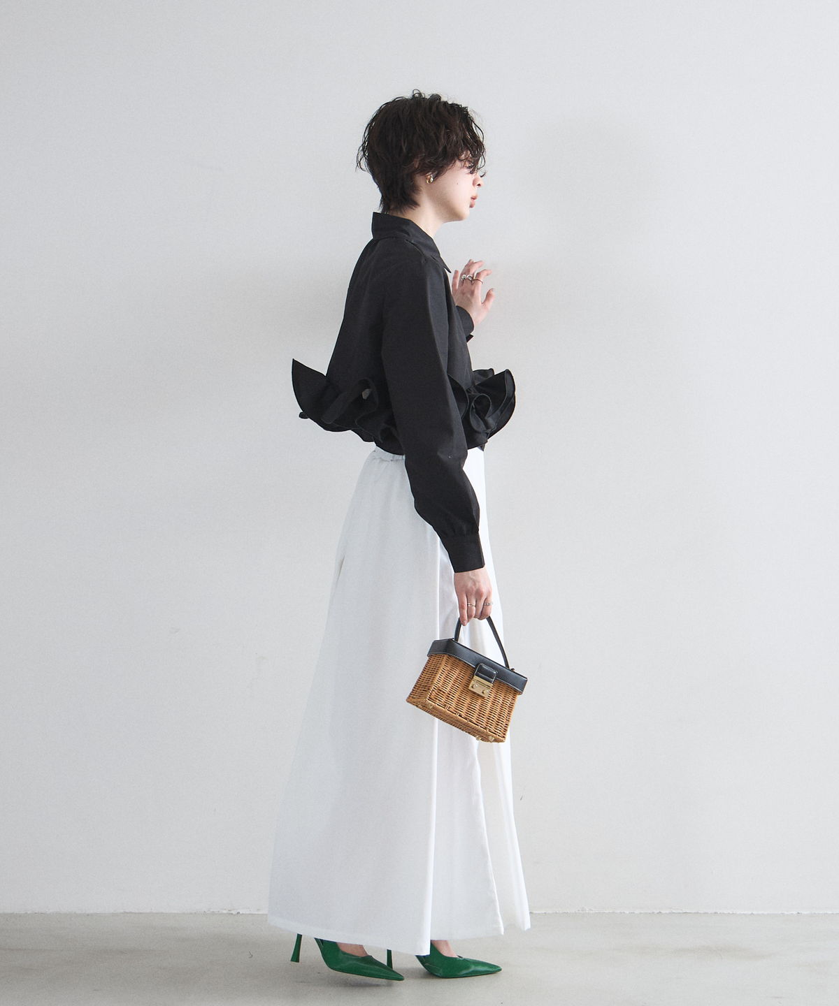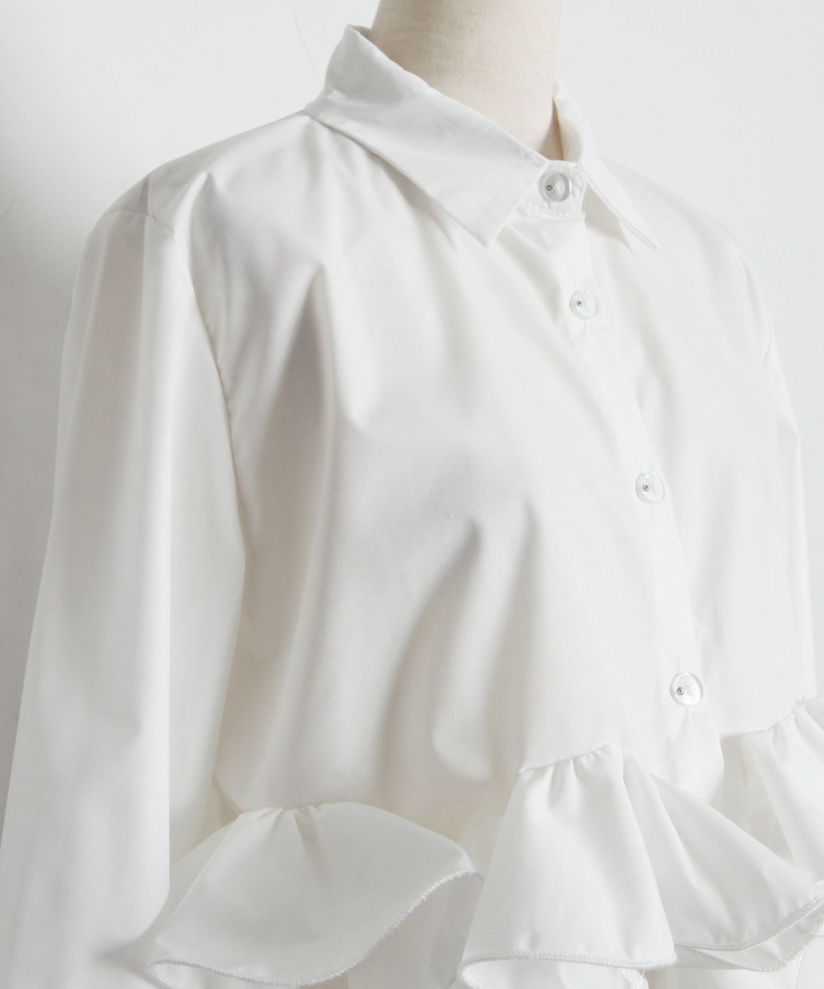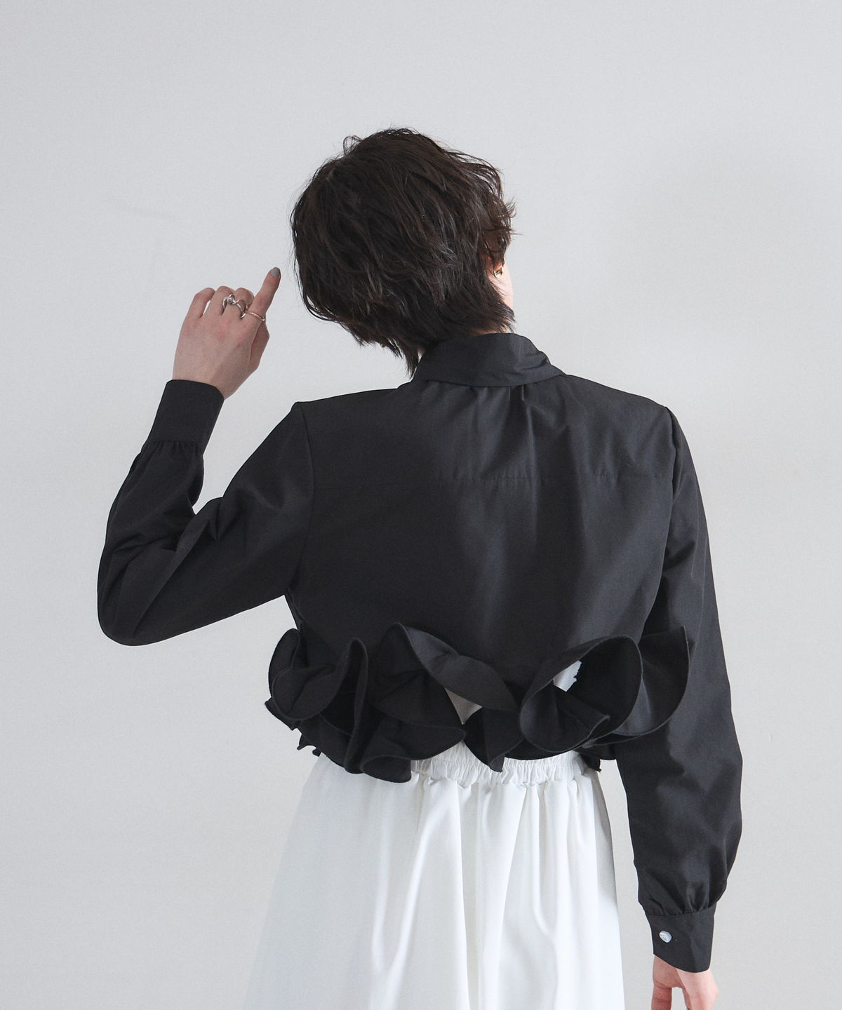 | 商品説明 | : | 裾の立体的なフリルが、モードで甘いアクセントを添えるショートシャツ。 大胆に波打つ裾のフリルデザインが目を引く、存在感たっぷりのブラウスです。 トレンドのクロップド丈(短めの着丈)なので、 ハイウエストのボトムスと合わせるだけでスタイルアップが叶います。 クリーンなシャツ襟とボリューム感のあるフリルのバランスが絶妙で、 日常の装いをクラスアップさせてくれる一着です。 |