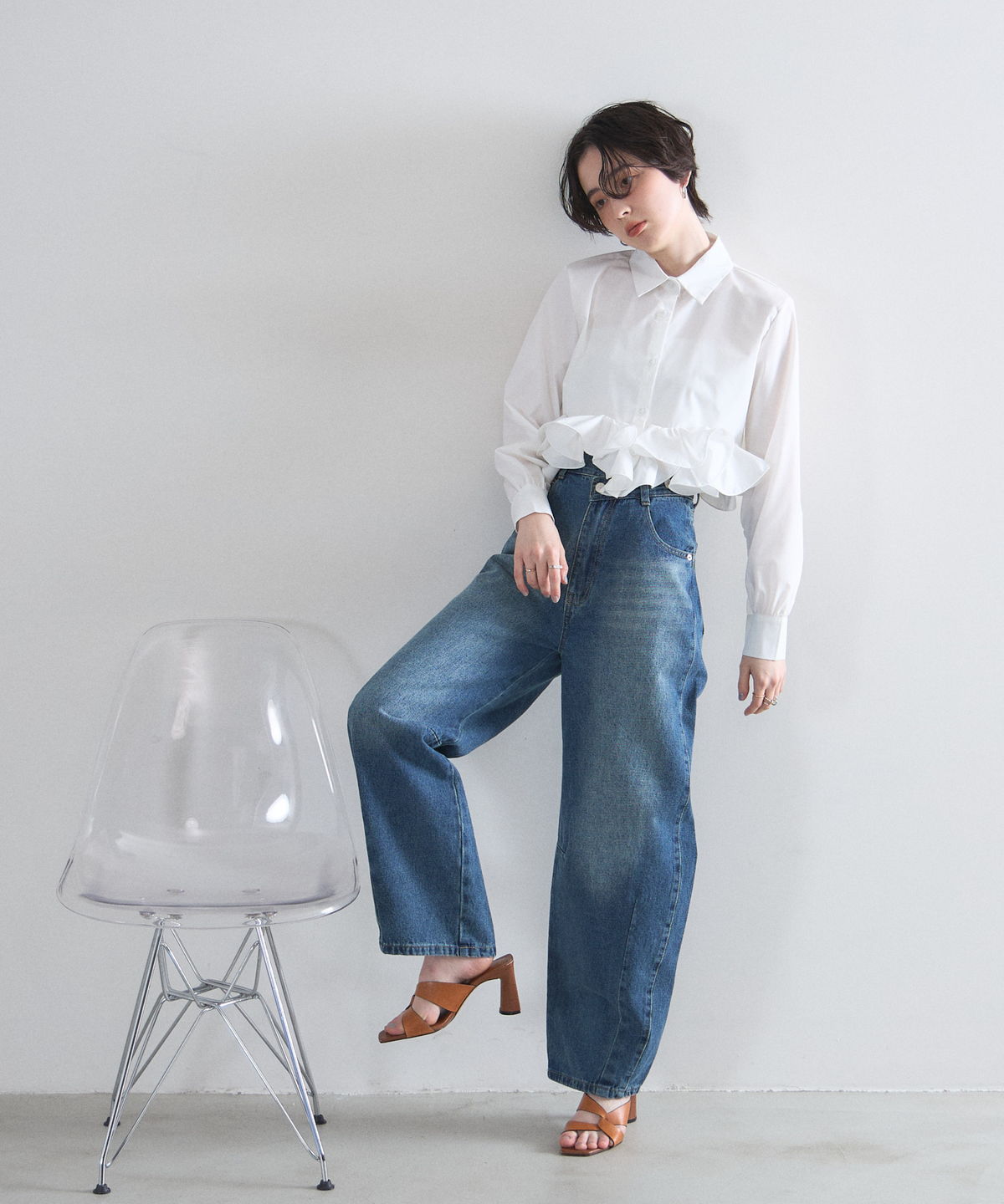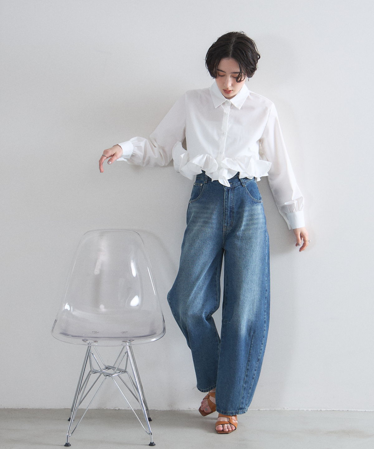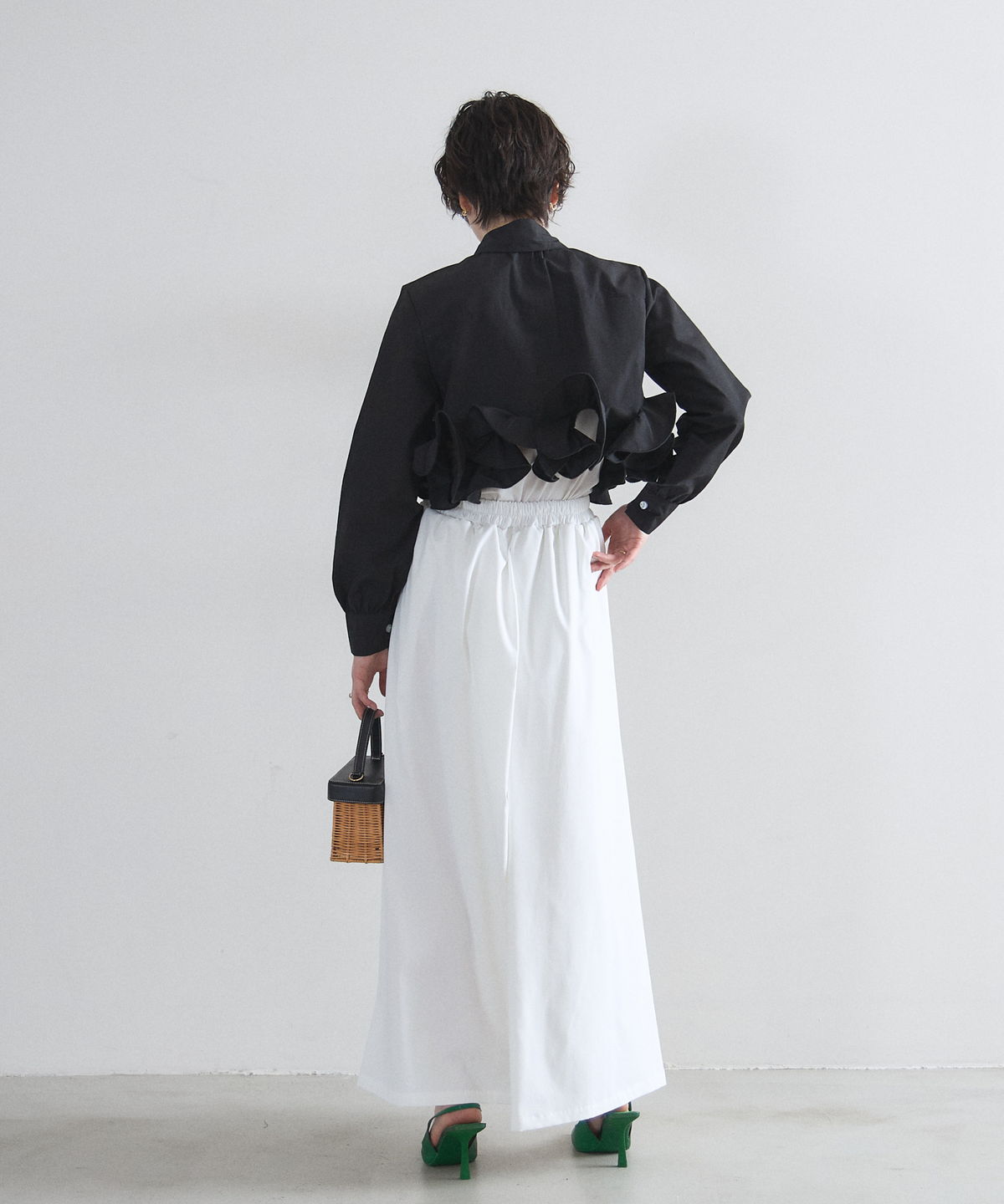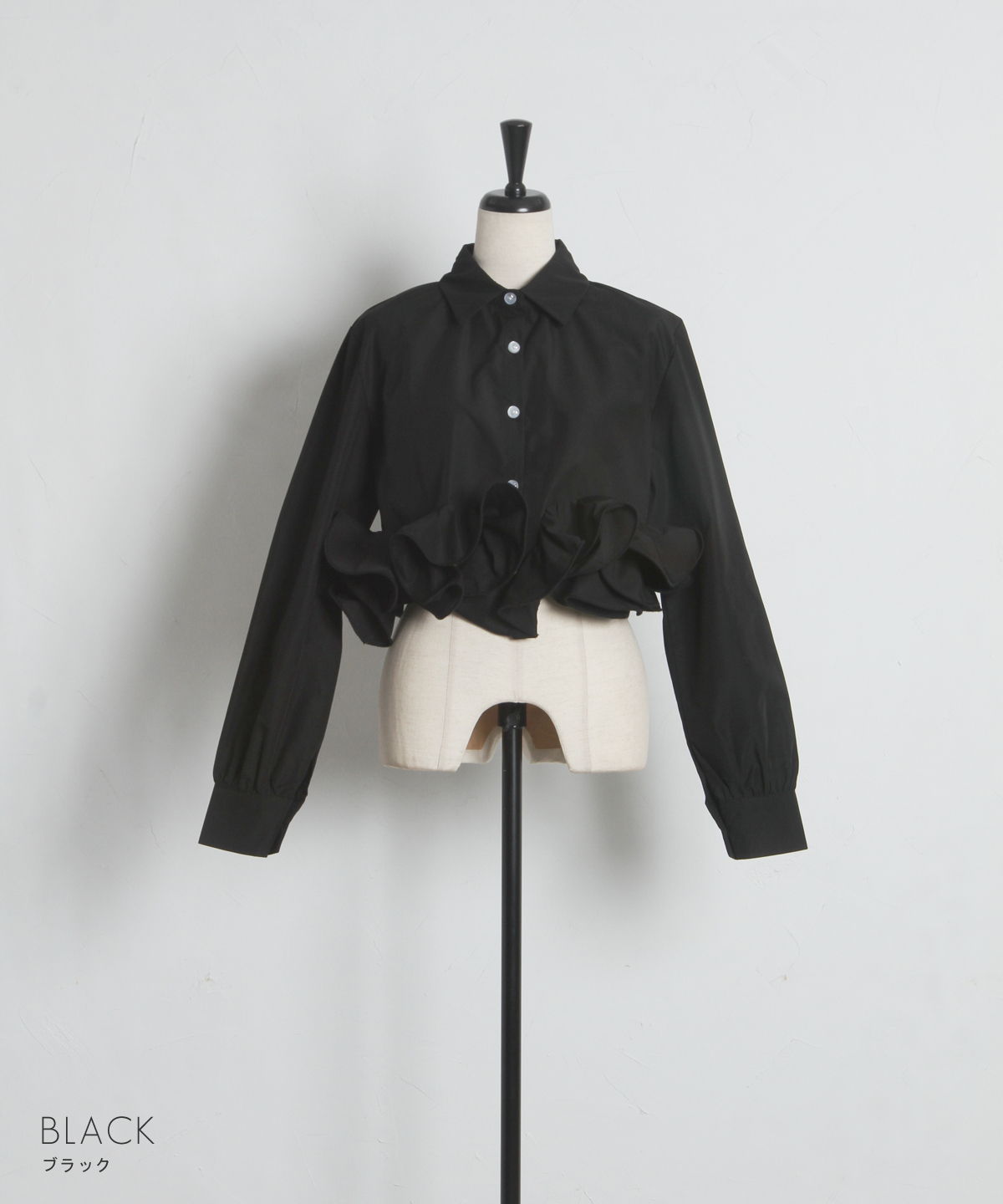 | 商品説明 | : | 裾の立体的なフリルが、モードで甘いアクセントを添えるショートシャツ。 大胆に波打つ裾のフリルデザインが目を引く、存在感たっぷりのブラウスです。 トレンドのクロップド丈(短めの着丈)なので、 ハイウエストのボトムスと合わせるだけでスタイルアップが叶います。 クリーンなシャツ襟とボリューム感のあるフリルのバランスが絶妙で、 日常の装いをクラスアップさせてくれる一着です。 |