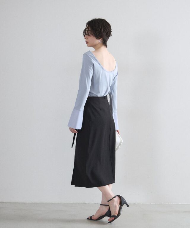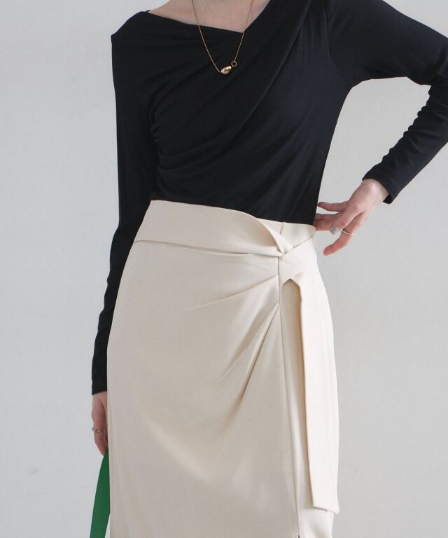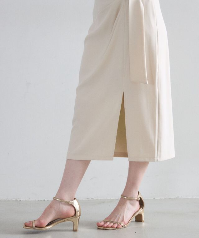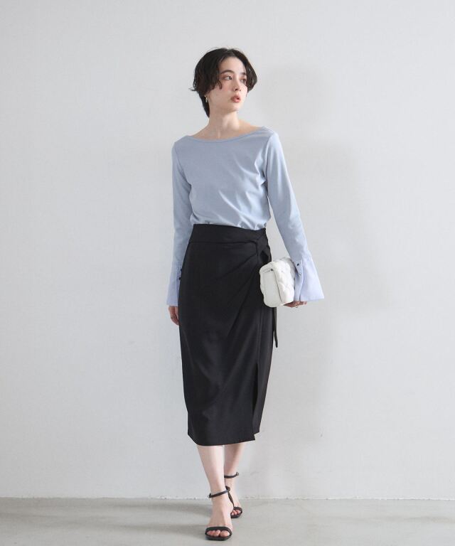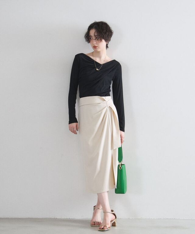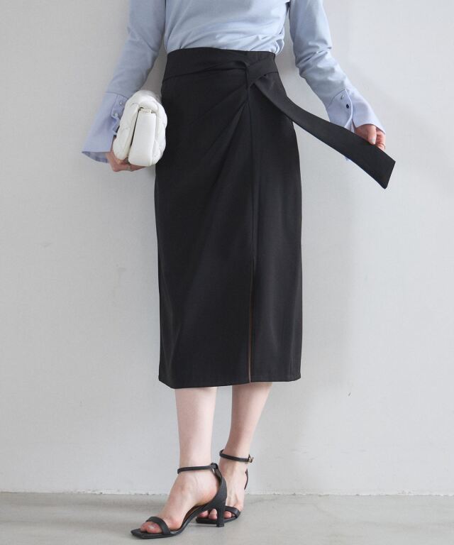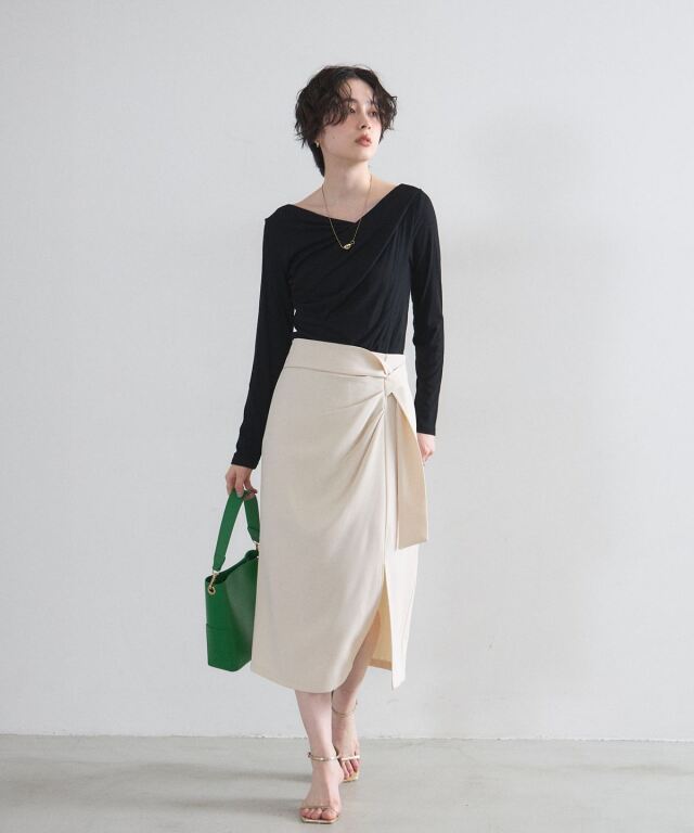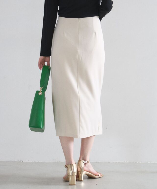 | 商品説明 | : | 洗練されたフロントデザインが、凛とした大人の女性らしさを演出するタイトスカート。 計算されたラップ風のディテールとサイドのタックが、 腰周りをスッキリと見せつつ優雅な動きをプラスします。 オンオフ問わず着回しやすいミディ丈で、シンプルなトップスを合わせるだけで、 都会的で知的なコーディネートが完成する一着です。 |