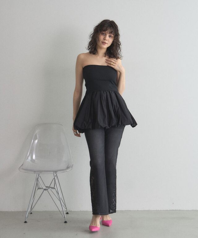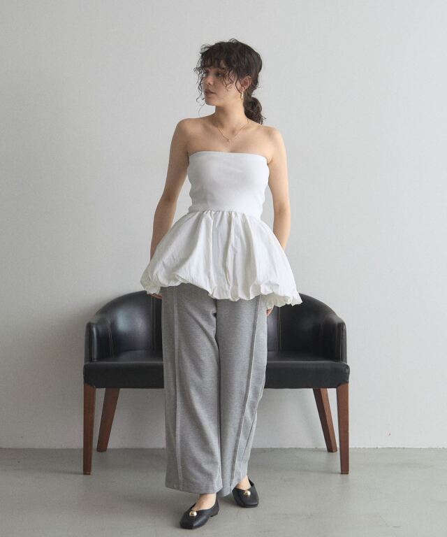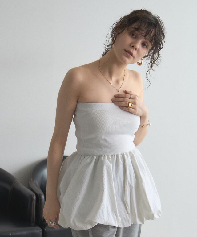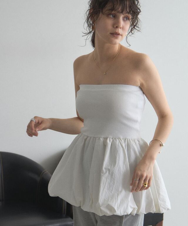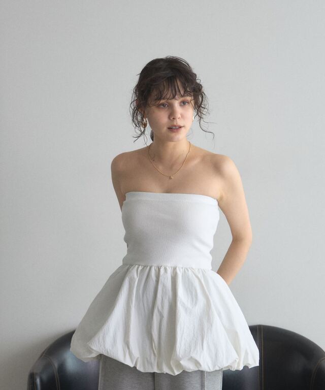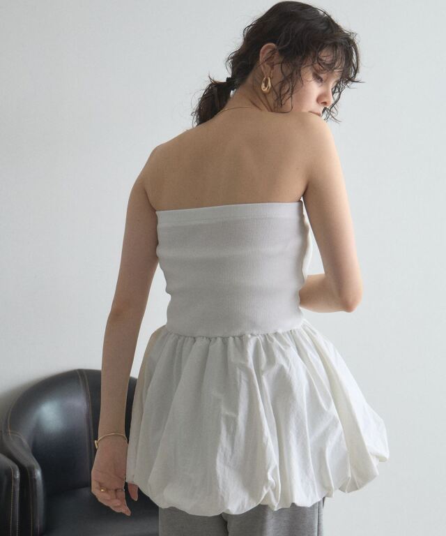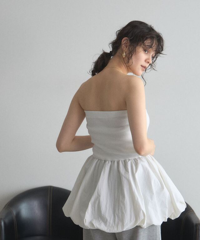 | 商品説明 | : | ふんわりシルエットで華やかに魅せる大人フェミニンな一枚 POINT ・バルーンヘムで動きのある立体的なシルエットを演出 ・ベアトップデザインでデコルテを美しくアピール ・コンパクト丈でハイウエストボトムとも好相性 ・ニットやスウェットにレイヤードするだけで今っぽスタイリングが完成 ・イベントやお出かけコーデの主役になる華やかアイテム |