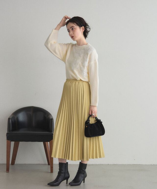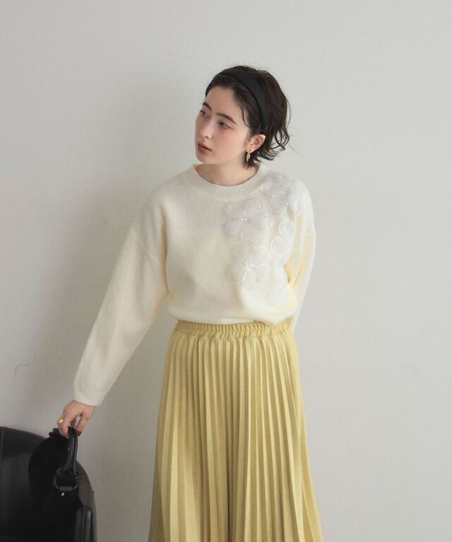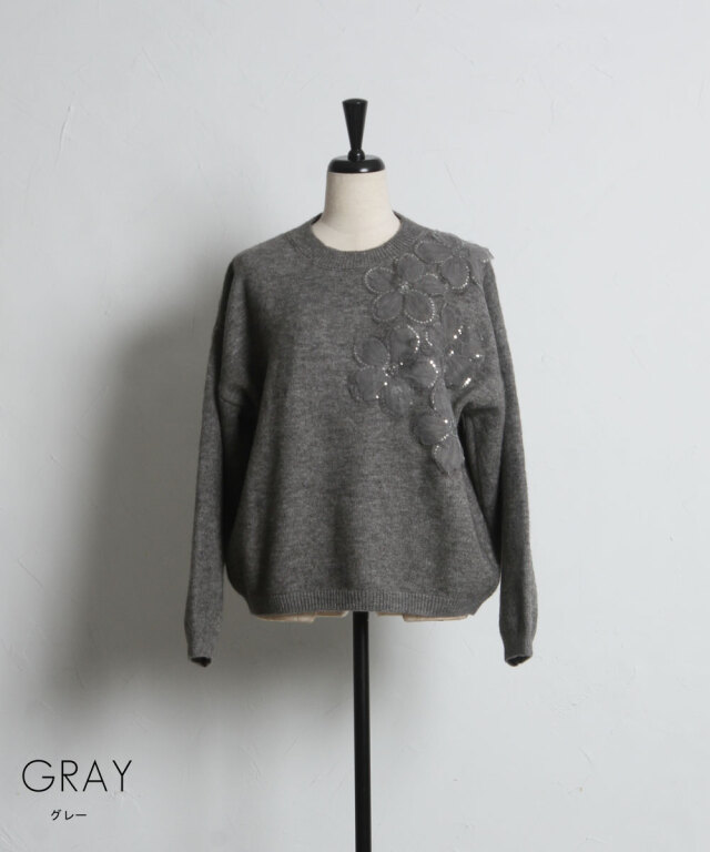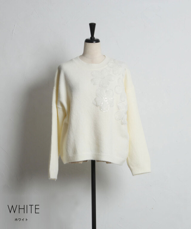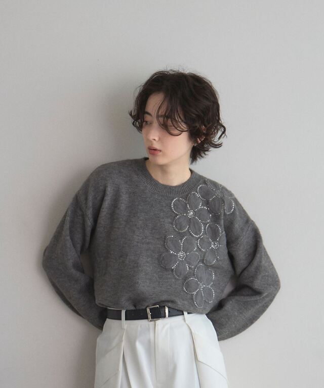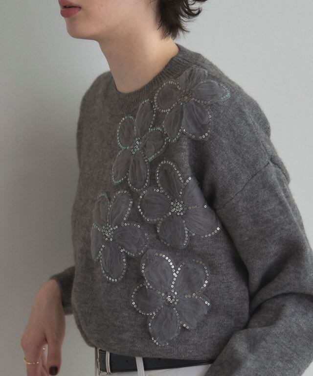| 商品説明 | : | 華やかに咲く、お花とスパンコールが彩る秋冬ニット 胸元や袖にあしらったスパンコール付きのお花モチーフが、フェミニンで華やかな印象を演出。 柔らかな素材感と程よいオーバーサイズで着心地も快適、1枚で着映える存在感があります。 スカートと合わせればフェミニンに、パンツと合わせてカジュアルスタイルにも◎ |