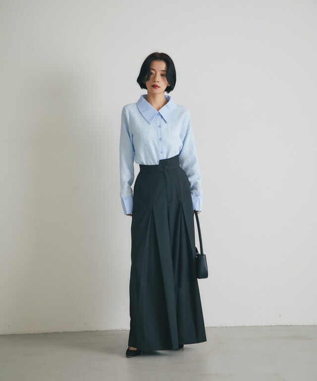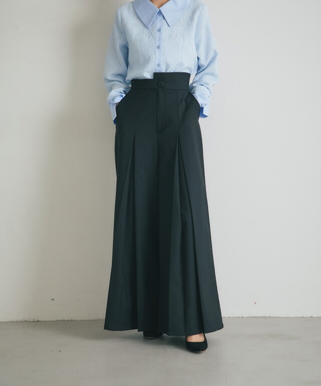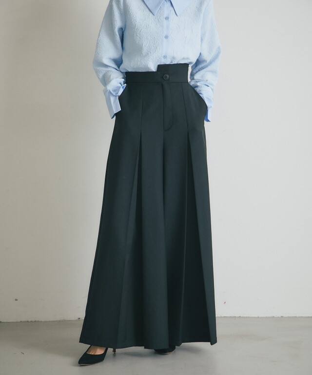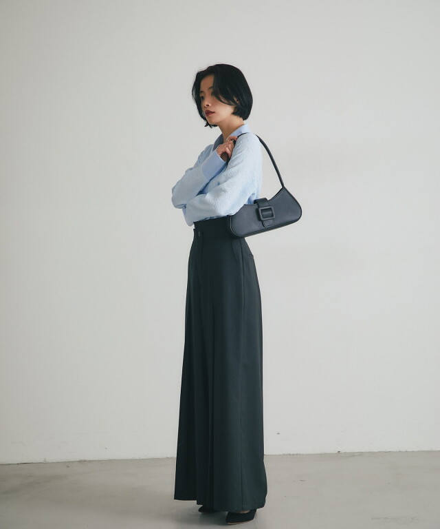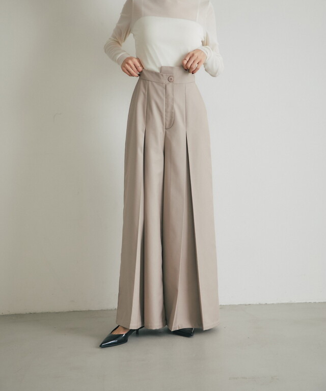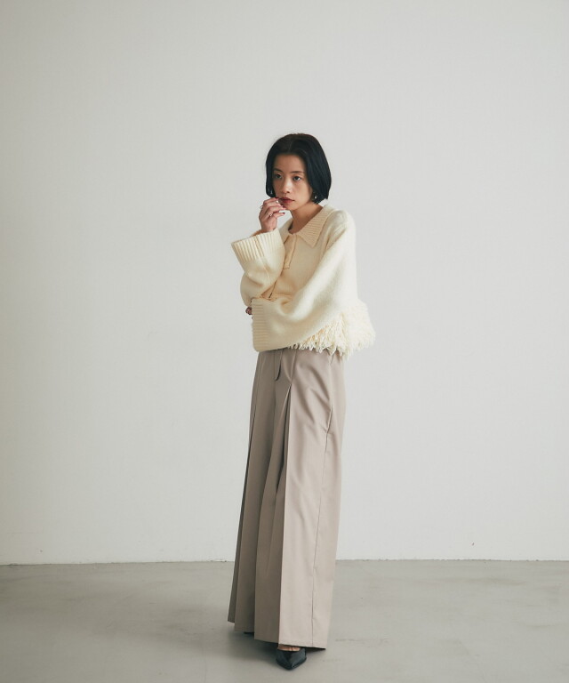 高低差のあるウエストデザインが特徴のエッジプリーツパンツ。 後ろウエストはゴム仕様で、履き心地が快適ながらもフロントはすっきりとした印象に仕上げています。 シャープなプリーツラインが脚を美しく見せ、シンプルなトップスと合わせるだけで都会的で洗練されたスタイルに。 デイリーからオフィスまで、こなれたモードコーデを叶える一枚です。 |