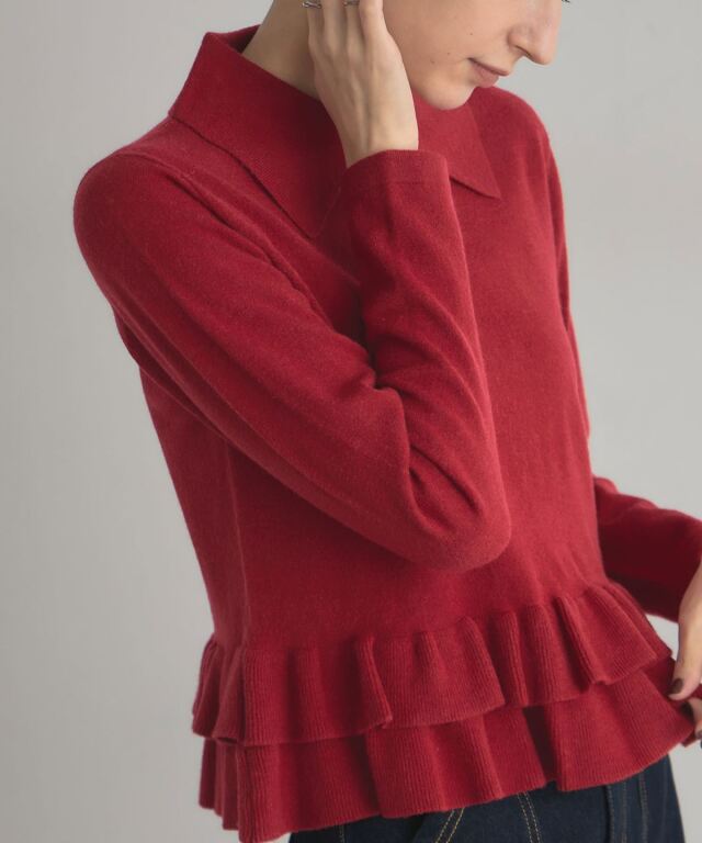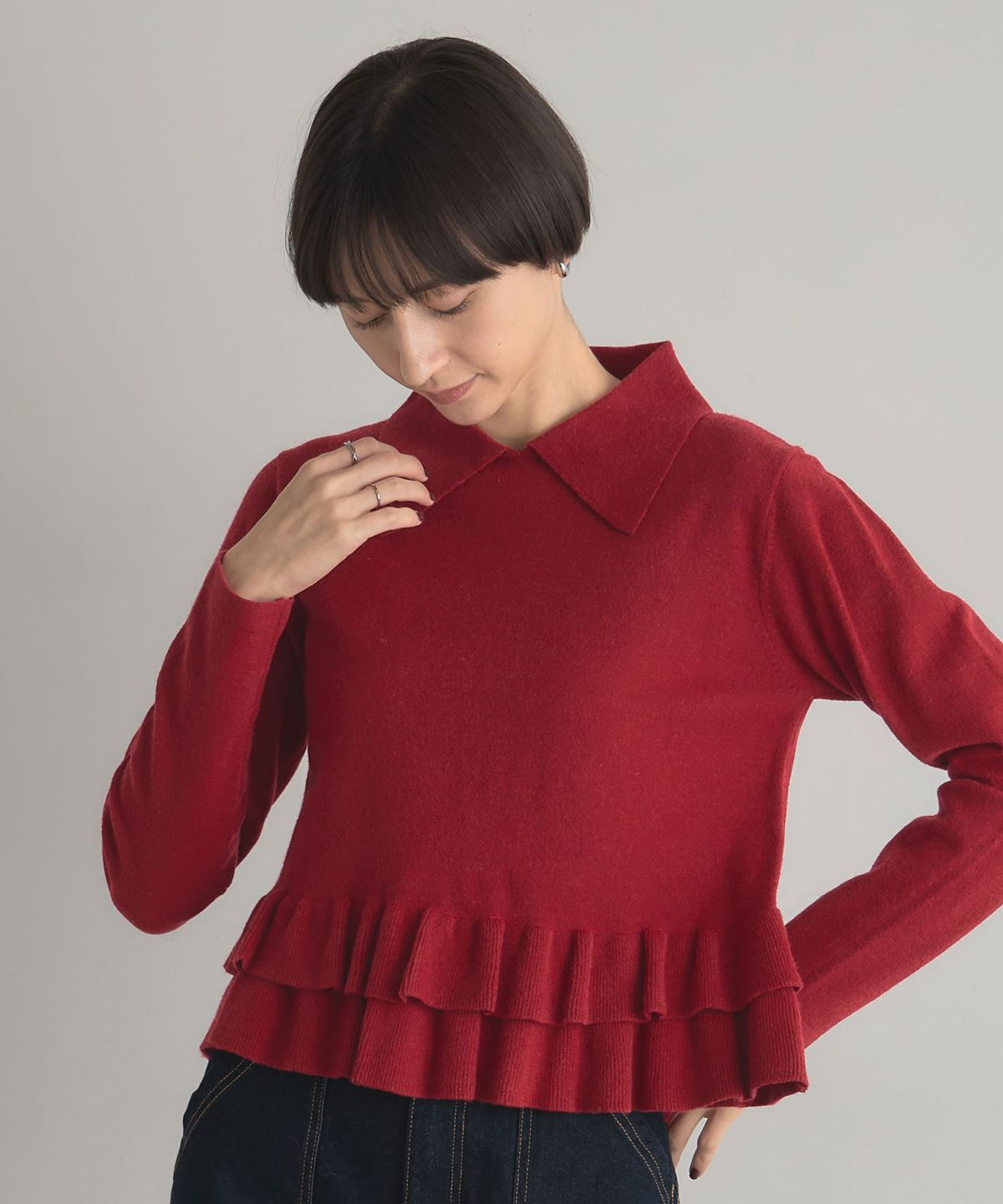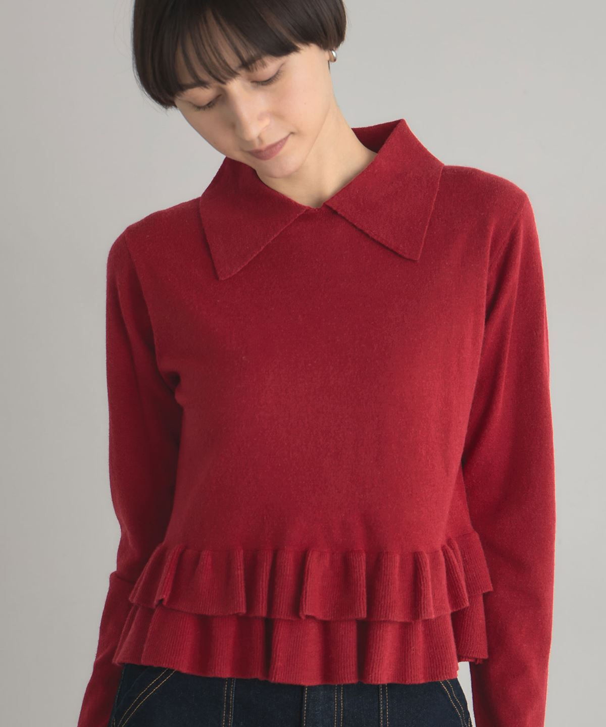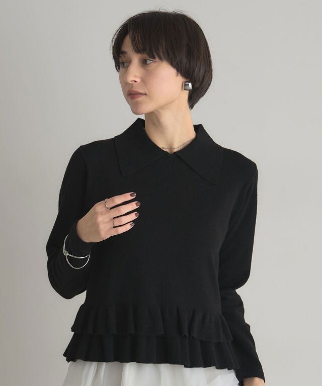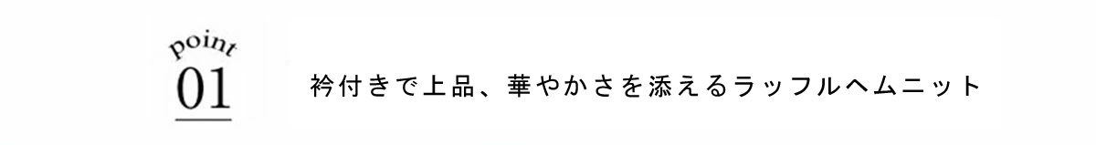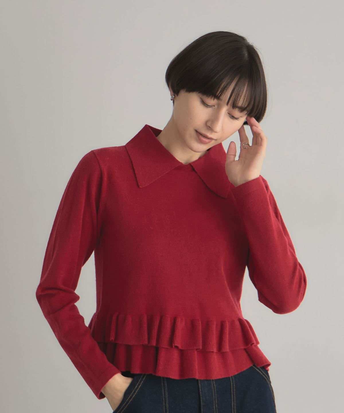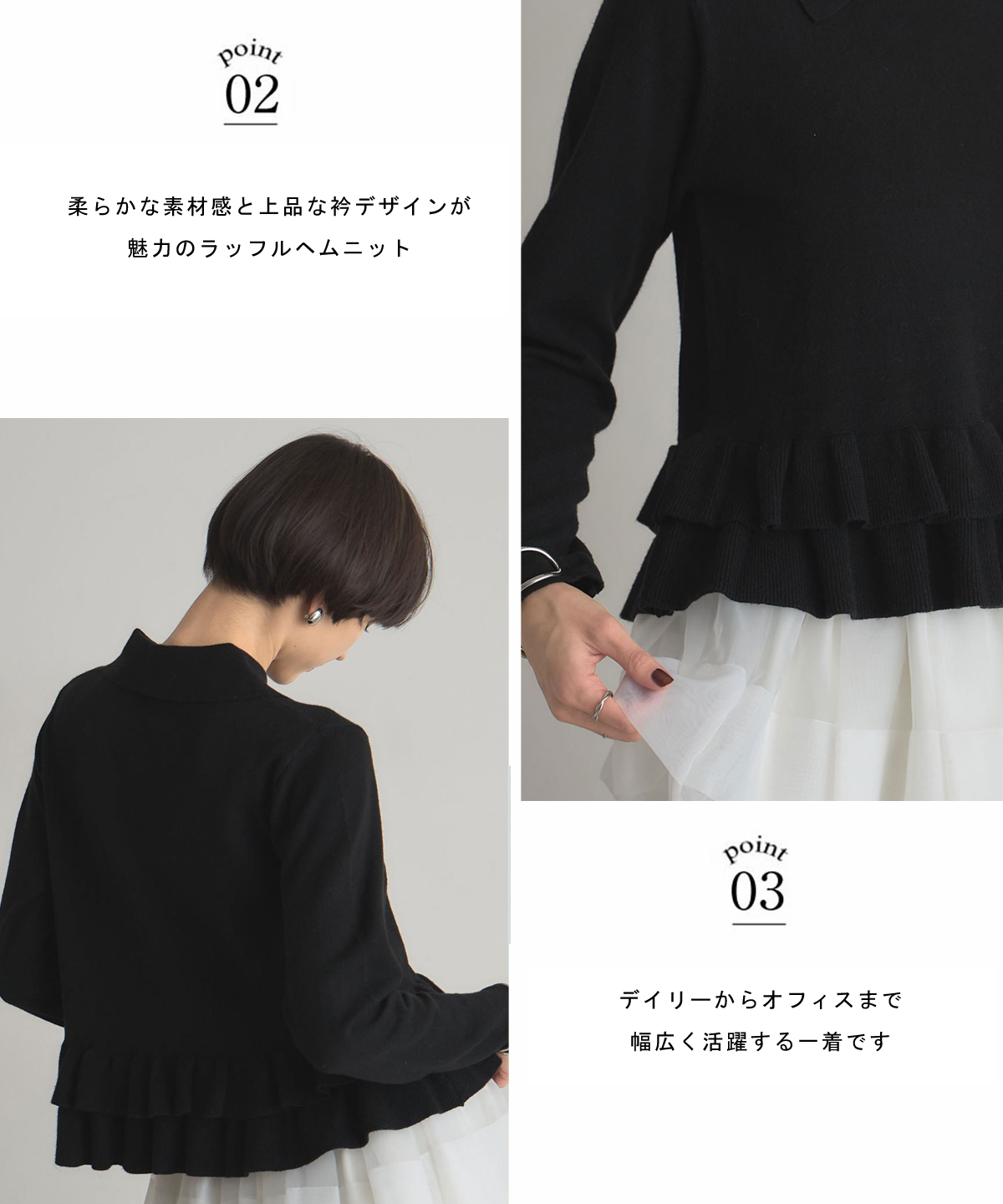 | 商品説明 | : | 衿付きで上品、華やかさを添えるラッフルヘムニット。 柔らかな素材感と上品な衿デザインが魅力のラッフルヘムニット。 裾のラッフルが女性らしい動きをプラスし、シンプルながらも華やかさを演出します。 1枚での着こなしはもちろん、ジャケットとのレイヤードにも最適。 デイリーからオフィスまで幅広く活躍する一着です。 |