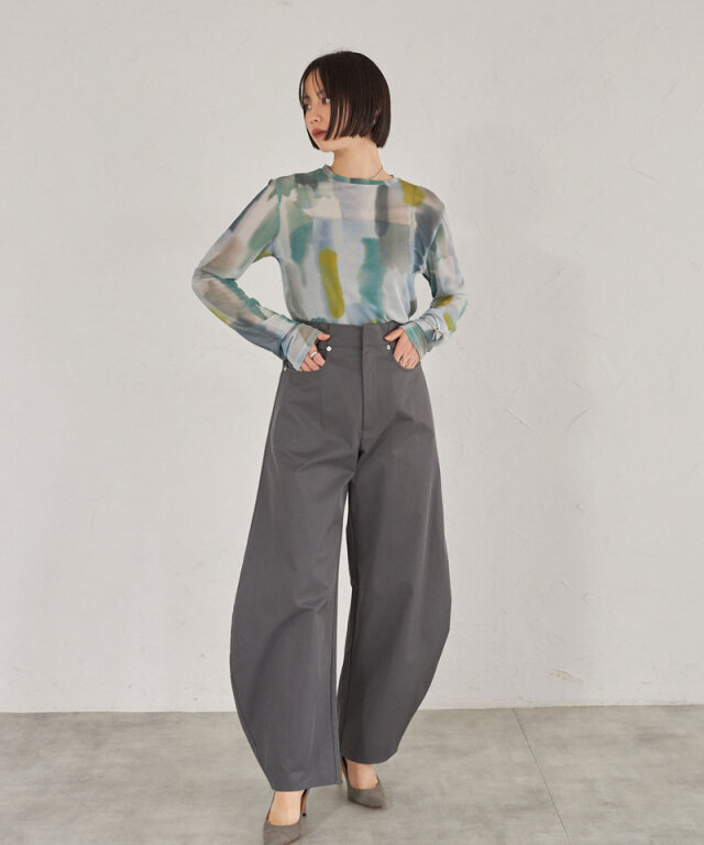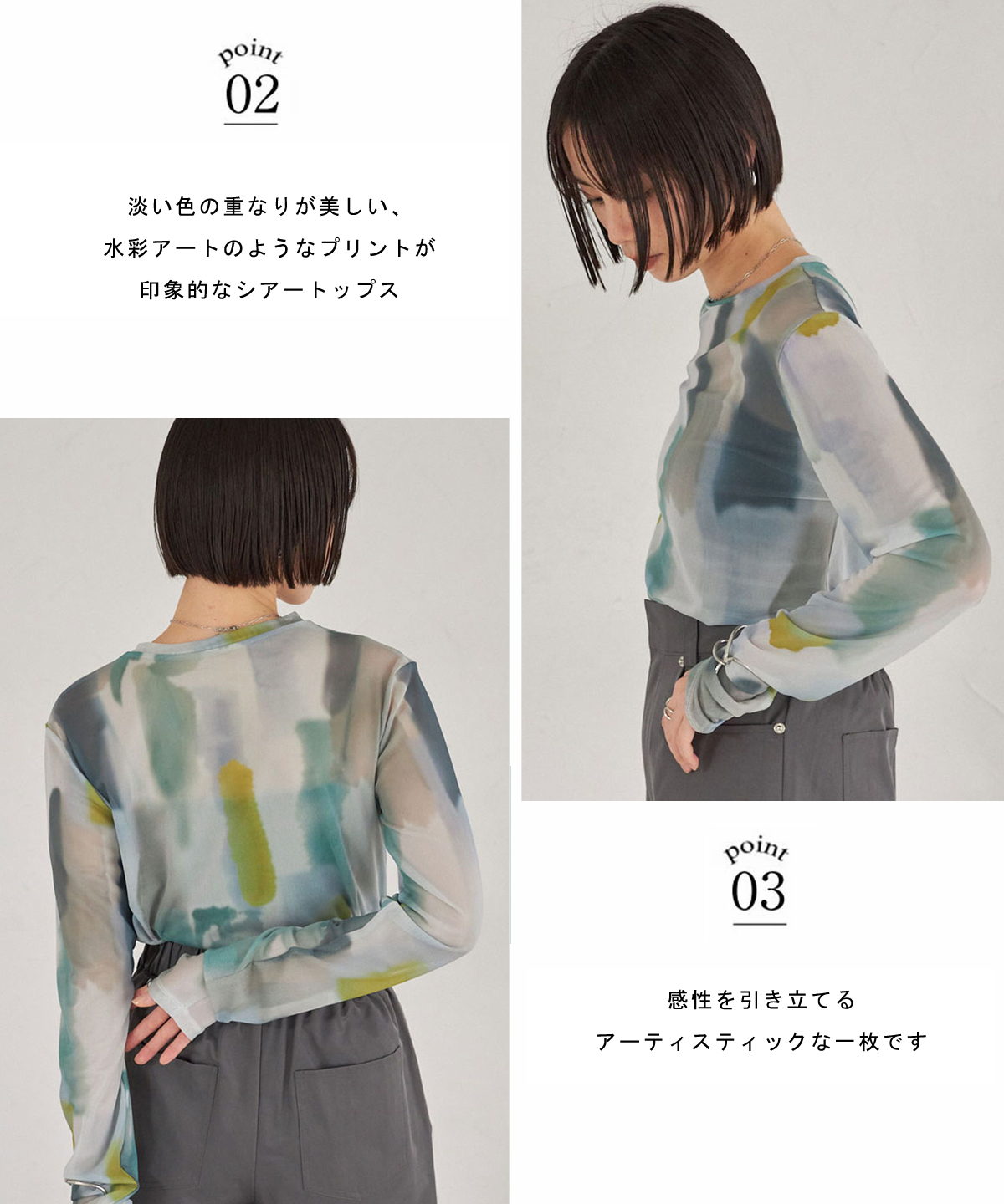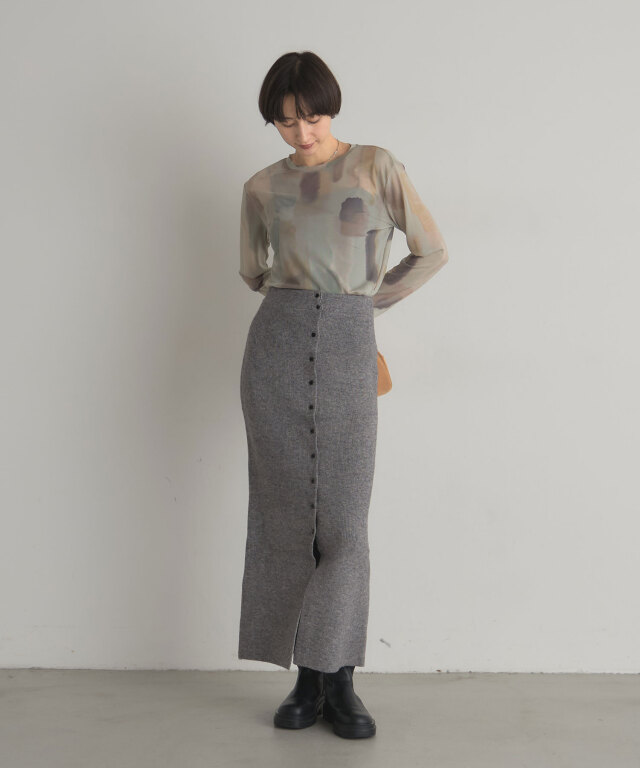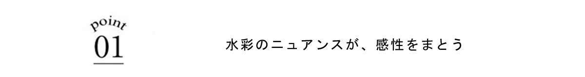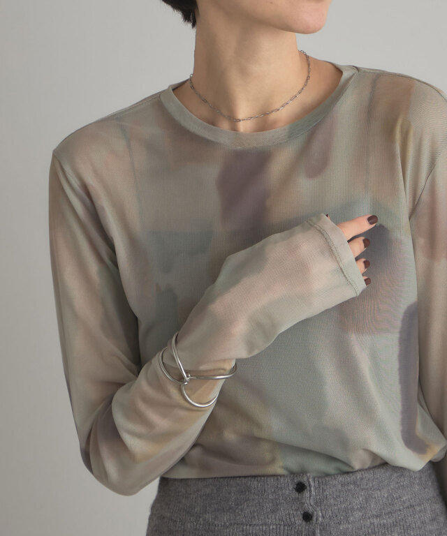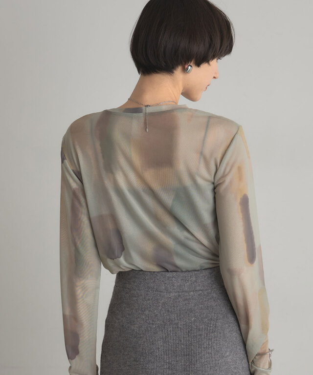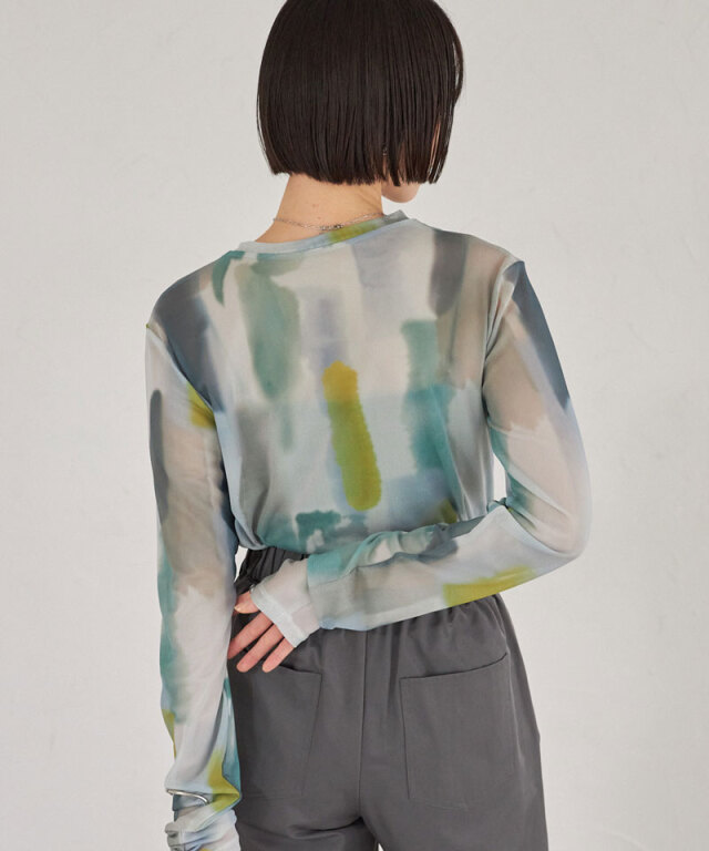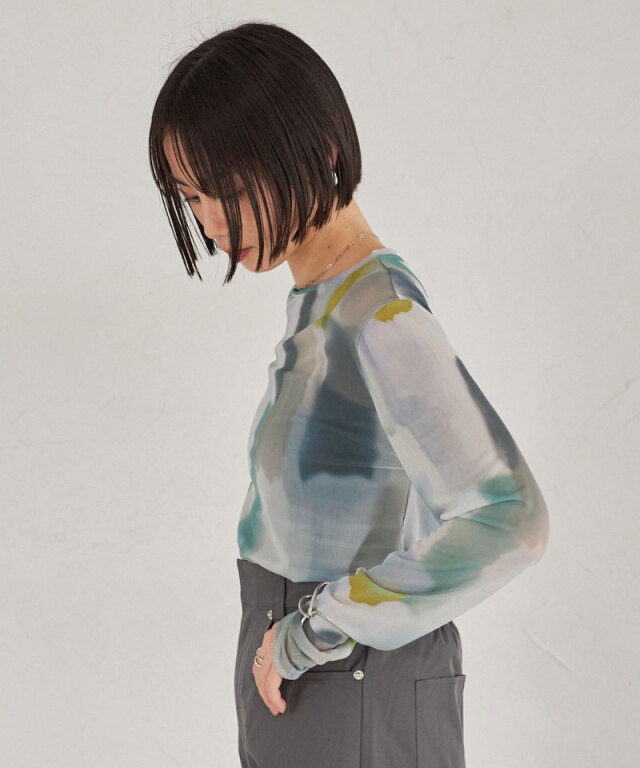 | 商品説明 | : | 水彩のニュアンスが、感性をまとう。 淡い色の重なりが美しい、水彩アートのようなプリントが印象的なシアートップス。 透け感のある軽やかな素材が、スタイリングに抜け感と奥行きをプラスします。 インナー合わせで印象を変えられ、レイヤードにも最適。 感性を引き立てるアーティスティックな一枚です。 |