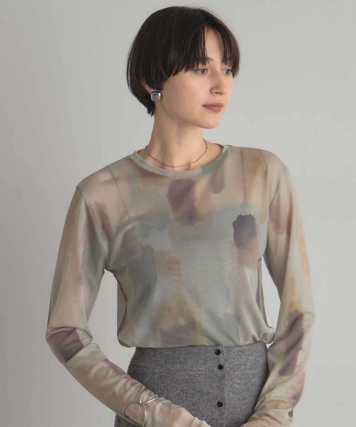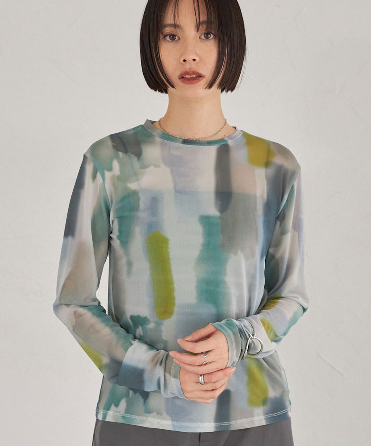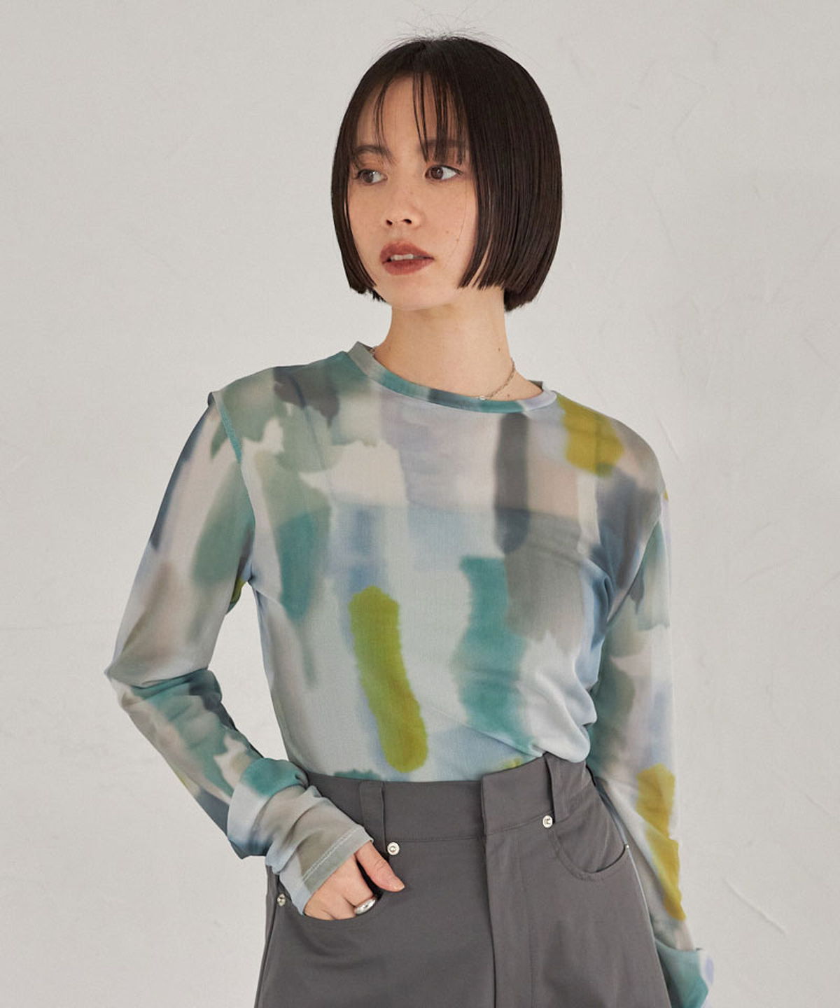 | 商品説明 | : | 水彩のニュアンスが、感性をまとう。 淡い色の重なりが美しい、水彩アートのようなプリントが印象的なシアートップス。 透け感のある軽やかな素材が、スタイリングに抜け感と奥行きをプラスします。 インナー合わせで印象を変えられ、レイヤードにも最適。 感性を引き立てるアーティスティックな一枚です。 |