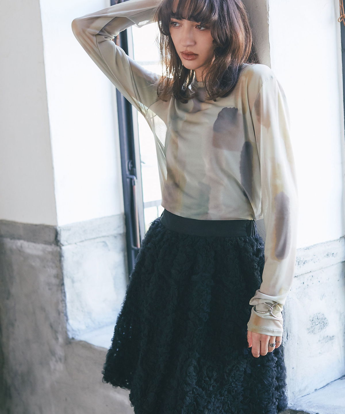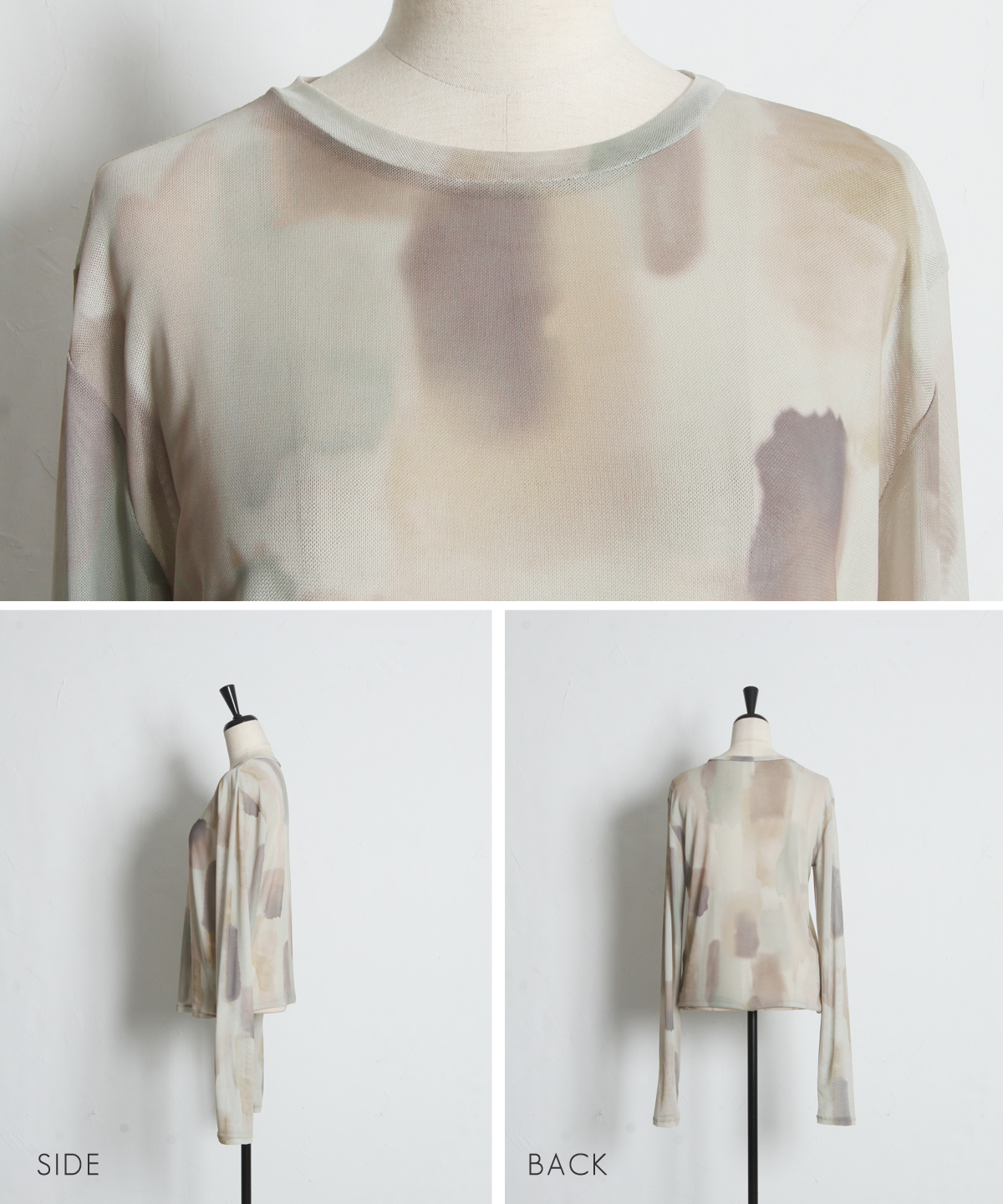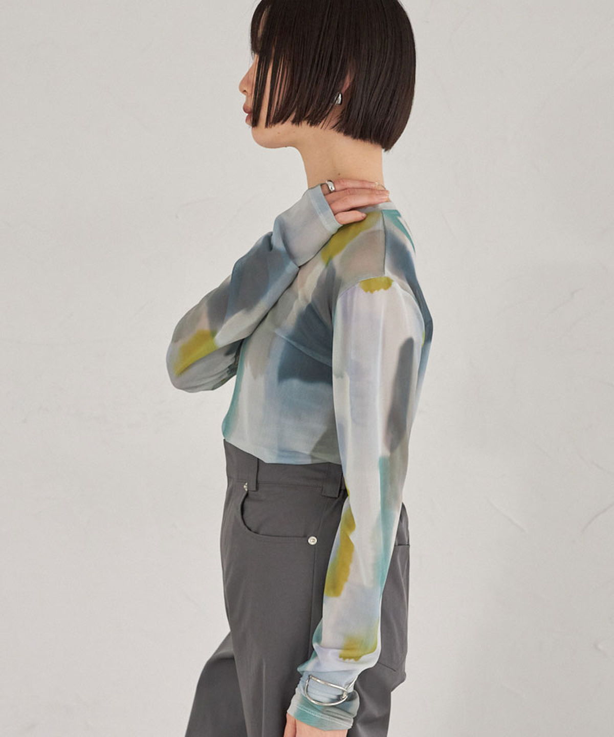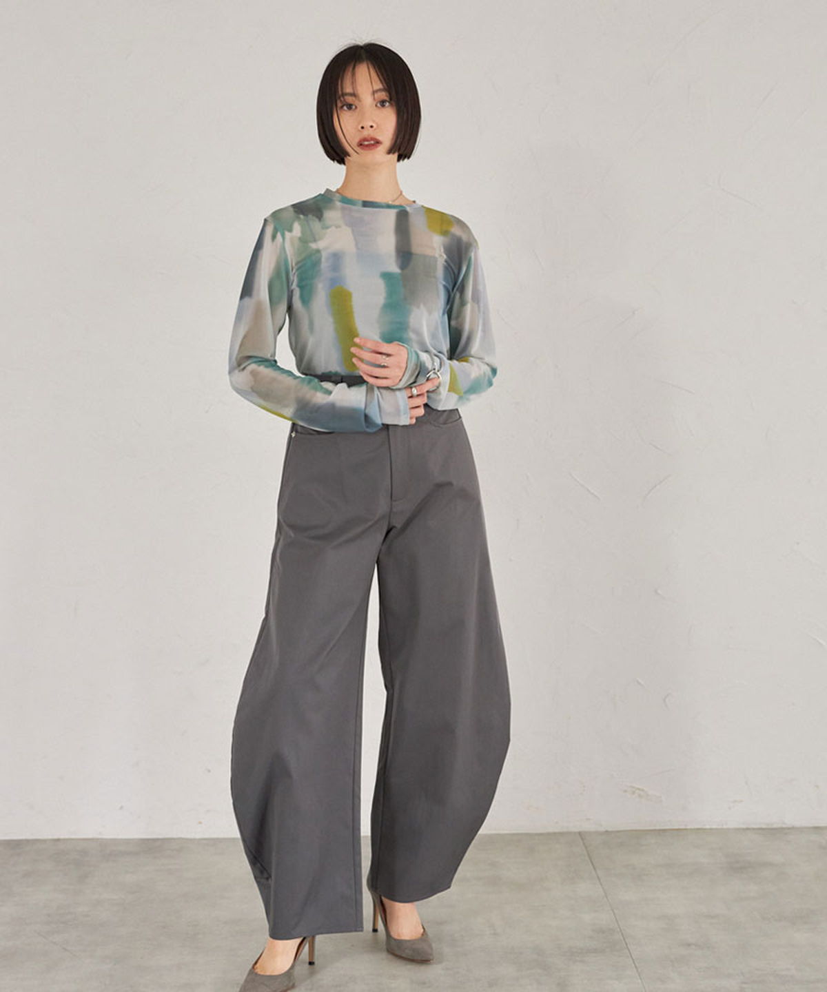 | 商品説明 | : | 水彩のニュアンスが、感性をまとう。 淡い色の重なりが美しい、水彩アートのようなプリントが印象的なシアートップス。 透け感のある軽やかな素材が、スタイリングに抜け感と奥行きをプラスします。 インナー合わせで印象を変えられ、レイヤードにも最適。 感性を引き立てるアーティスティックな一枚です。 |