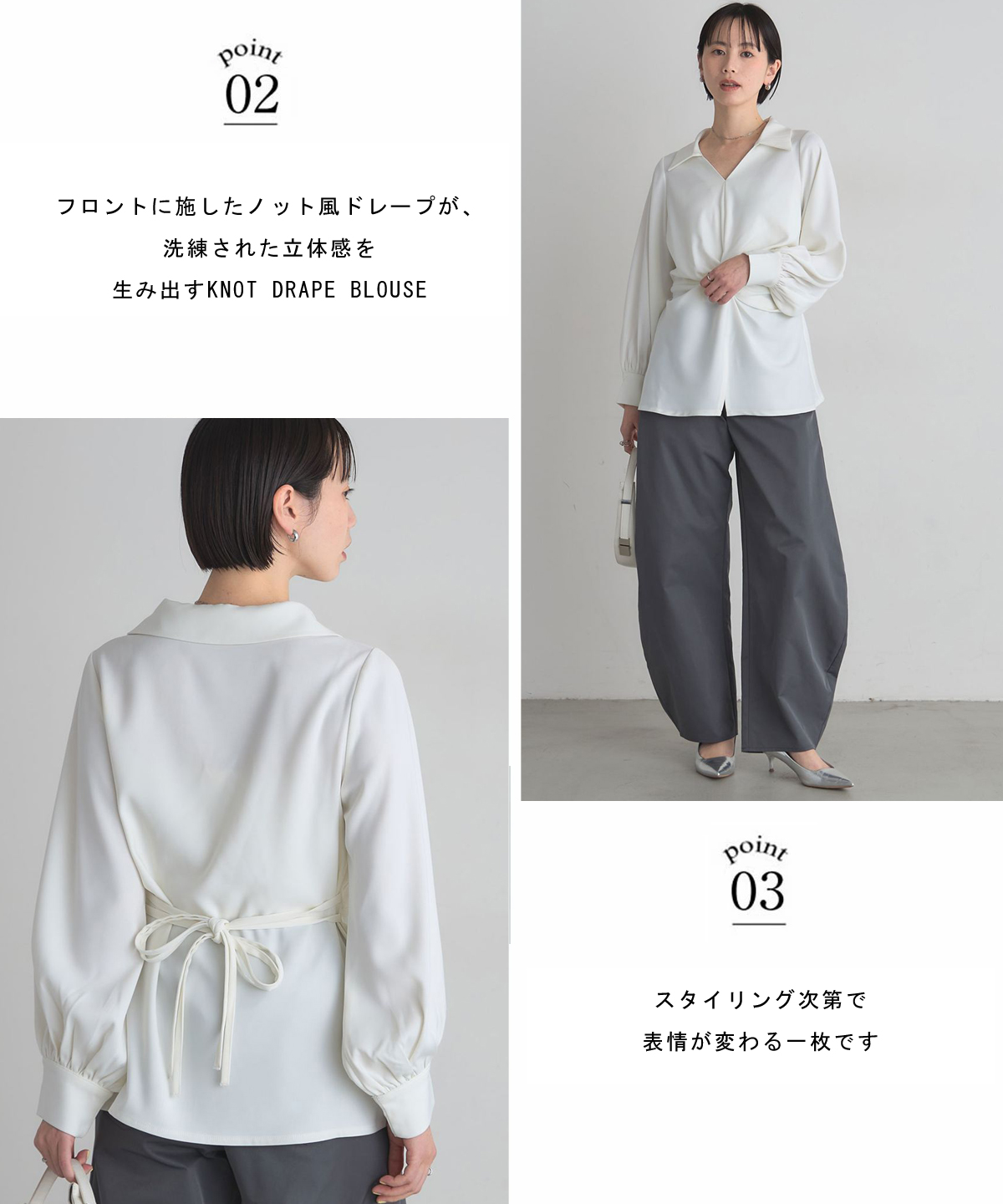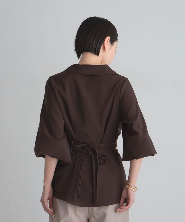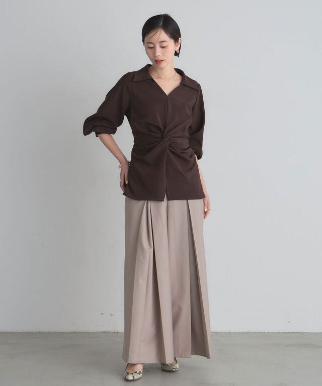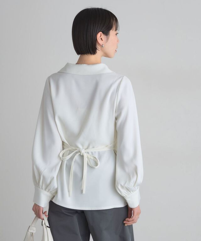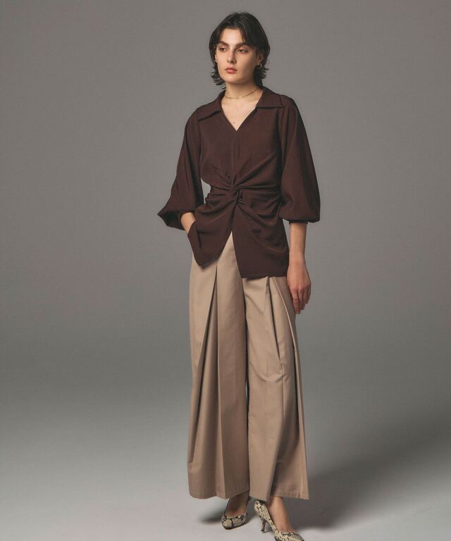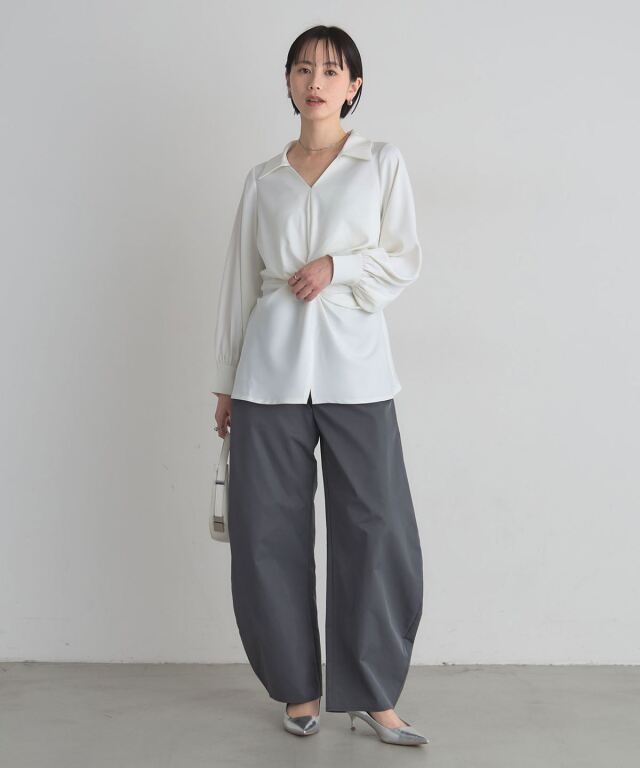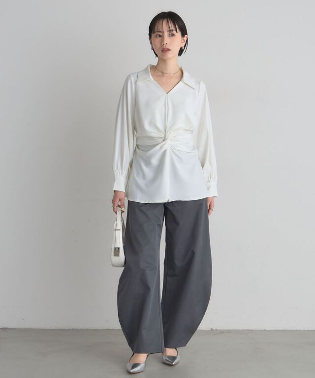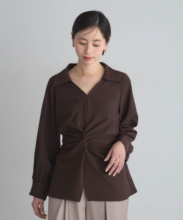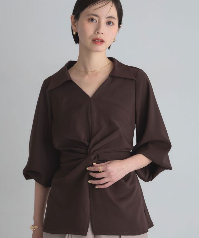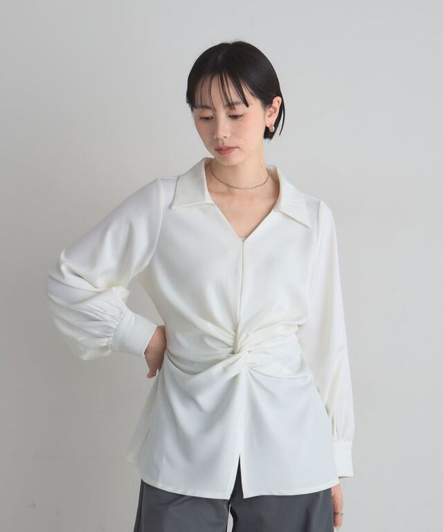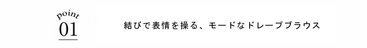 | 商品説明 | : | 結びで表情を操る、モードなドレープブラウス。 フロントに施したノット風ドレープが、洗練された立体感を生み出すKNOT DRAPE BLOUSE。 サイドに配した紐を後ろで結ぶことで、シルエットにメリハリをつけられ、 モードな着こなしが完成します。 落ち感のある素材がシャープさの中に女性らしさをプラス。 パンツ合わせでクールに、スカート合わせで上品にも着こなせ、 スタイリング次第で表情が変わる一枚です。 |