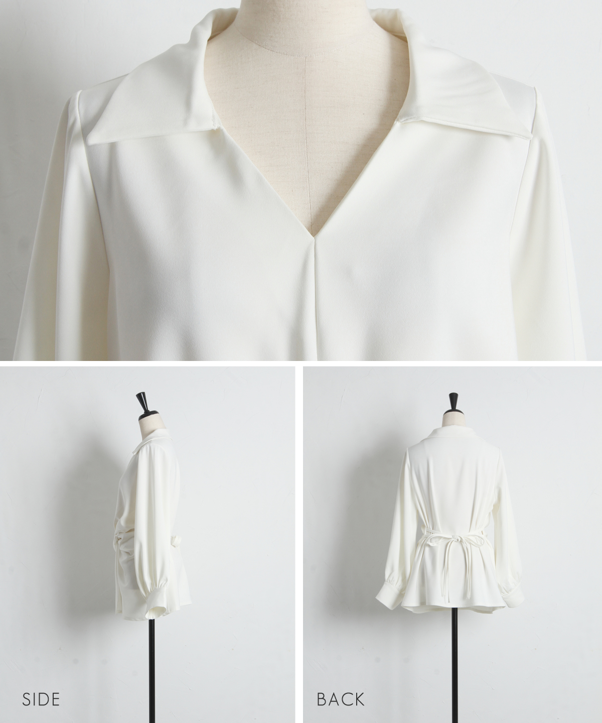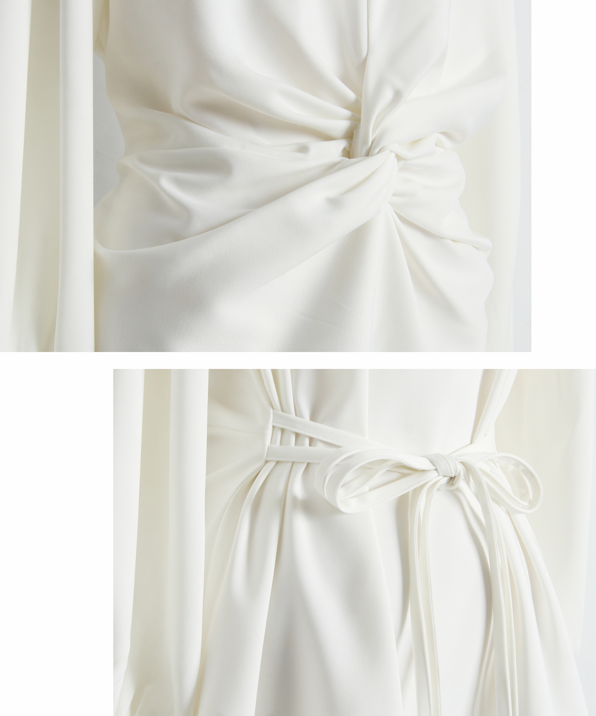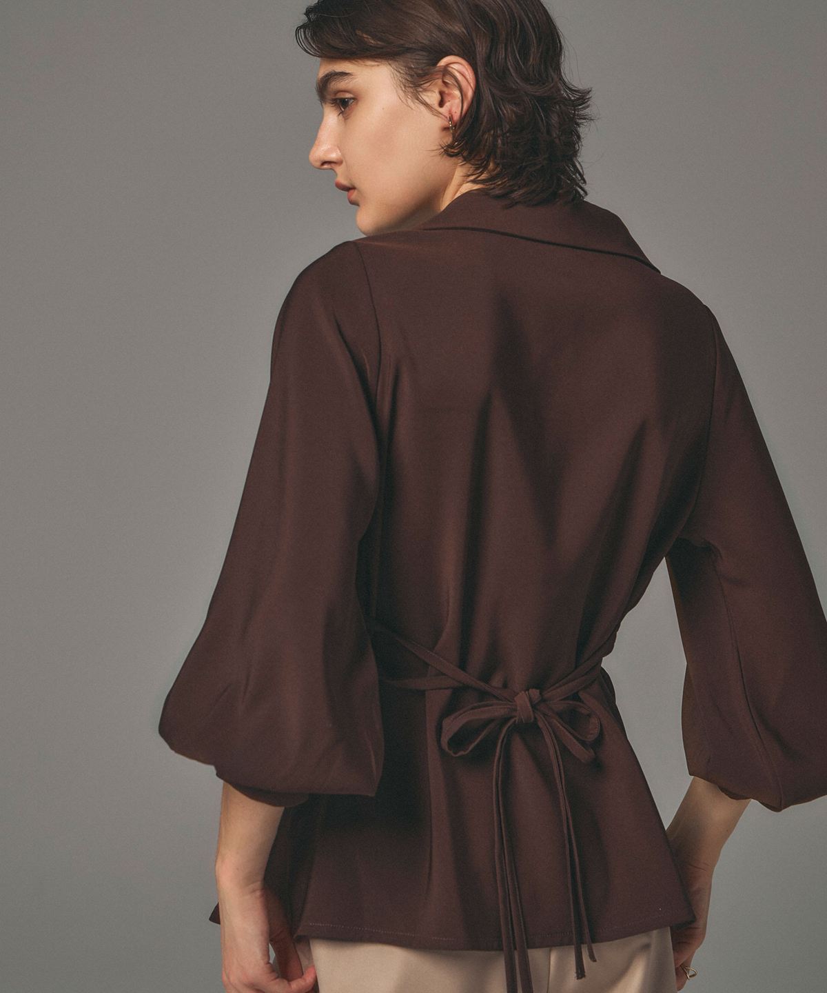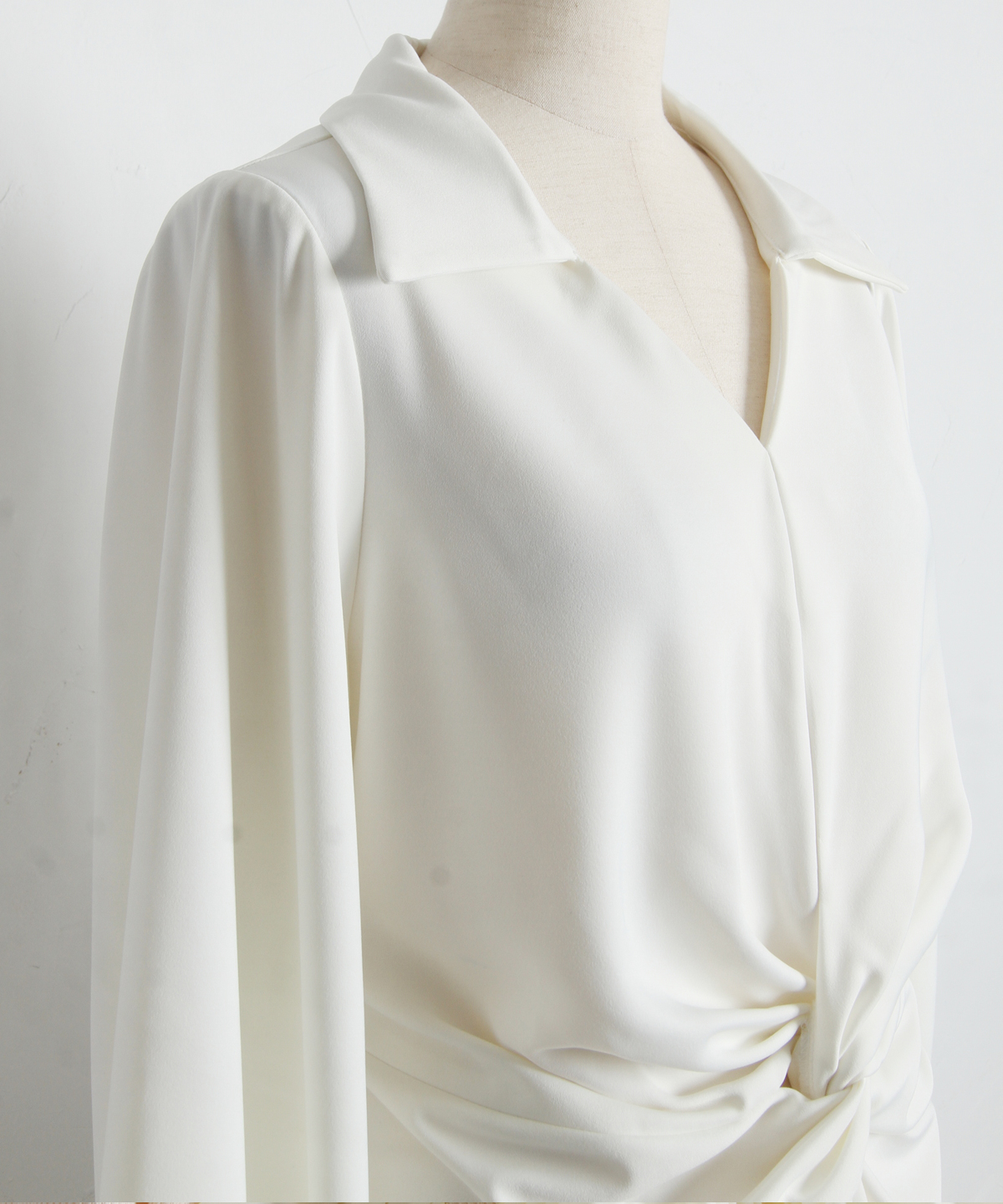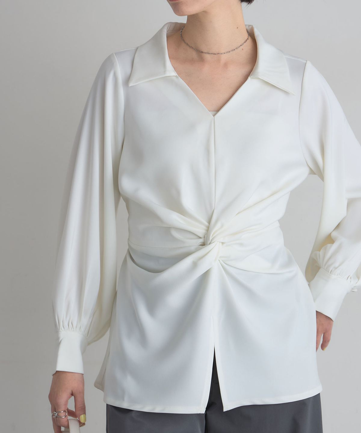 | 商品説明 | : | 結びで表情を操る、モードなドレープブラウス。 フロントに施したノット風ドレープが、洗練された立体感を生み出すKNOT DRAPE BLOUSE。 サイドに配した紐を後ろで結ぶことで、シルエットにメリハリをつけられ、 モードな着こなしが完成します。 落ち感のある素材がシャープさの中に女性らしさをプラス。 パンツ合わせでクールに、スカート合わせで上品にも着こなせ、 スタイリング次第で表情が変わる一枚です。 |