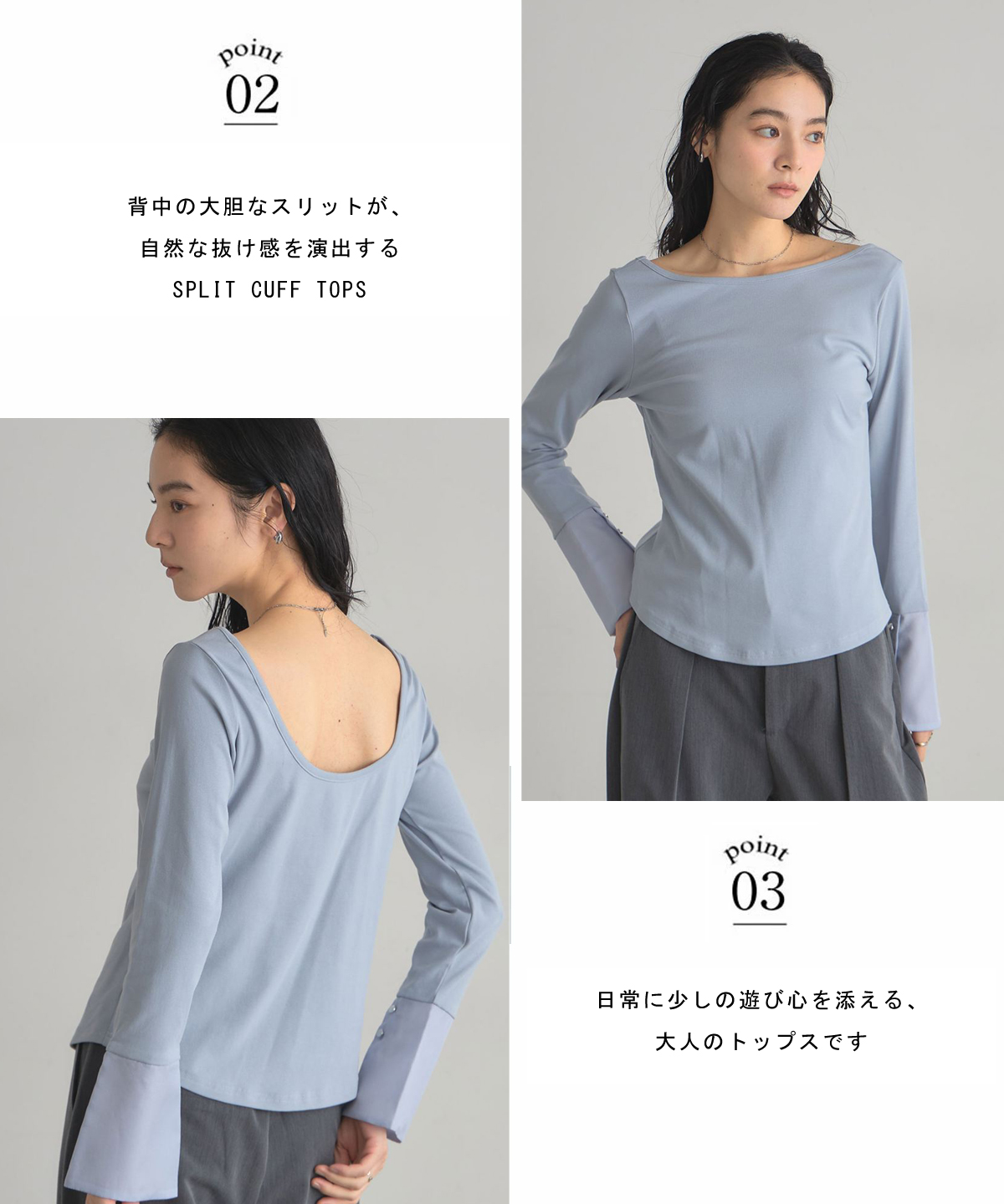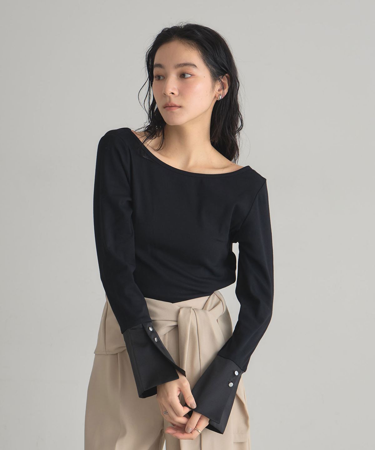 | 商品説明 | : | 背中でさりげなく魅せる、大人の抜け感。 背中の大胆なスリットが、自然な抜け感を演出するSPLIT CUFF TOPS。 前から見るとシンプルながら、振り返った瞬間に表情が変わるデザインが魅力です。 袖口に入れたスリットは、手元に軽やかな動きをプラスし、さりげないアクセントに。 合わせるアイテムで雰囲気が変わり、綺麗めにもモードにも。 日常に少しの遊び心を添える、大人のトップスです。 |