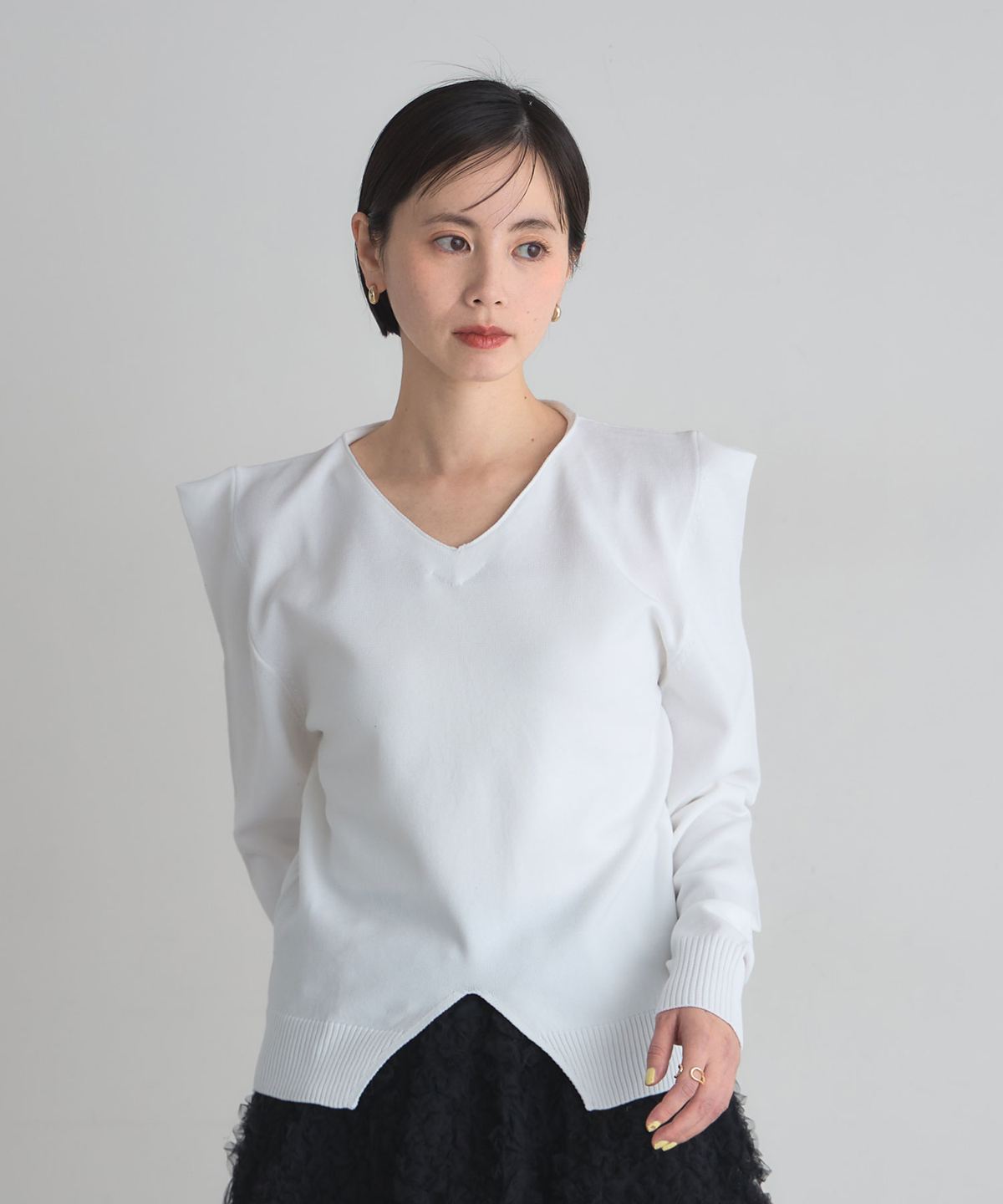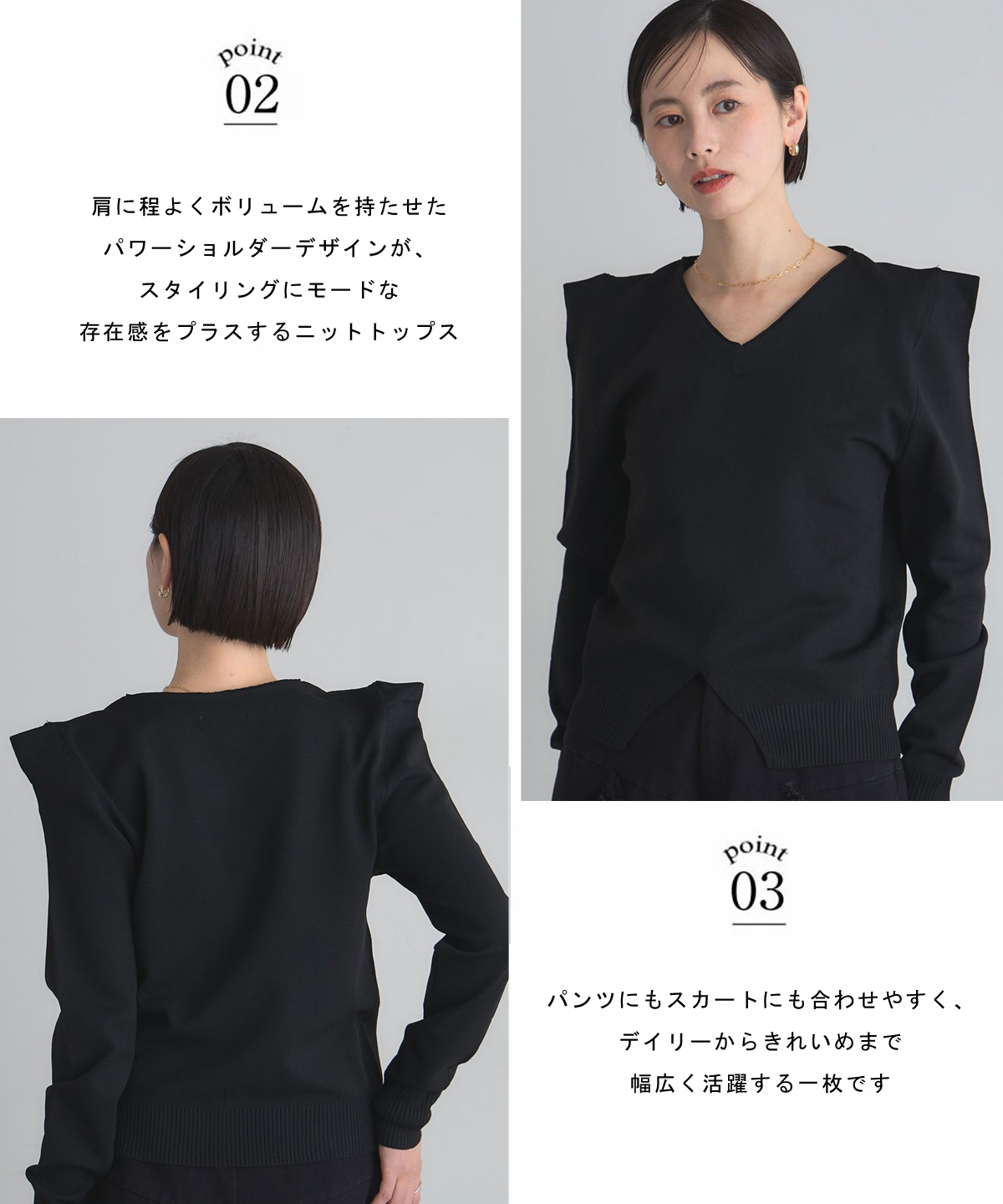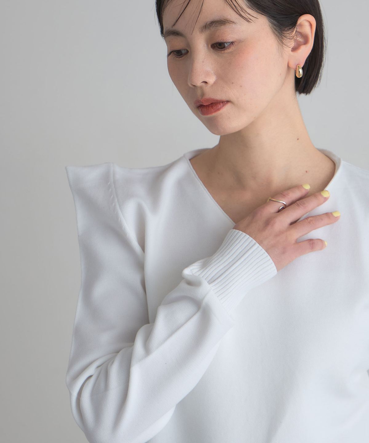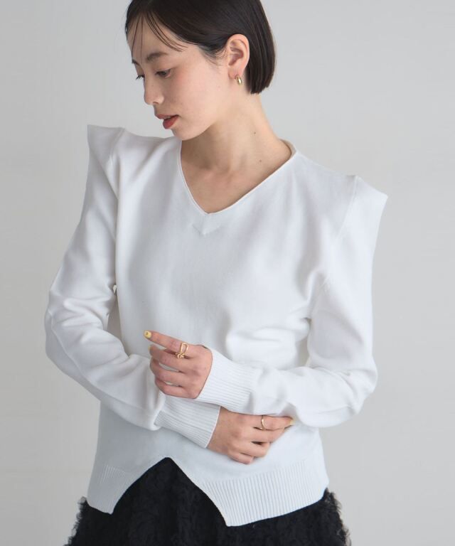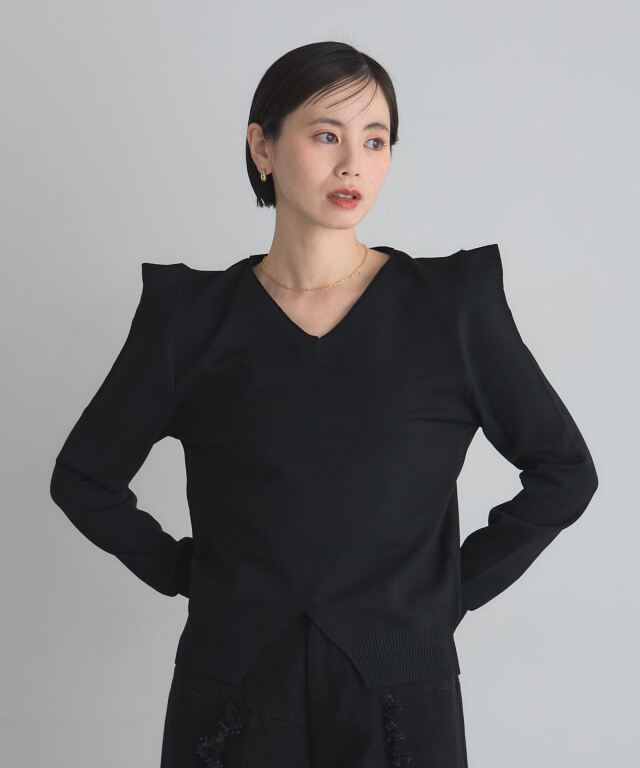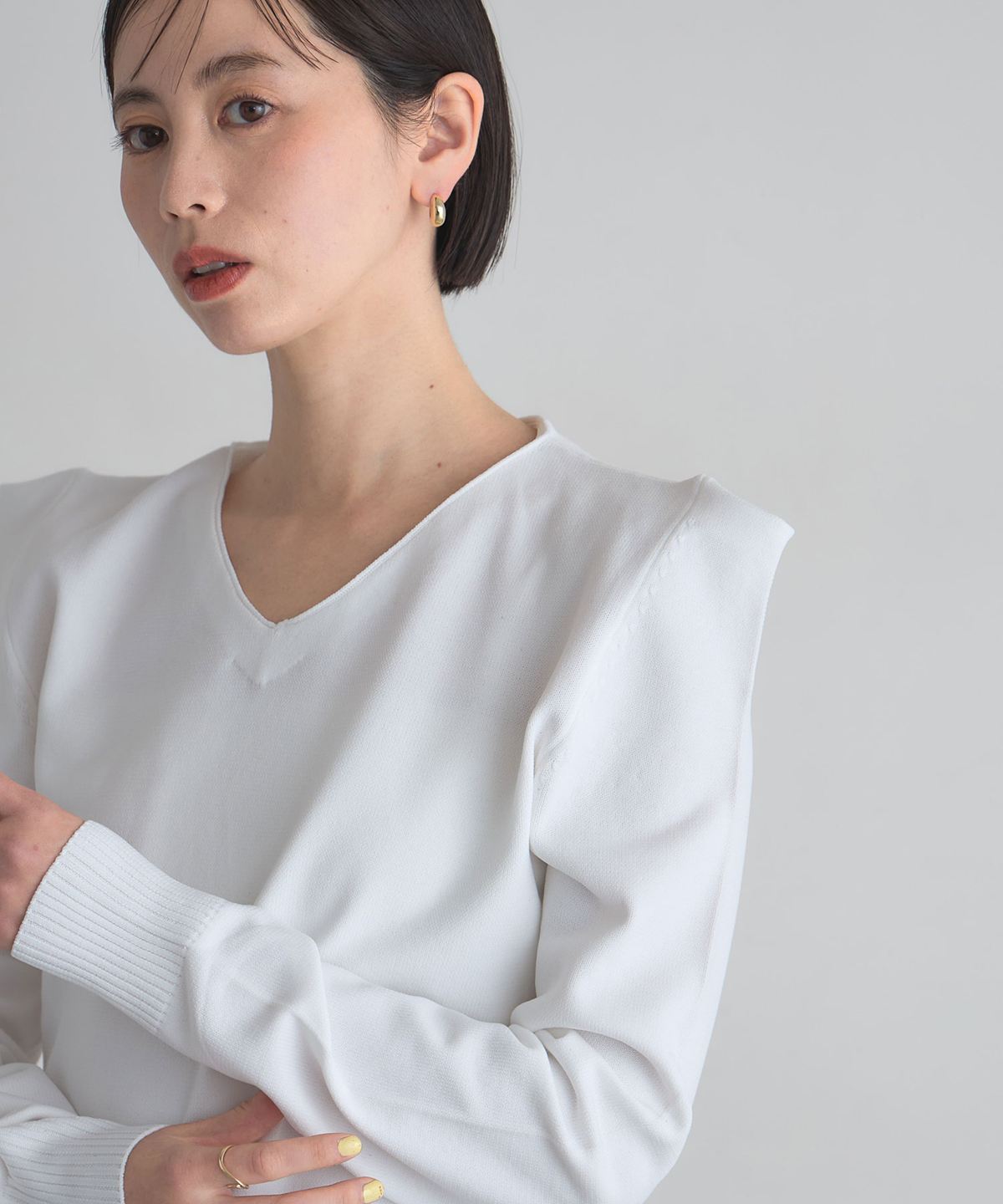 | 商品説明 | : | 構築的なショルダーで魅せる、洗練モードなニットトップス。 肩に程よくボリュームを持たせたパワーショルダーデザインが、 スタイリングにモードな存在感をプラスするニットトップス。 シャープなラインとコンパクトな身頃のバランスで、着るだけで自然とスタイルアップが叶います。 Vネックが顔まわりをすっきりと見せ、女性らしさもプラス。 パンツにもスカートにも合わせやすく、デイリーからきれいめまで幅広く活躍する一枚です。 |