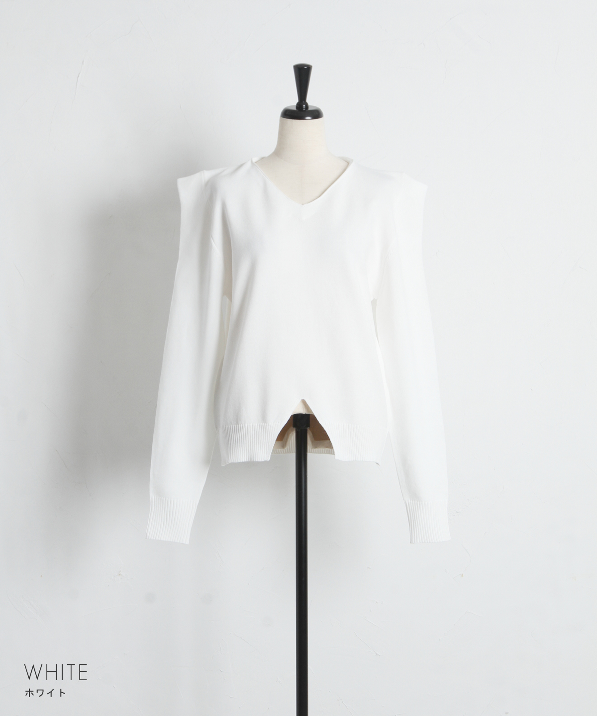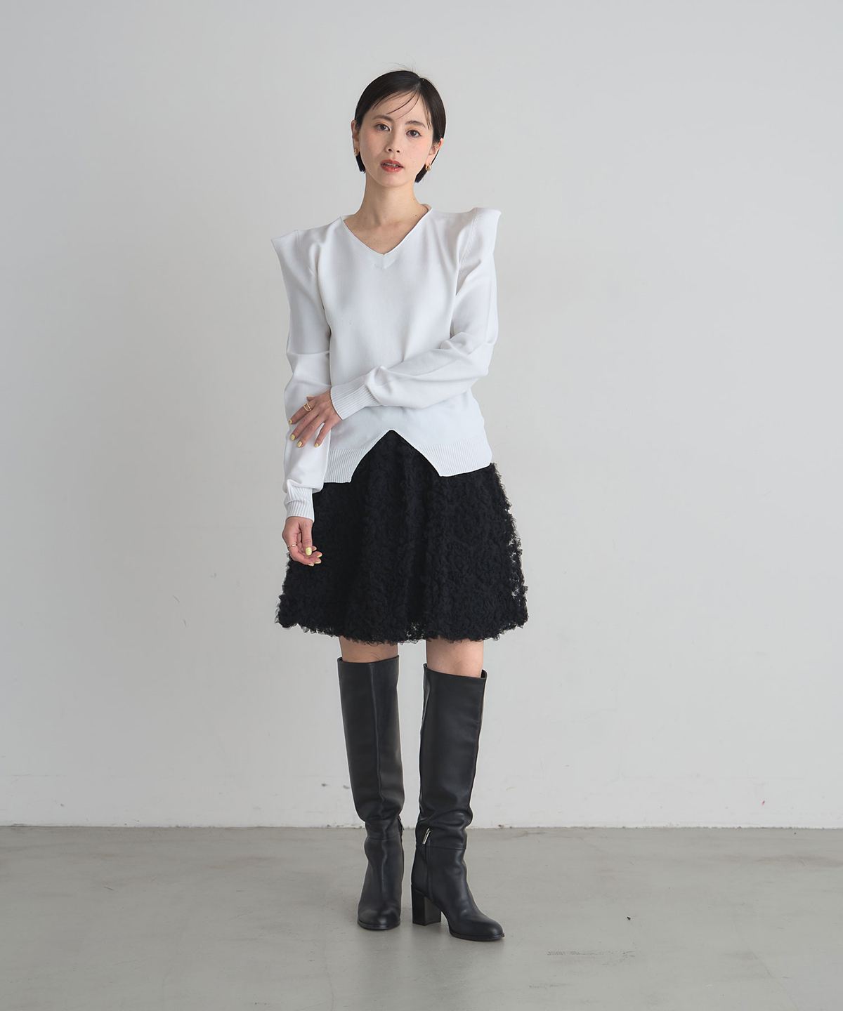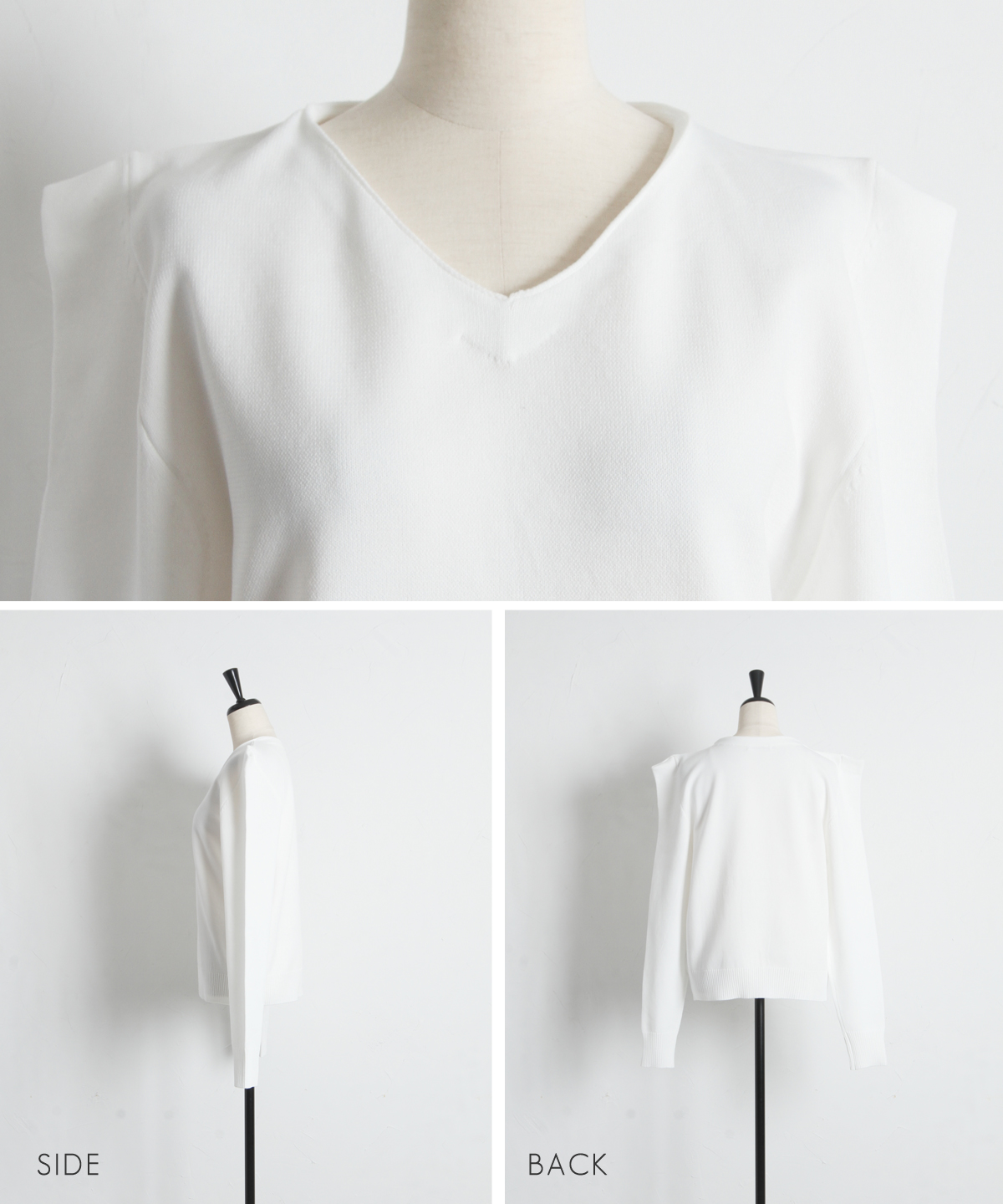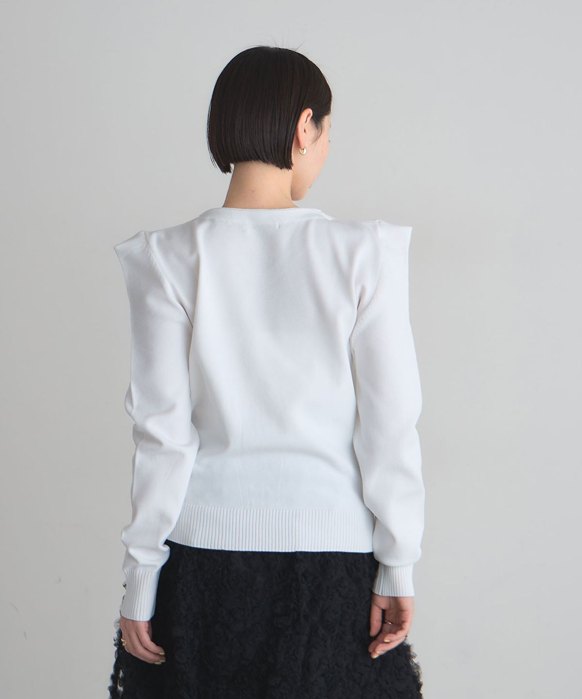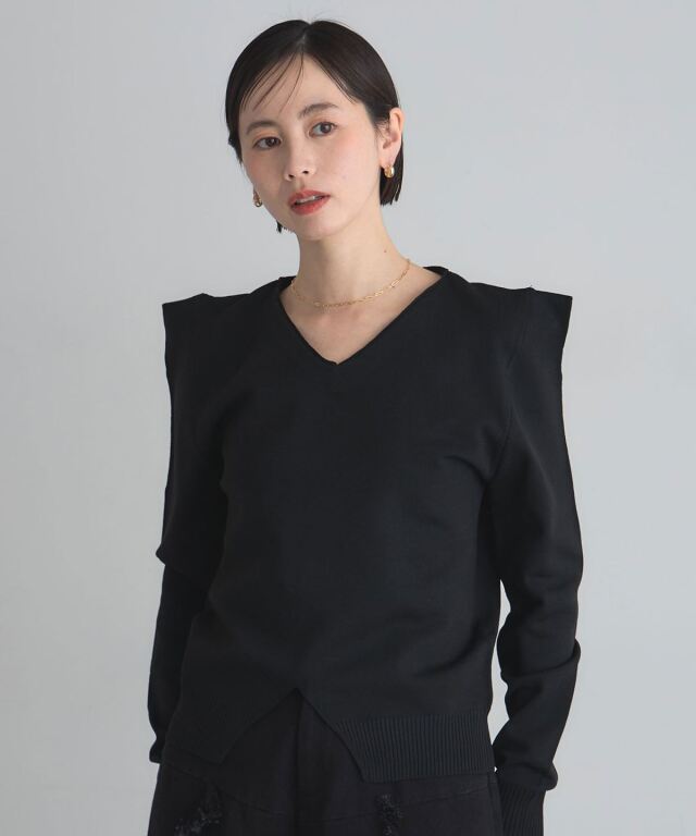 | 商品説明 | : | 構築的なショルダーで魅せる、洗練モードなニットトップス。 肩に程よくボリュームを持たせたパワーショルダーデザインが、 スタイリングにモードな存在感をプラスするニットトップス。 シャープなラインとコンパクトな身頃のバランスで、着るだけで自然とスタイルアップが叶います。 Vネックが顔まわりをすっきりと見せ、女性らしさもプラス。 パンツにもスカートにも合わせやすく、デイリーからきれいめまで幅広く活躍する一枚です。 |