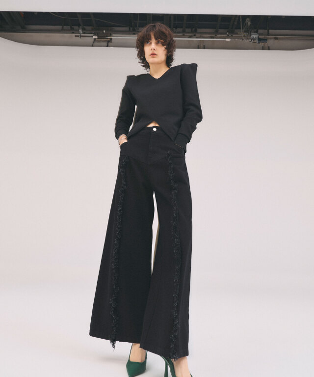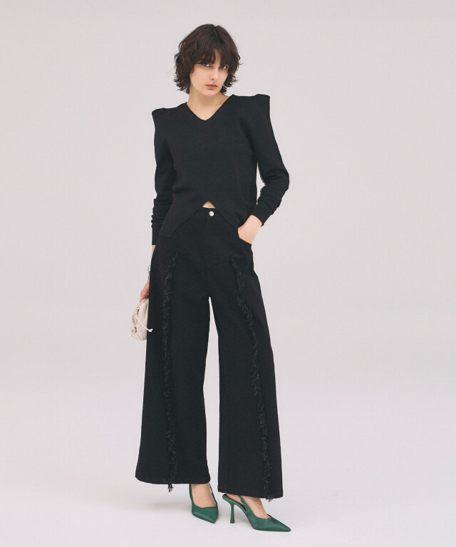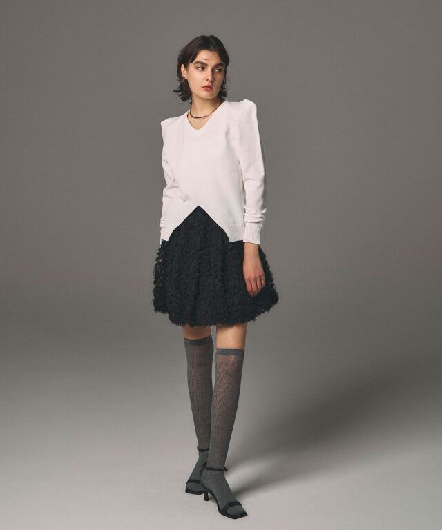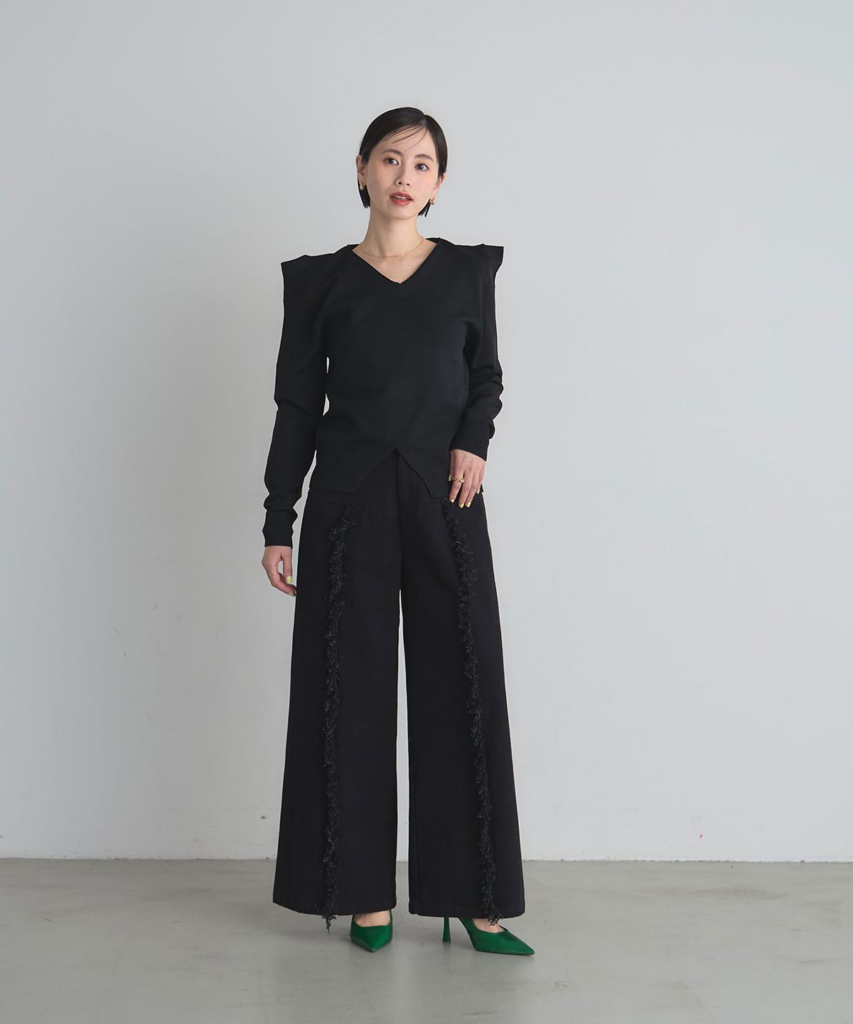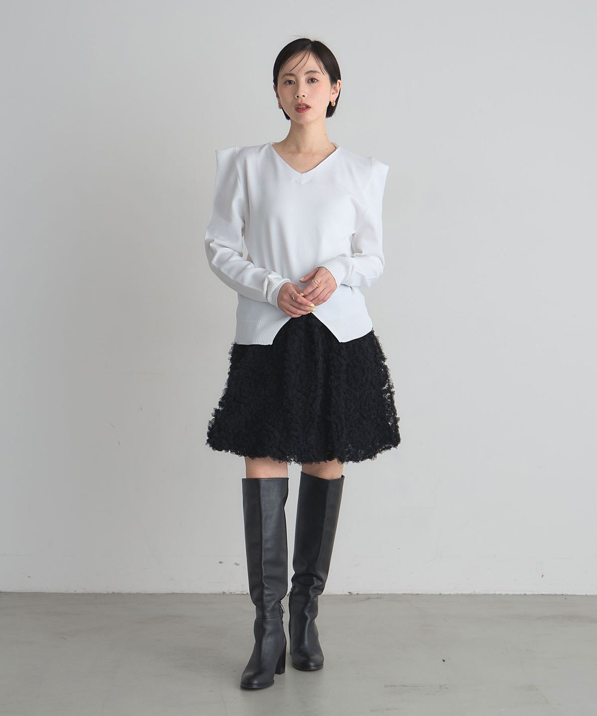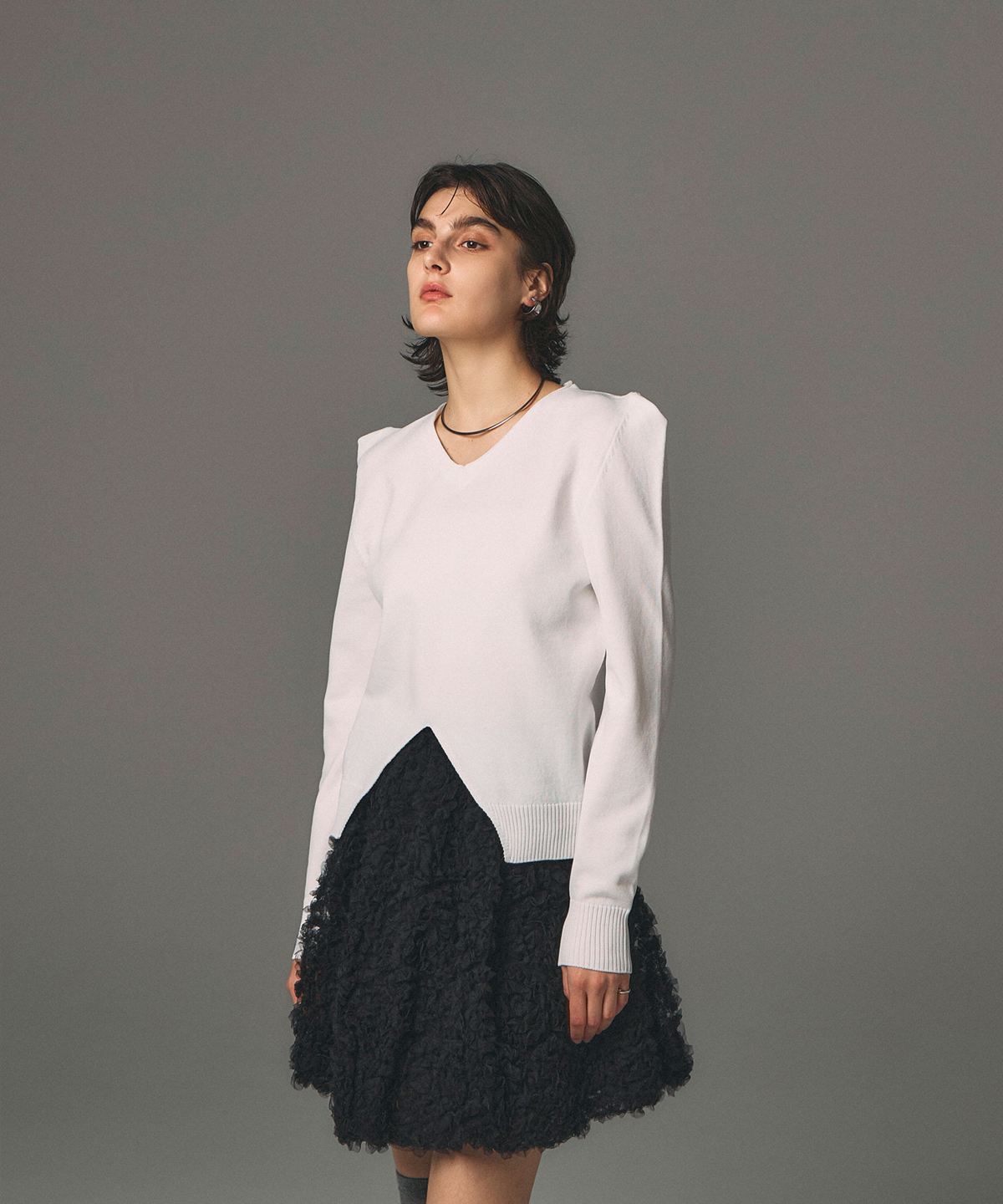 | 商品説明 | : | 構築的なショルダーで魅せる、洗練モードなニットトップス。 肩に程よくボリュームを持たせたパワーショルダーデザインが、 スタイリングにモードな存在感をプラスするニットトップス。 シャープなラインとコンパクトな身頃のバランスで、着るだけで自然とスタイルアップが叶います。 Vネックが顔まわりをすっきりと見せ、女性らしさもプラス。 パンツにもスカートにも合わせやすく、デイリーからきれいめまで幅広く活躍する一枚です。 |