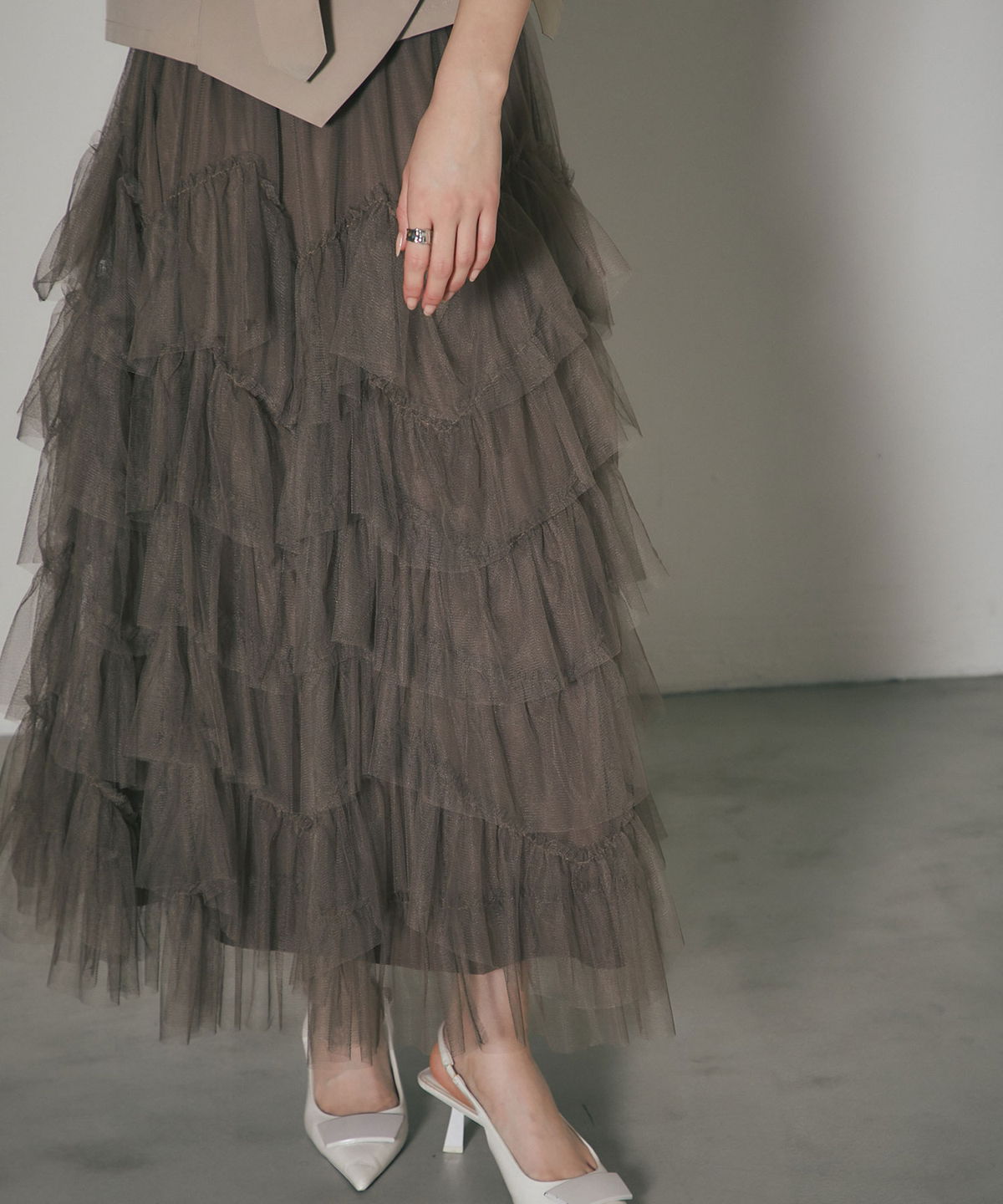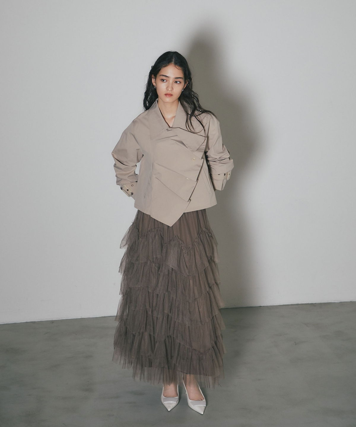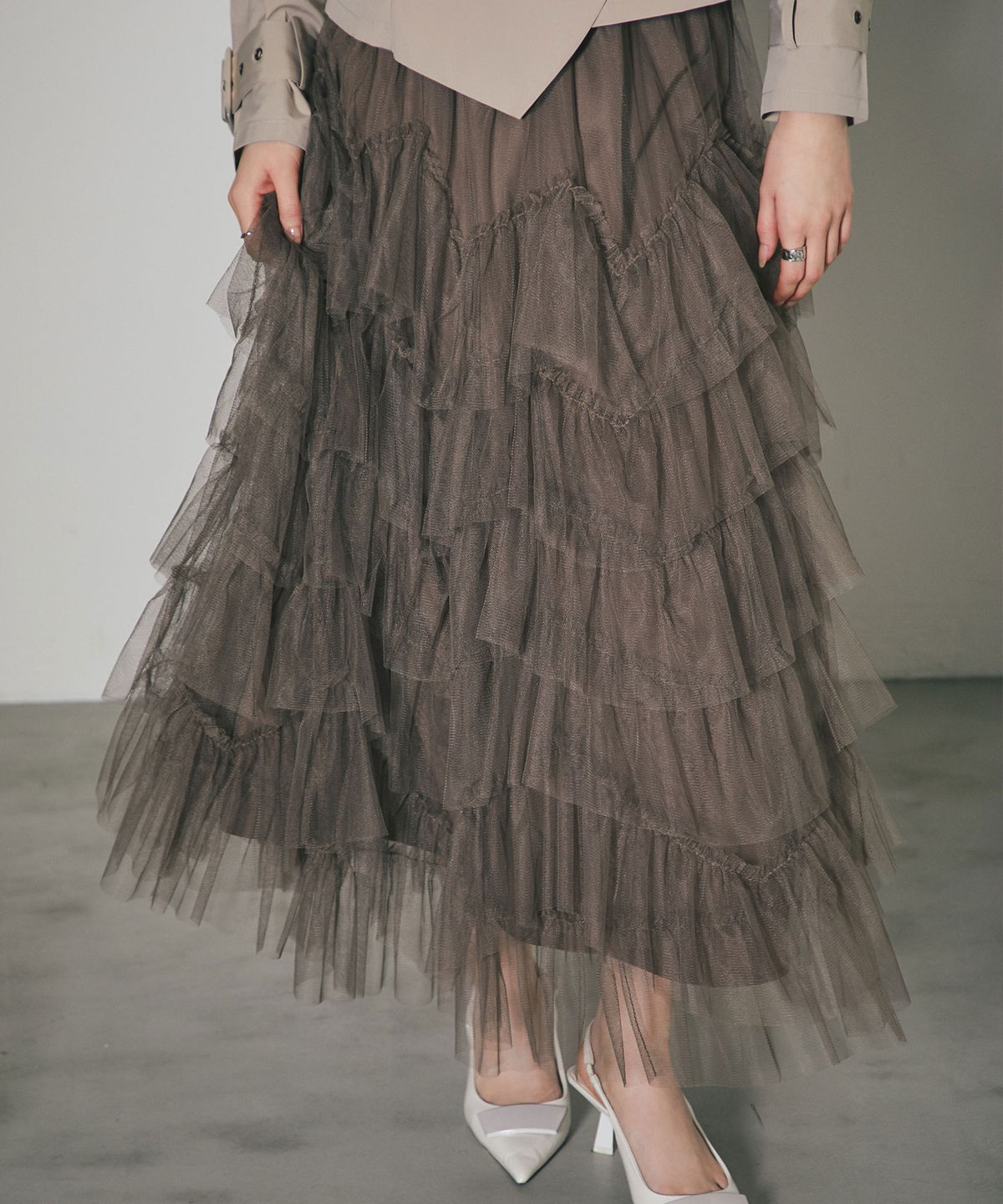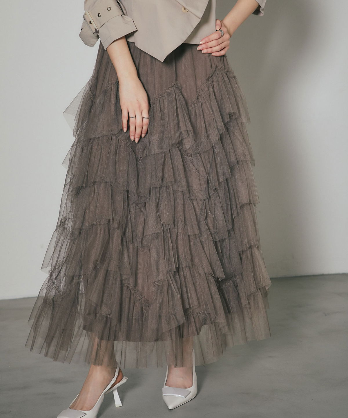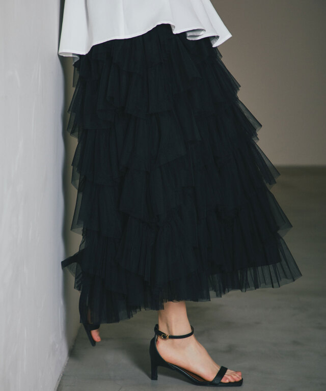 | 商品説明 | : | 重なり合うチュールが奏でる、甘さを抑えた大人のドラマティックスカート 繊細なチュールを贅沢に幾層にも重ねた、存在感溢れるティアードスカート。 段差をつけたレイヤード設計が、歩くたびに空気を含み、奥行きのある優雅なシルエットを描き出します。 甘くなりがちなチュール素材ですが、ニュアンスカラーで仕上げることで、洗練された都会的な表情に。 ウエスト周りはボリュームを抑えているため、ジャケットやタイトなニットとも相性抜群です。 日常を特別な一日に変える、主役級の一着。 |