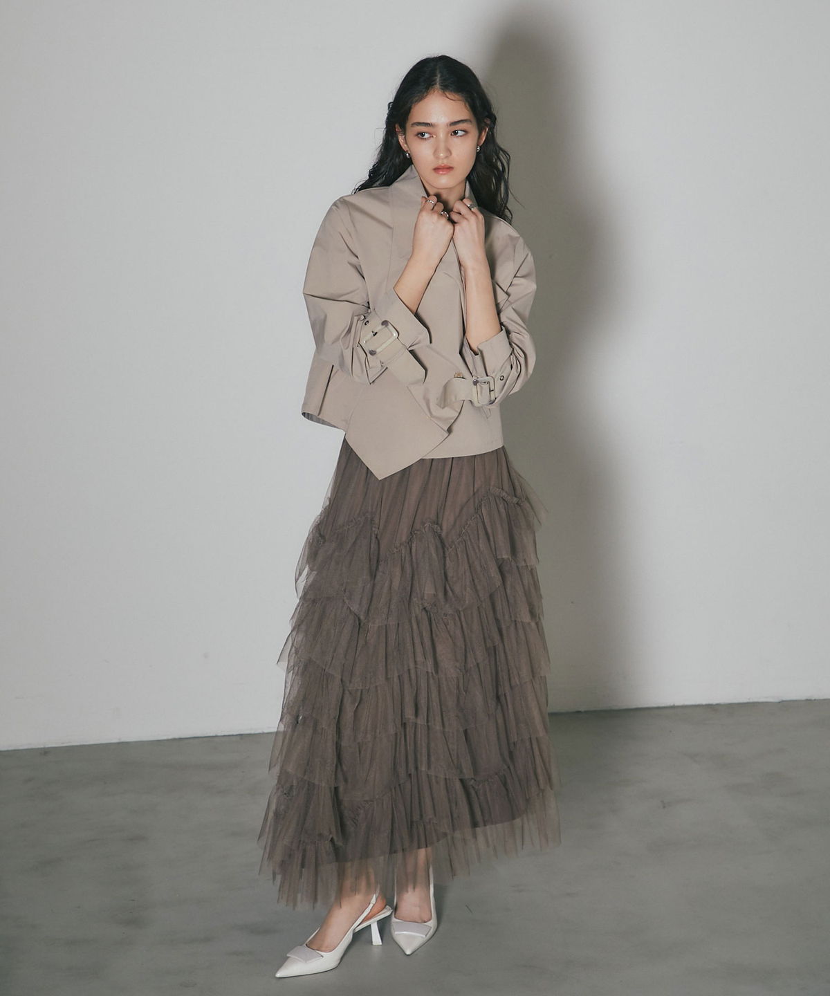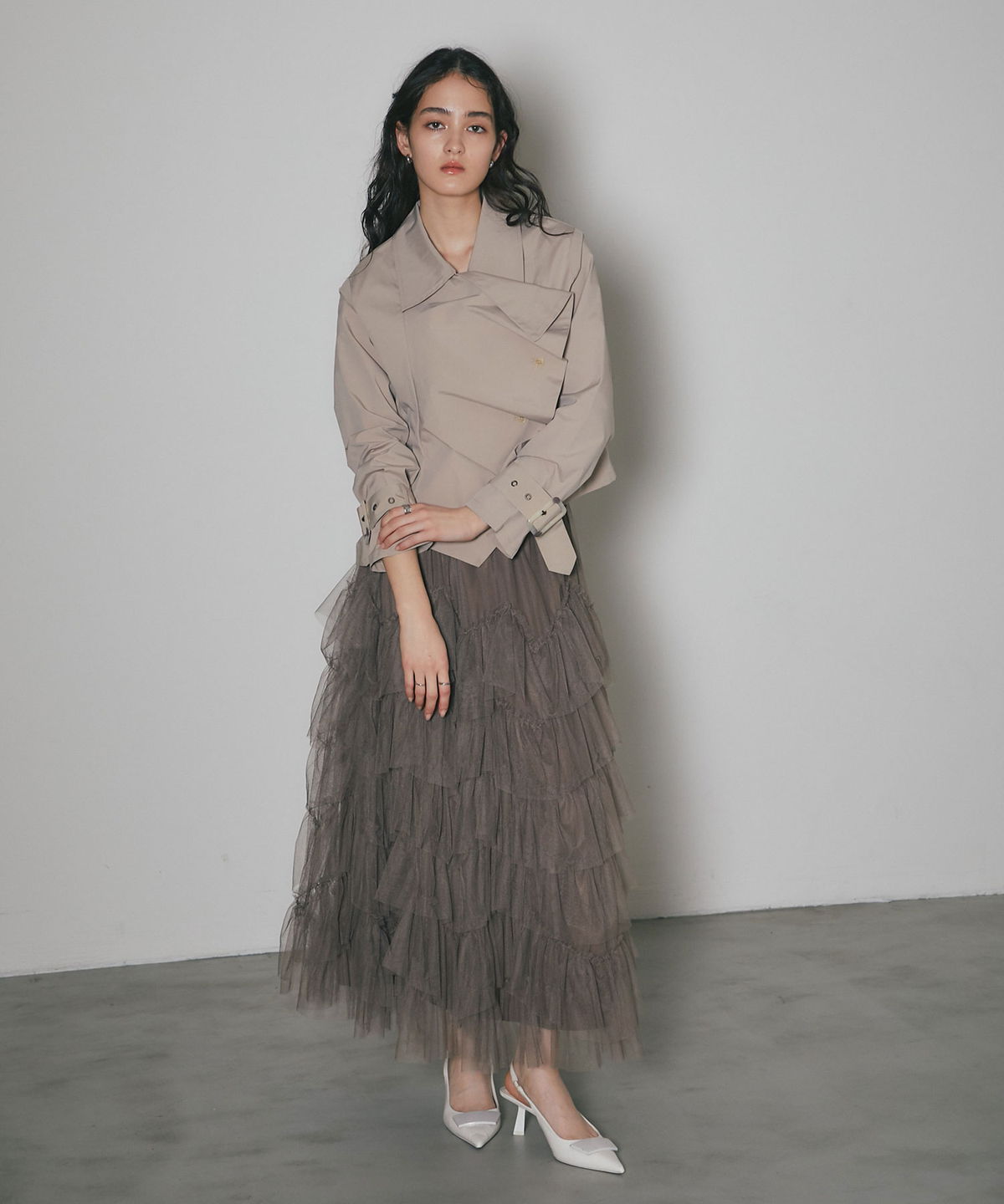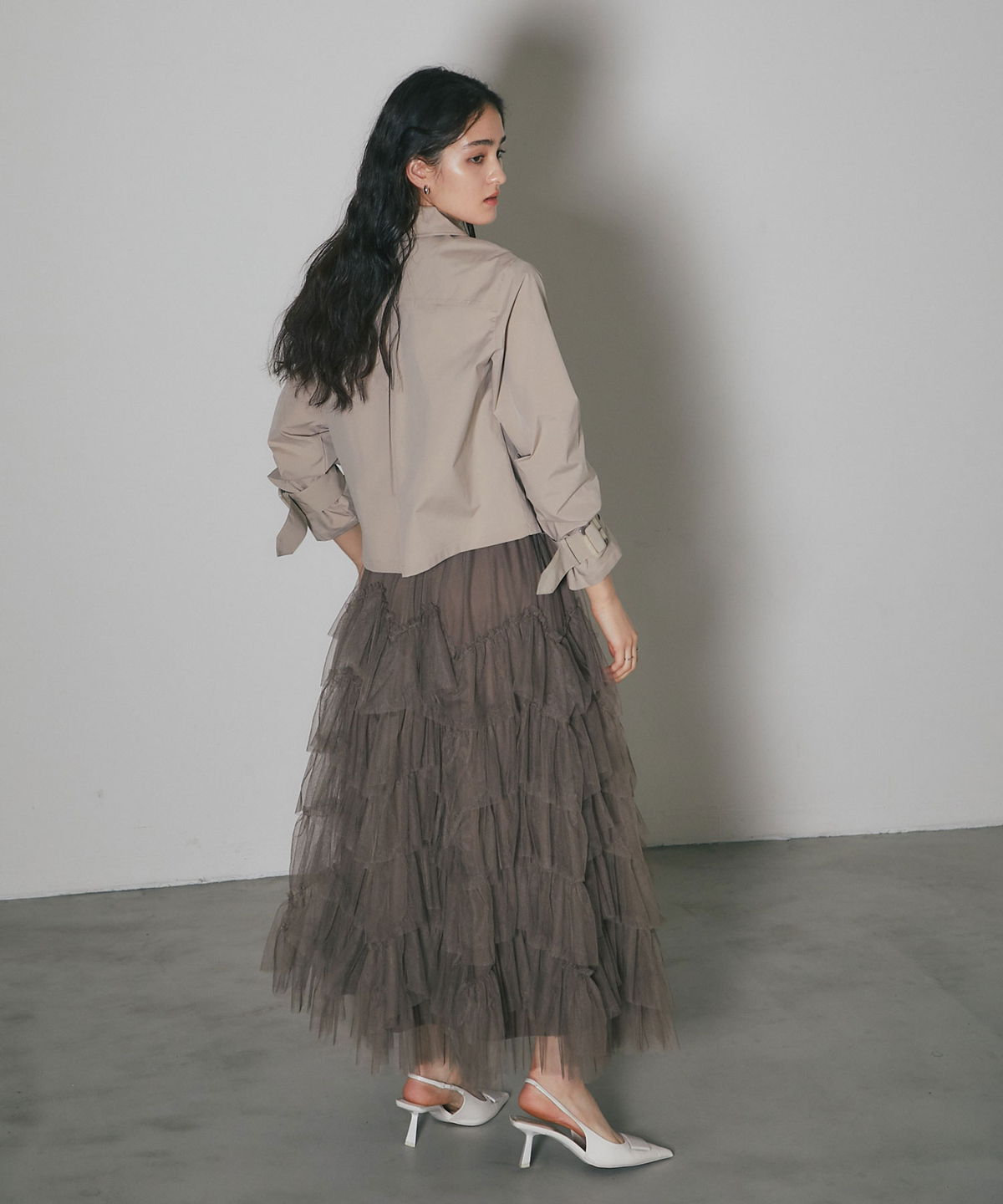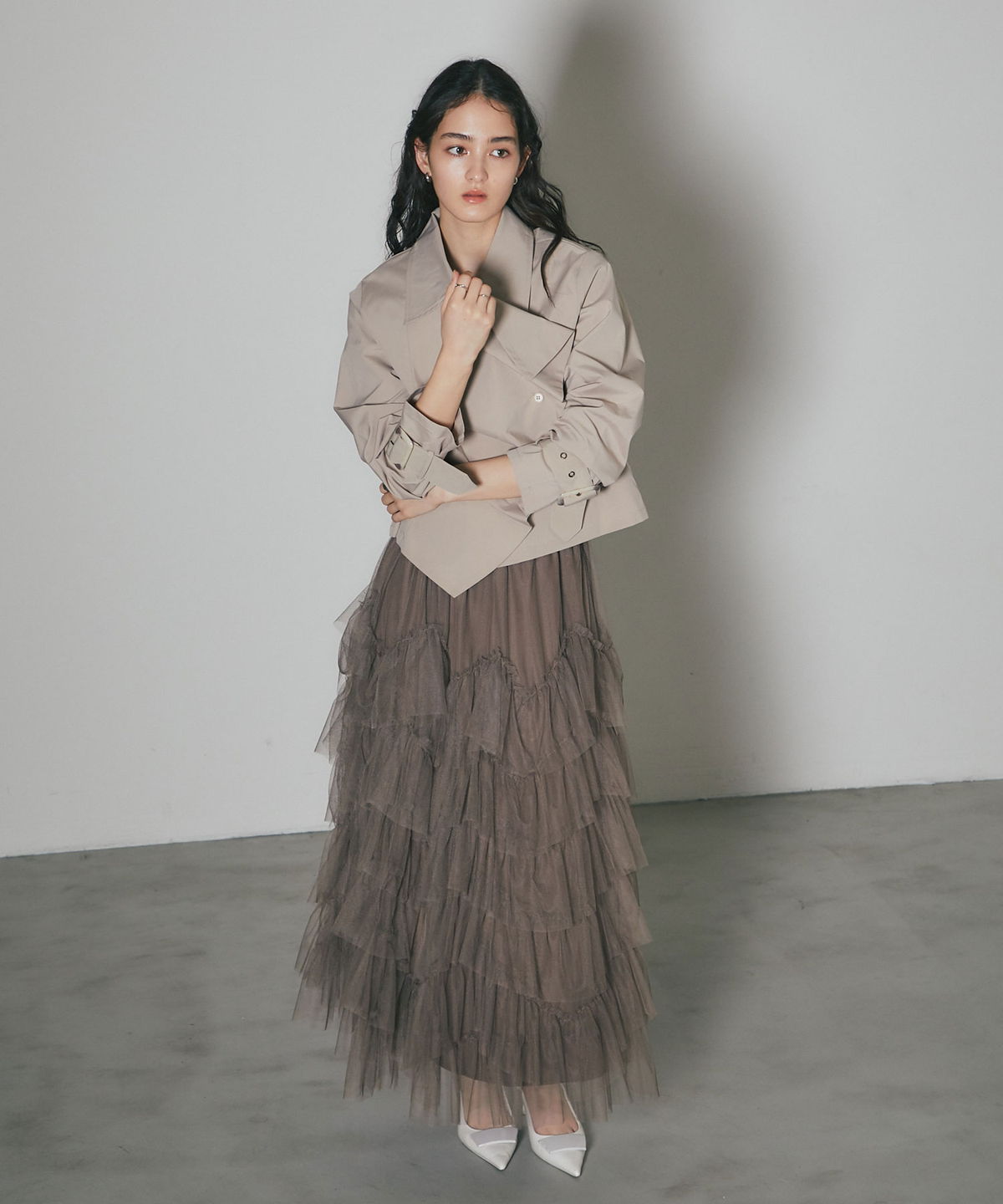 | 商品説明 | : | 重なり合うチュールが奏でる、甘さを抑えた大人のドラマティックスカート 繊細なチュールを贅沢に幾層にも重ねた、存在感溢れるティアードスカート。 段差をつけたレイヤード設計が、歩くたびに空気を含み、奥行きのある優雅なシルエットを描き出します。 甘くなりがちなチュール素材ですが、ニュアンスカラーで仕上げることで、洗練された都会的な表情に。 ウエスト周りはボリュームを抑えているため、ジャケットやタイトなニットとも相性抜群です。 日常を特別な一日に変える、主役級の一着。 |
