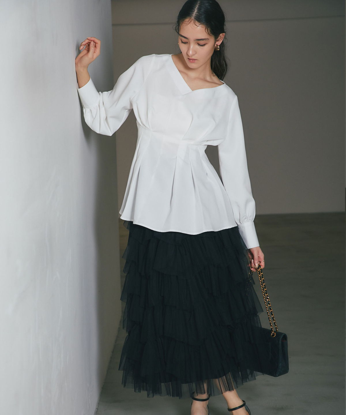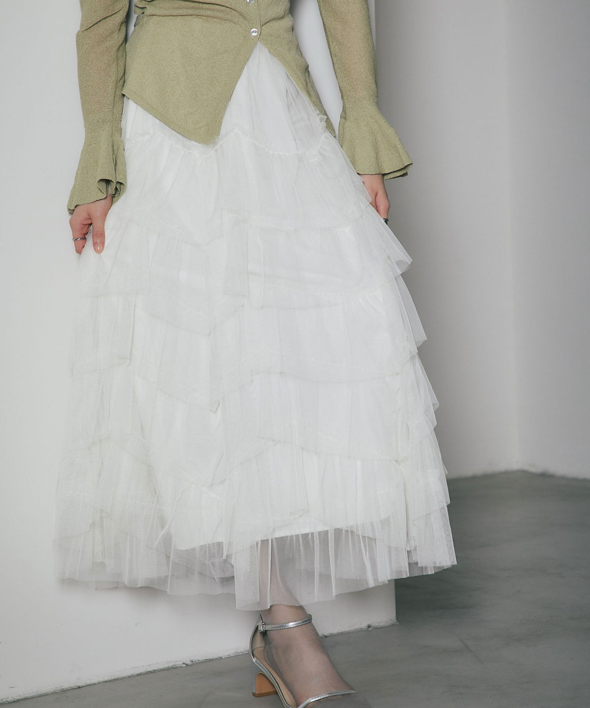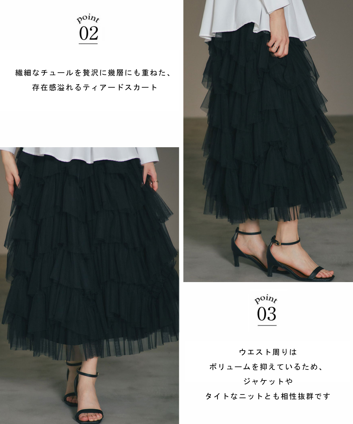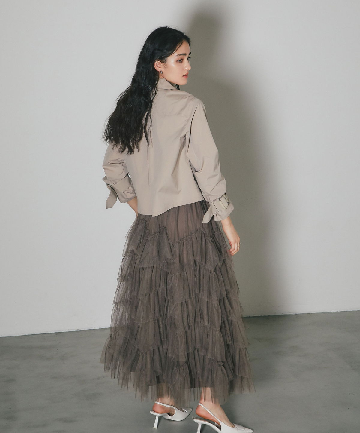 | 商品説明 | : | 重なり合うチュールが奏でる、甘さを抑えた大人のドラマティックスカート 繊細なチュールを贅沢に幾層にも重ねた、存在感溢れるティアードスカート。 段差をつけたレイヤード設計が、歩くたびに空気を含み、奥行きのある優雅なシルエットを描き出します。 甘くなりがちなチュール素材ですが、ニュアンスカラーで仕上げることで、洗練された都会的な表情に。 ウエスト周りはボリュームを抑えているため、ジャケットやタイトなニットとも相性抜群です。 日常を特別な一日に変える、主役級の一着。 |
