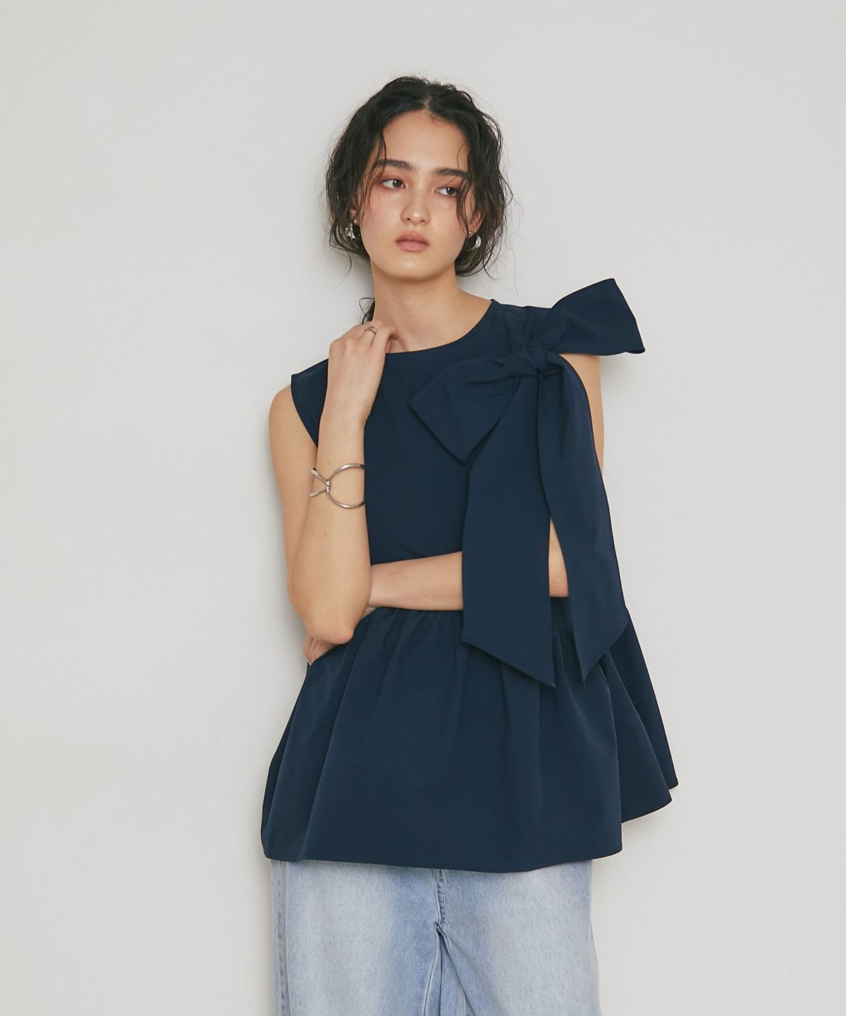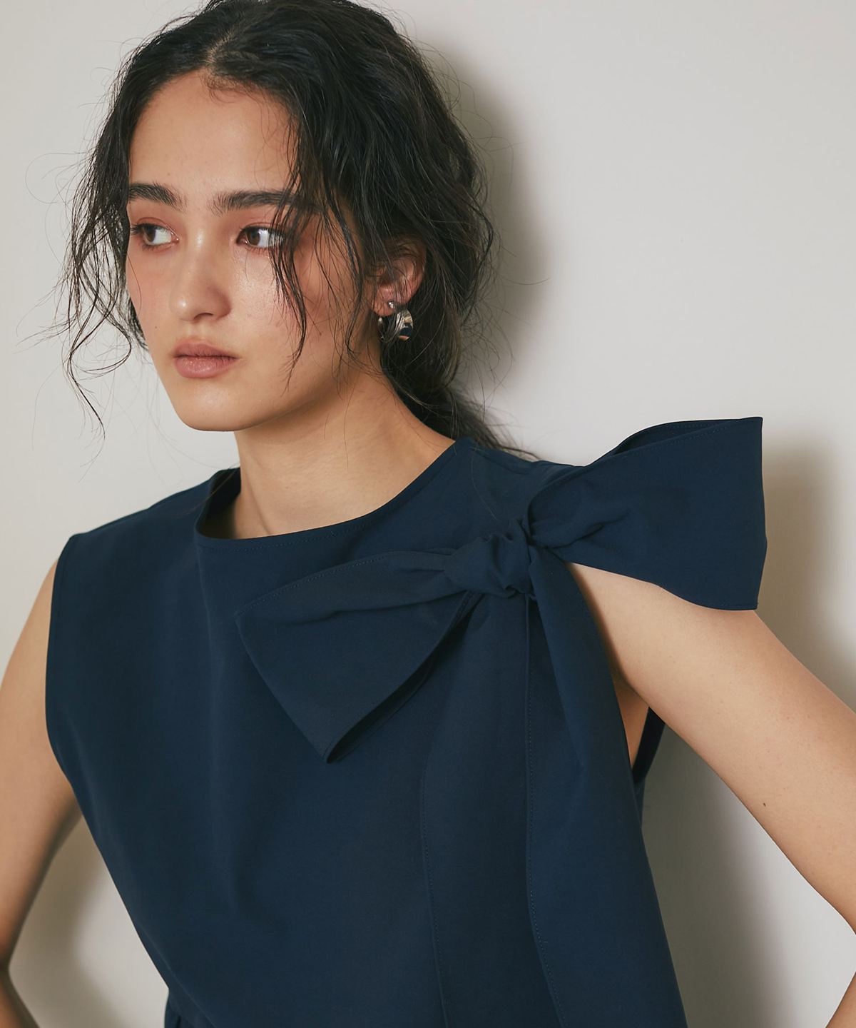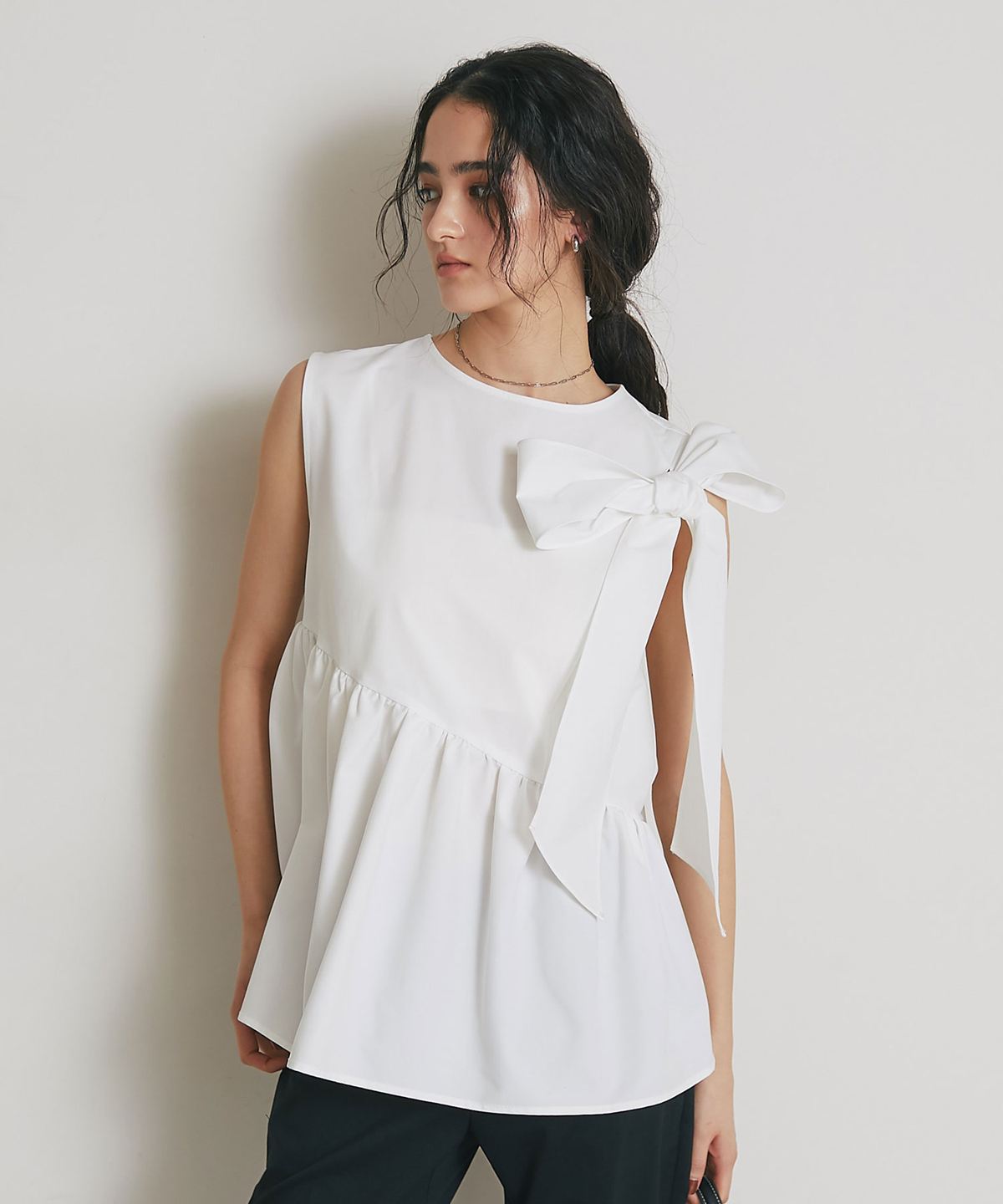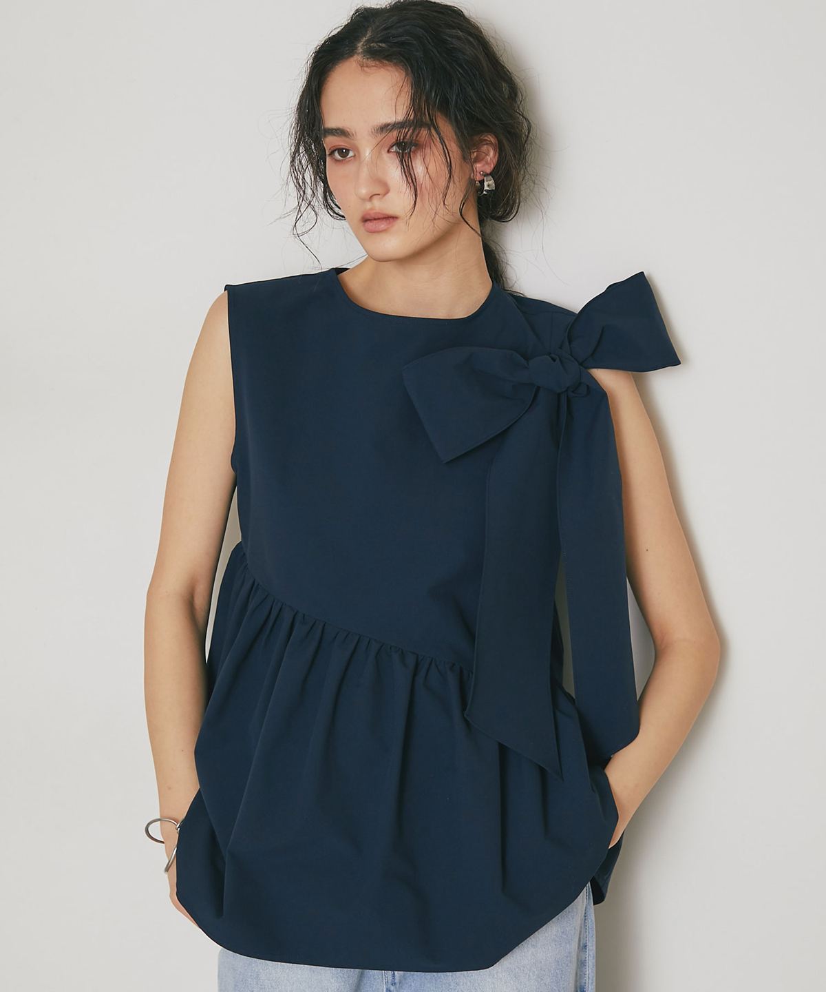 | 商品説明 | : | 視線を奪う大胆なリボン。一枚でモードな華やぎを纏う、主役級ブラウス。 アシンメトリーな切り替えから広がるペプラムシルエットと、肩に配したビッグリボンがドラマチックなノースリーブブラウス。 ハリのある上品な素材感が、甘さを抑えてモードな印象に。 お腹周りをふんわりカバーする絶妙な丈感で、スタイルアップ効果も抜群。 細身のパンツと合わせたメリハリのある着こなしはもちろん、 デニムで外した大人のカジュアルダウンもおすすめです。 デイリーから華やかなお出かけまで、日常を特別にする主役級アイテムです。 |