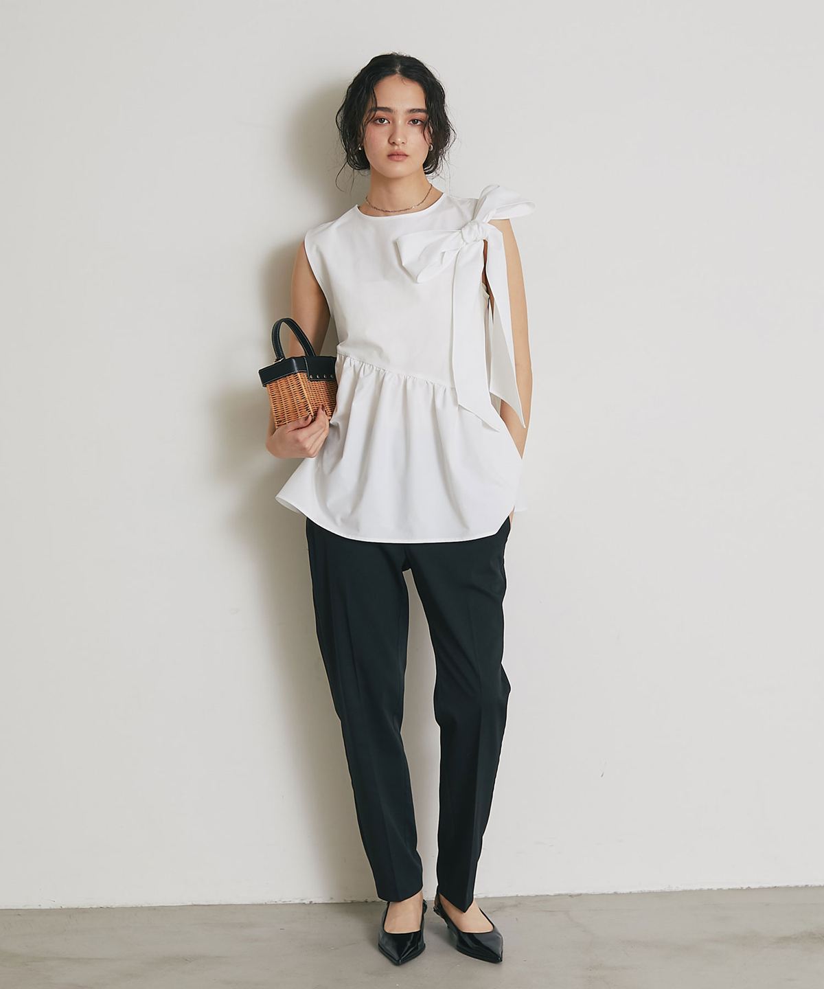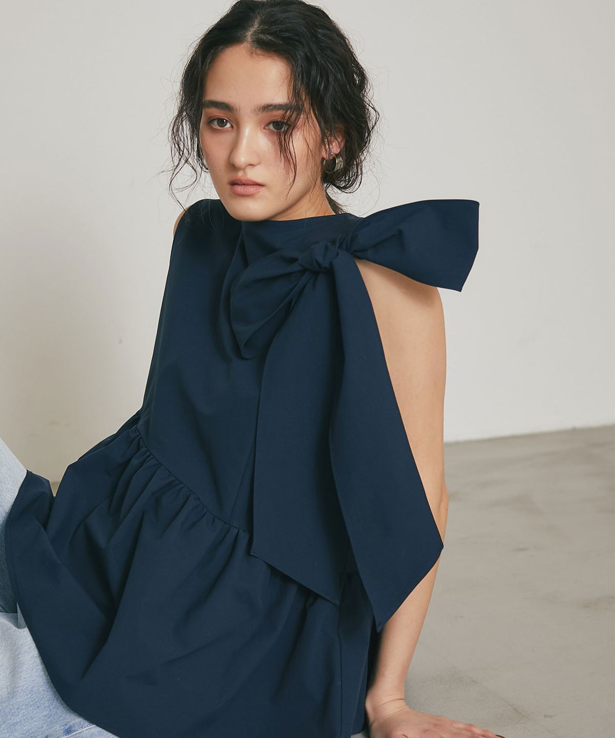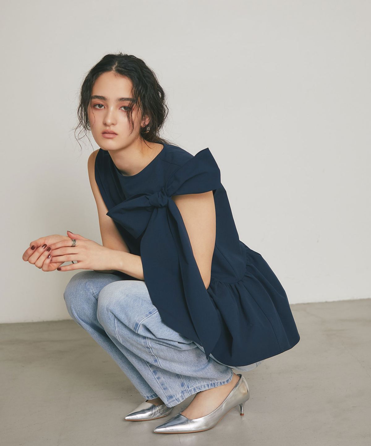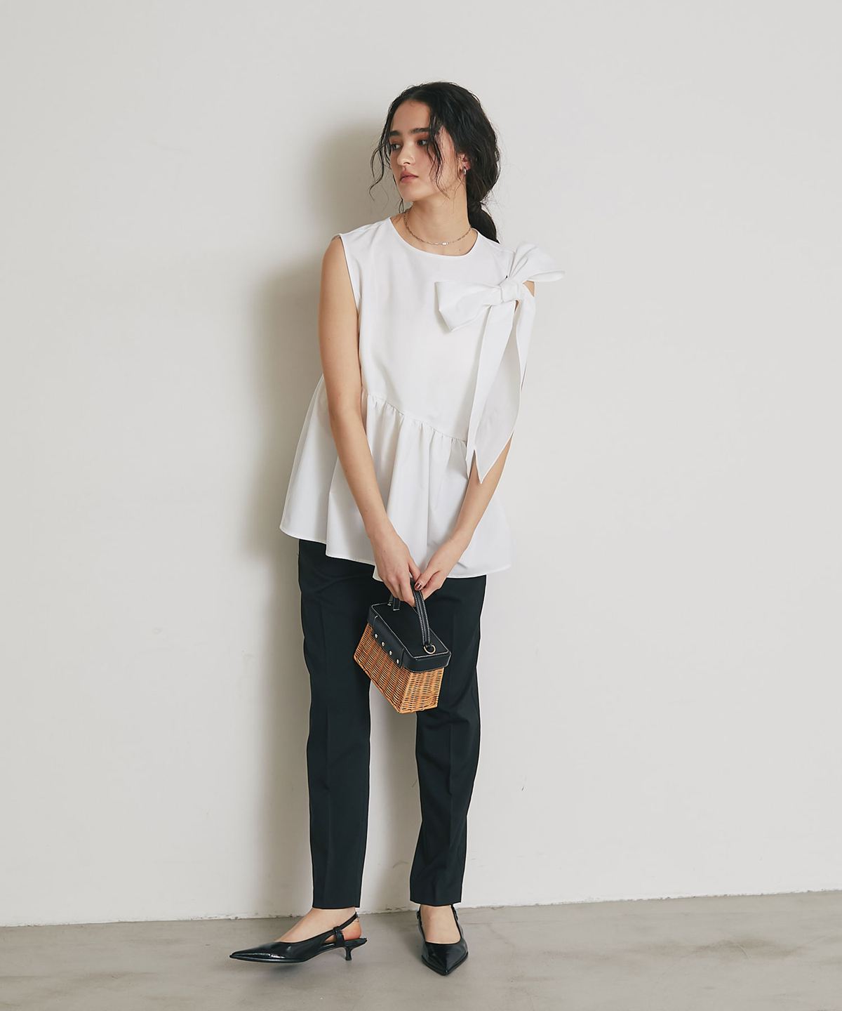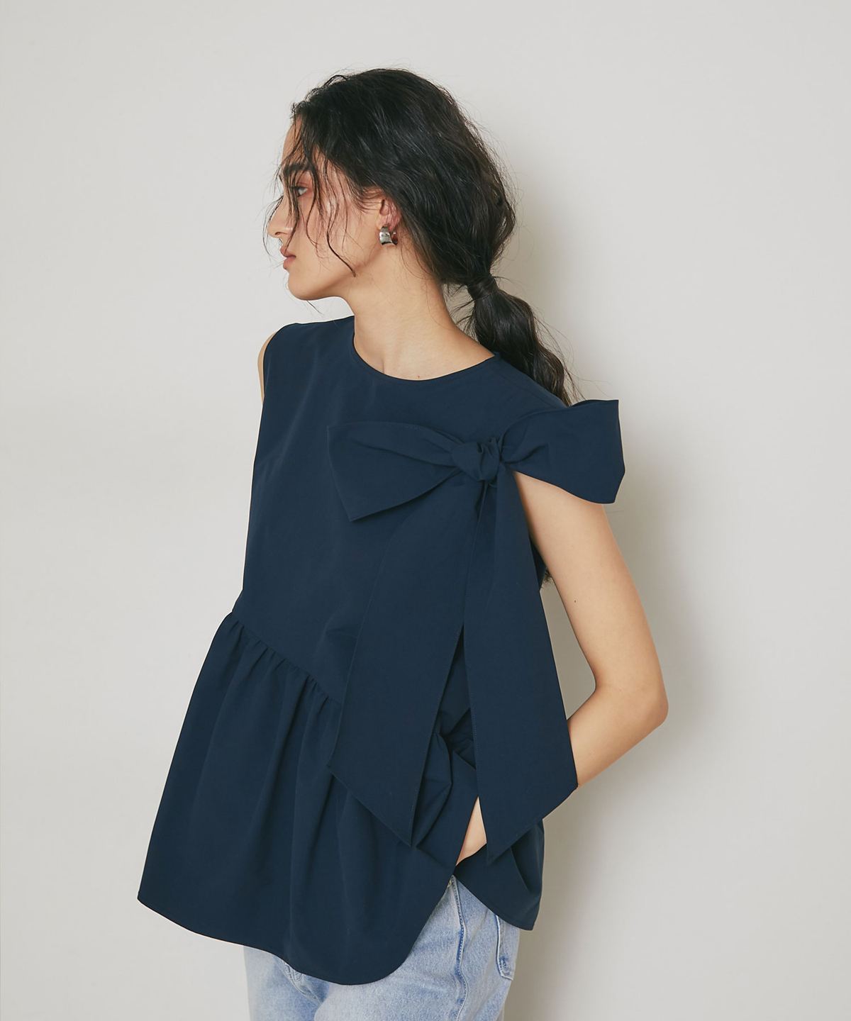 | 商品説明 | : | 視線を奪う大胆なリボン。一枚でモードな華やぎを纏う、主役級ブラウス。 アシンメトリーな切り替えから広がるペプラムシルエットと、肩に配したビッグリボンがドラマチックなノースリーブブラウス。 ハリのある上品な素材感が、甘さを抑えてモードな印象に。 お腹周りをふんわりカバーする絶妙な丈感で、スタイルアップ効果も抜群。 細身のパンツと合わせたメリハリのある着こなしはもちろん、 デニムで外した大人のカジュアルダウンもおすすめです。 デイリーから華やかなお出かけまで、日常を特別にする主役級アイテムです。 |