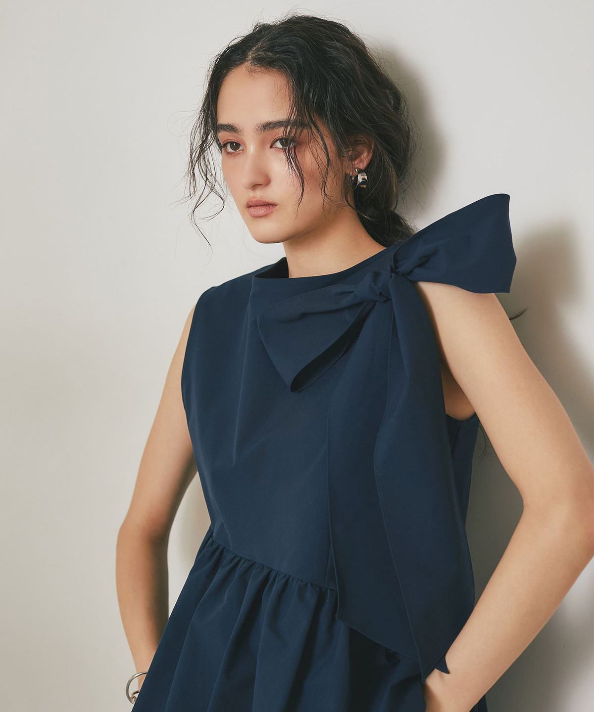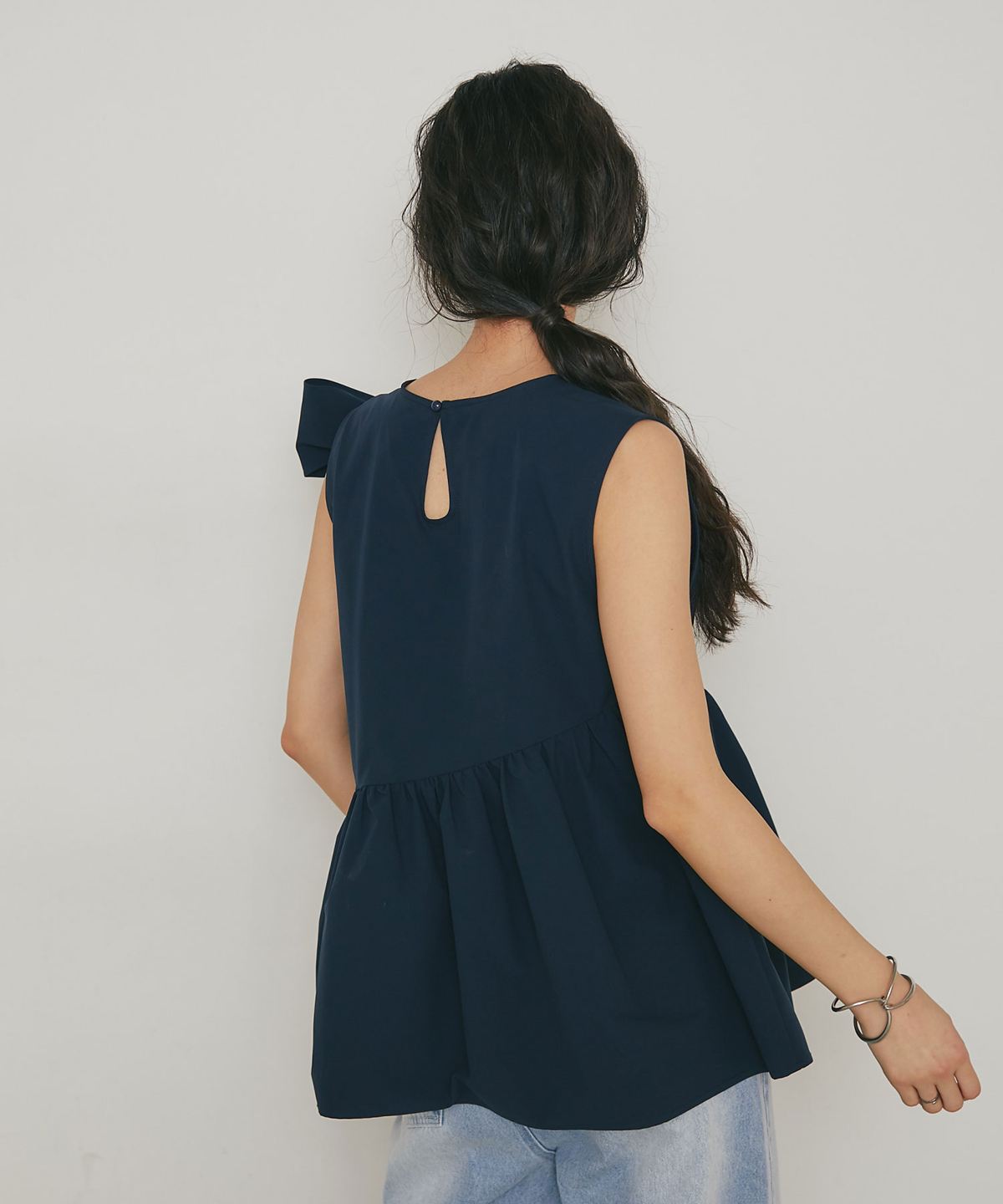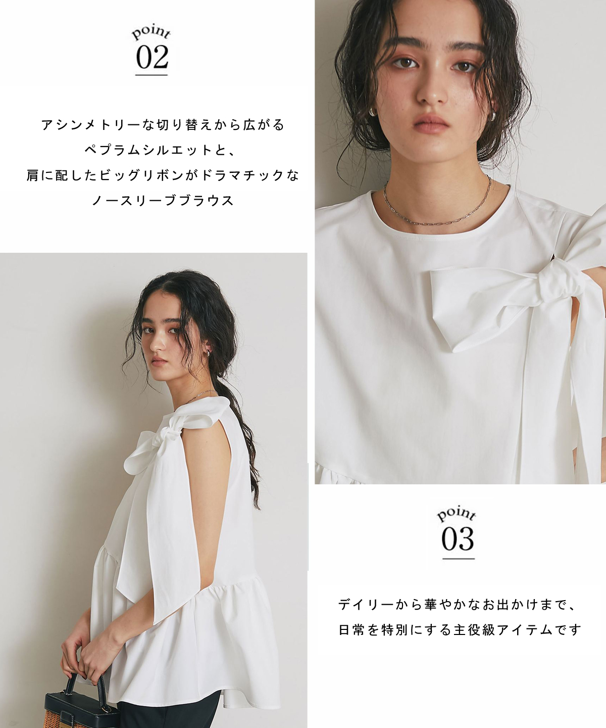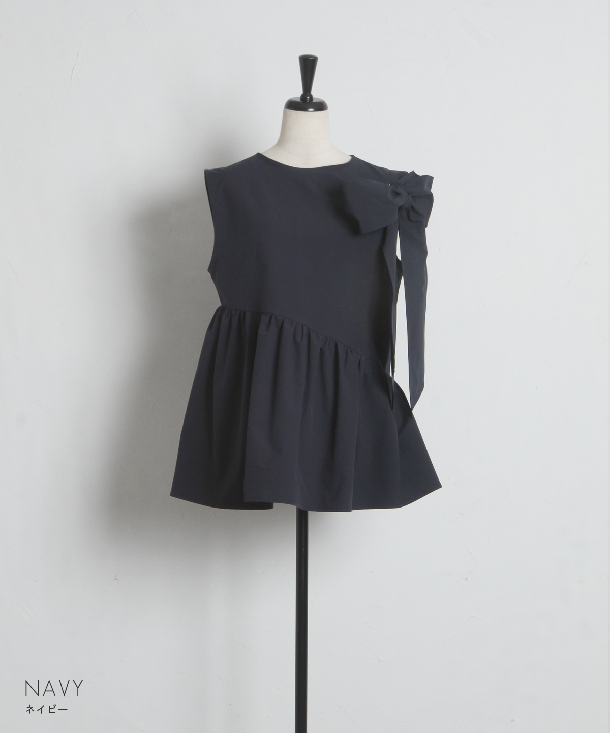 | 商品説明 | : | 視線を奪う大胆なリボン。一枚でモードな華やぎを纏う、主役級ブラウス。 アシンメトリーな切り替えから広がるペプラムシルエットと、肩に配したビッグリボンがドラマチックなノースリーブブラウス。 ハリのある上品な素材感が、甘さを抑えてモードな印象に。 お腹周りをふんわりカバーする絶妙な丈感で、スタイルアップ効果も抜群。 細身のパンツと合わせたメリハリのある着こなしはもちろん、 デニムで外した大人のカジュアルダウンもおすすめです。 デイリーから華やかなお出かけまで、日常を特別にする主役級アイテムです。 |