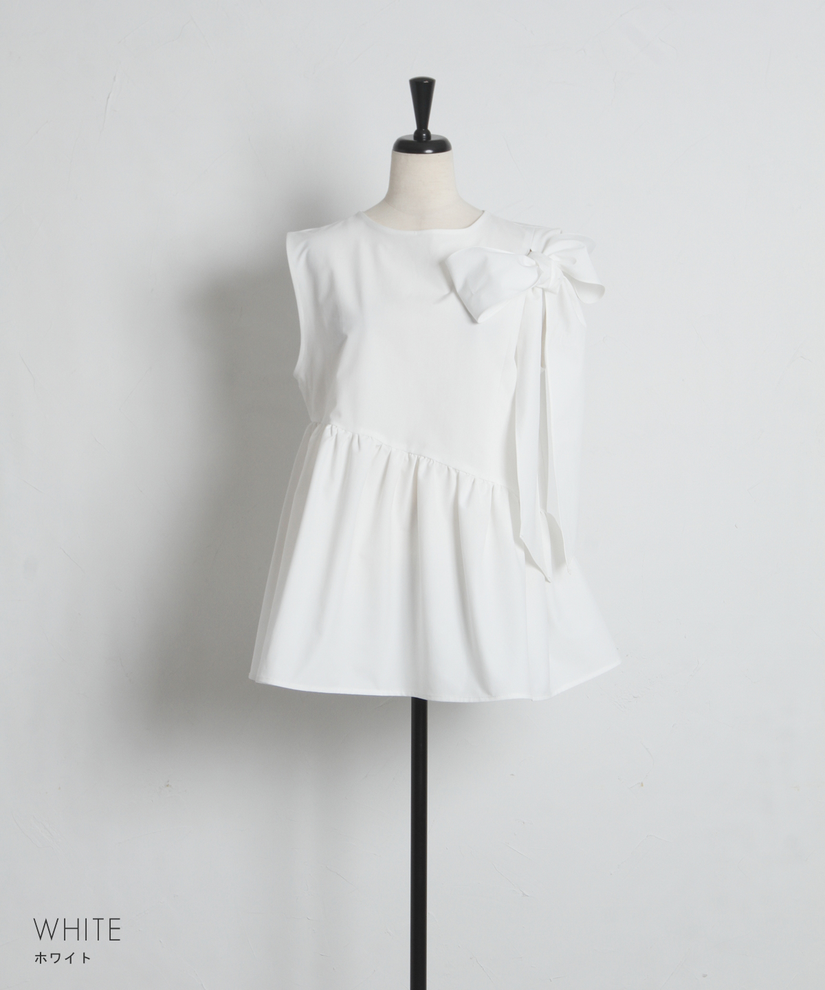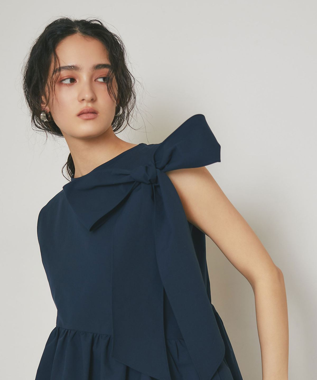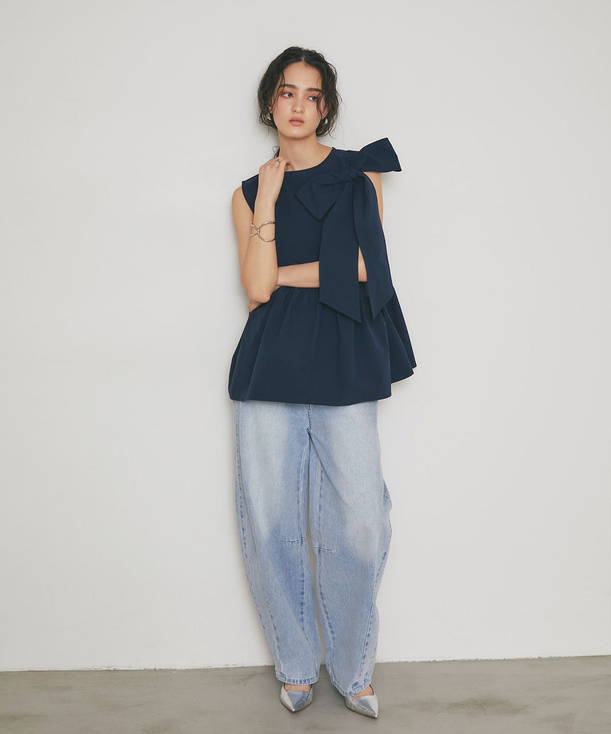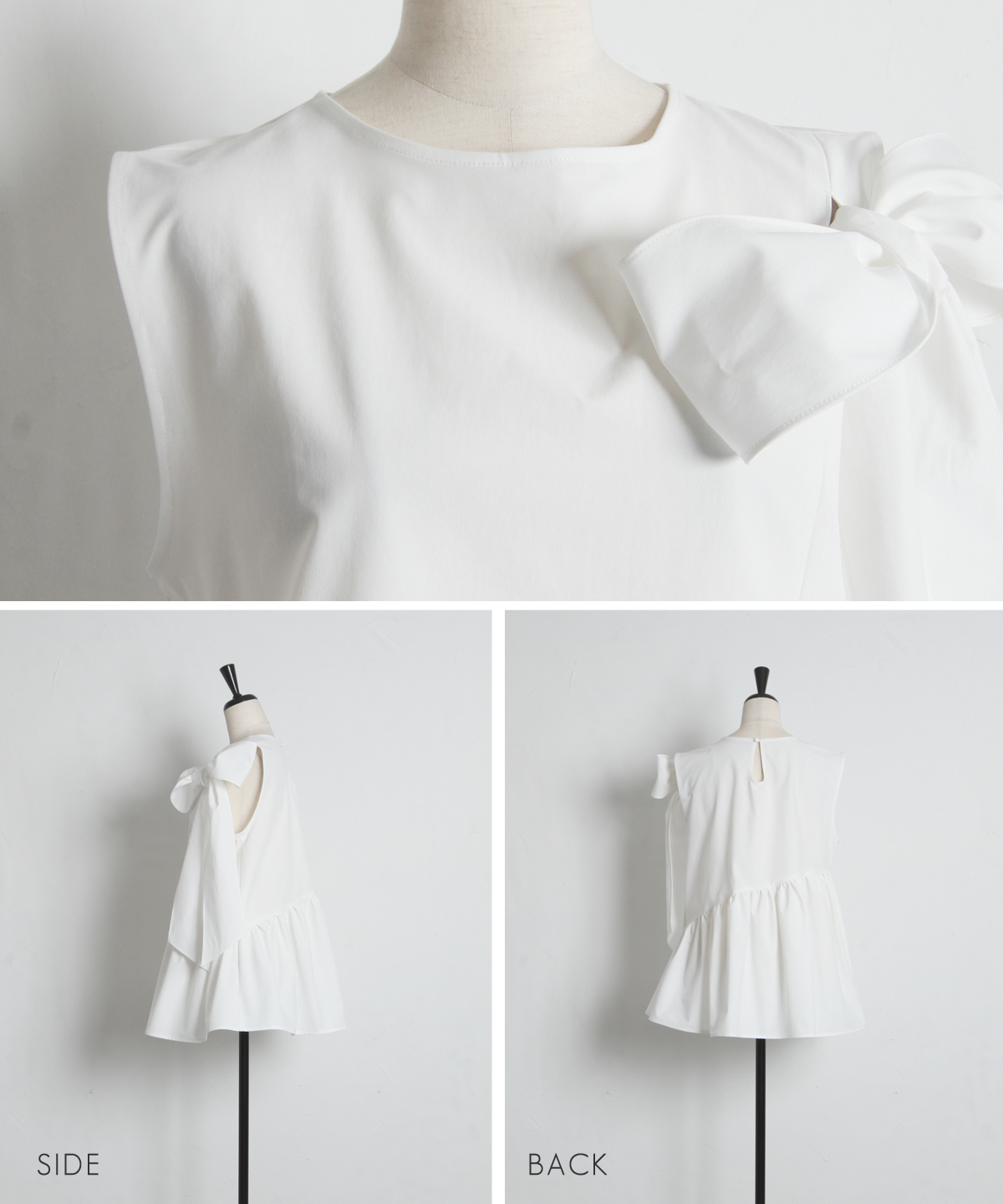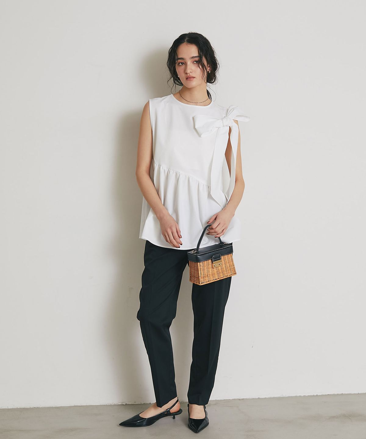 | 商品説明 | : | 視線を奪う大胆なリボン。一枚でモードな華やぎを纏う、主役級ブラウス。 アシンメトリーな切り替えから広がるペプラムシルエットと、肩に配したビッグリボンがドラマチックなノースリーブブラウス。 ハリのある上品な素材感が、甘さを抑えてモードな印象に。 お腹周りをふんわりカバーする絶妙な丈感で、スタイルアップ効果も抜群。 細身のパンツと合わせたメリハリのある着こなしはもちろん、 デニムで外した大人のカジュアルダウンもおすすめです。 デイリーから華やかなお出かけまで、日常を特別にする主役級アイテムです。 |
