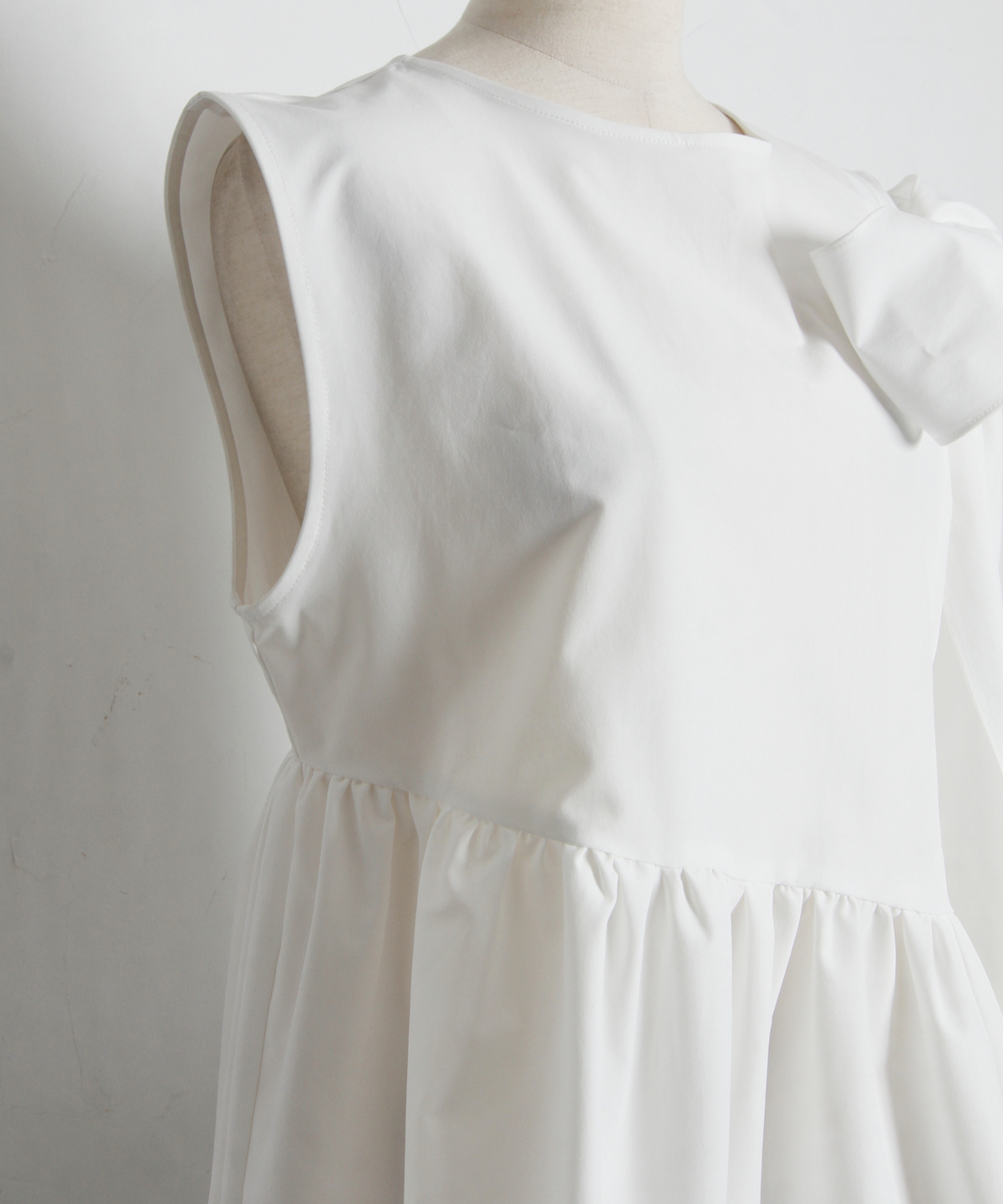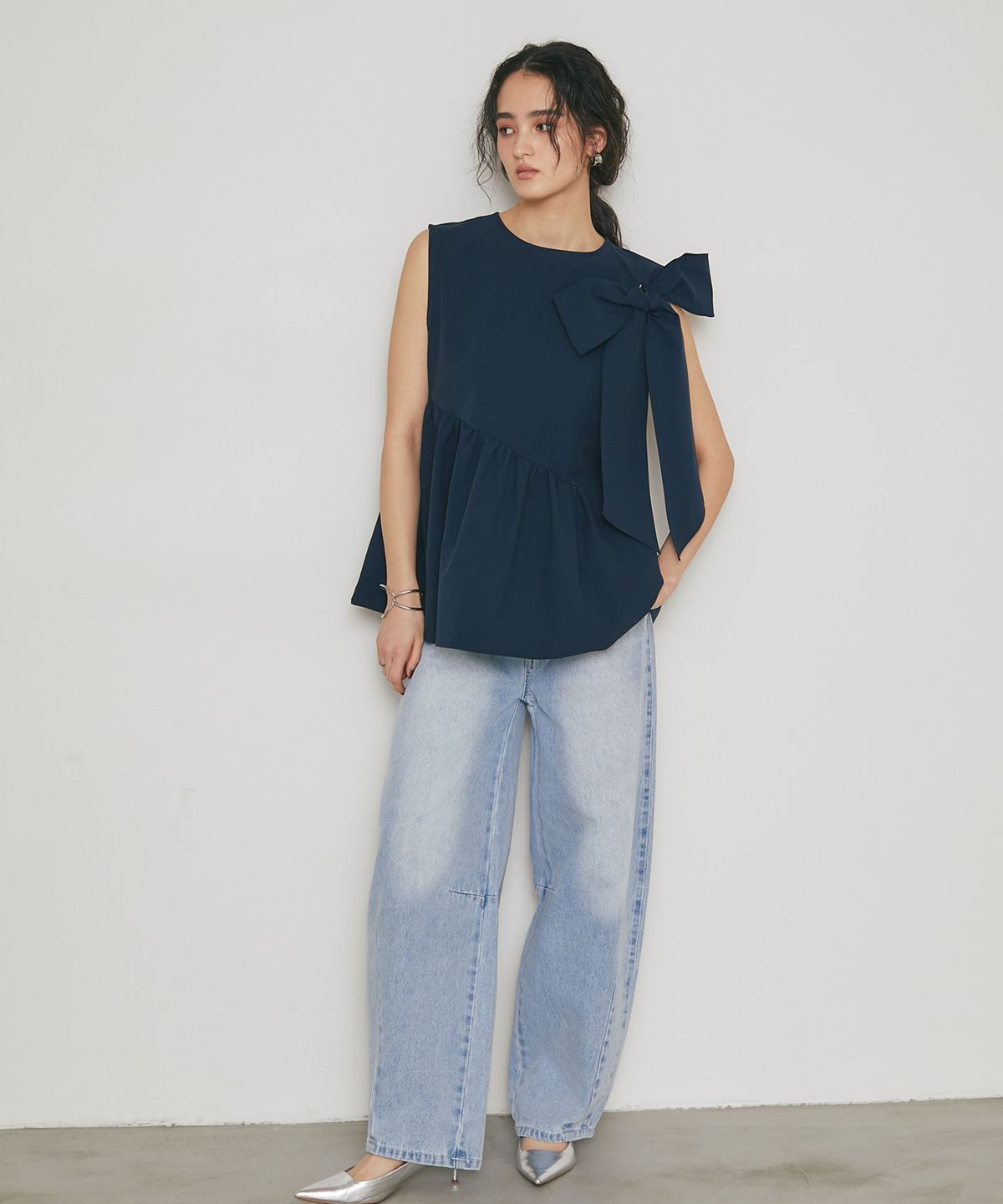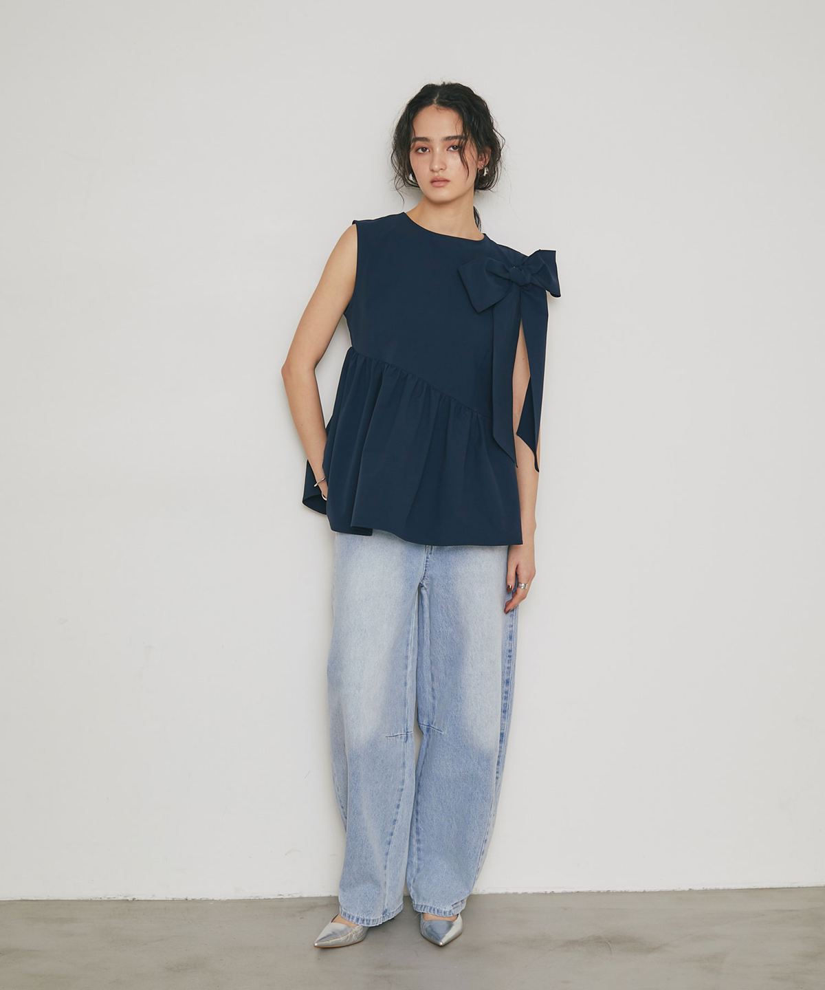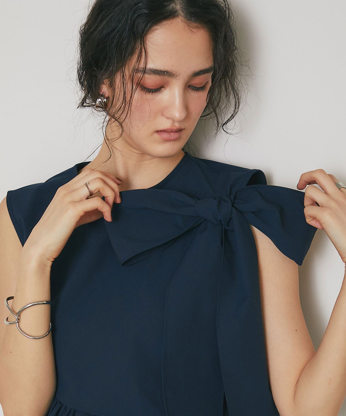 | 商品説明 | : | 視線を奪う大胆なリボン。一枚でモードな華やぎを纏う、主役級ブラウス。 アシンメトリーな切り替えから広がるペプラムシルエットと、肩に配したビッグリボンがドラマチックなノースリーブブラウス。 ハリのある上品な素材感が、甘さを抑えてモードな印象に。 お腹周りをふんわりカバーする絶妙な丈感で、スタイルアップ効果も抜群。 細身のパンツと合わせたメリハリのある着こなしはもちろん、 デニムで外した大人のカジュアルダウンもおすすめです。 デイリーから華やかなお出かけまで、日常を特別にする主役級アイテムです。 |
