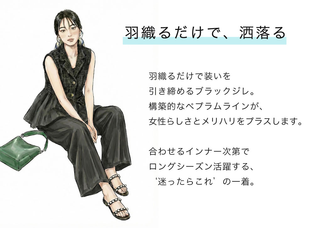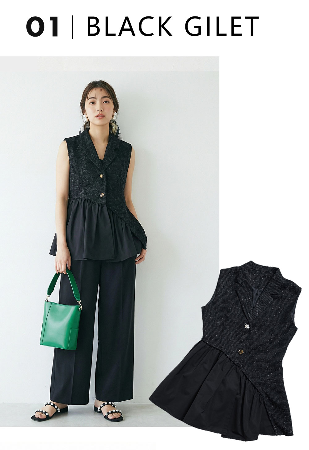 ツイードアシメフリルジレ ¥6,490 ラインタックストレートパンツ ¥6,490