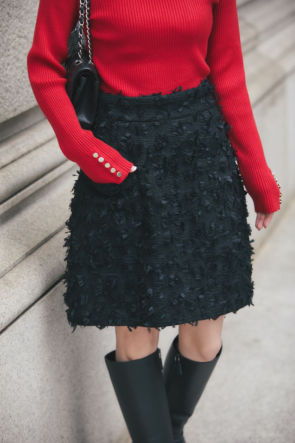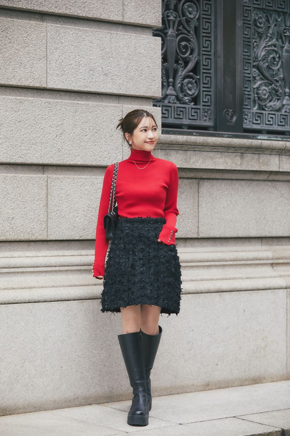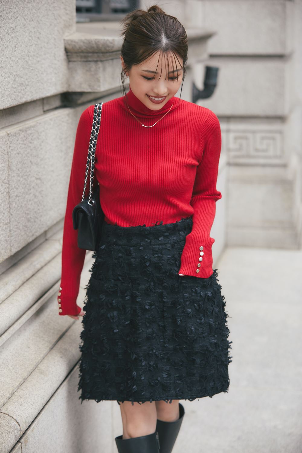 【マシェリコラボ】リボンツイードミニスカート /¥5,390 袖ボタンタートルリブニット /¥3,190