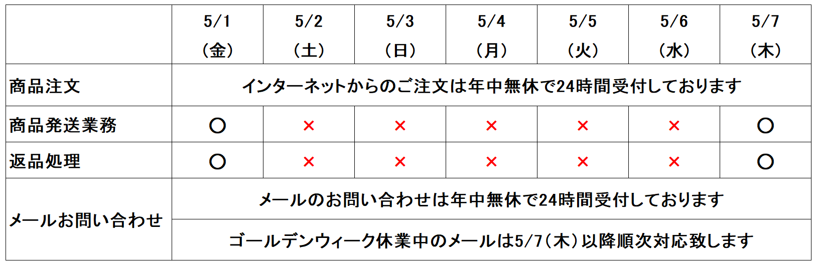 ゴールデンウィーク前発送のご注文受付は2026年4月30日(木)正午までとさせていただきます。