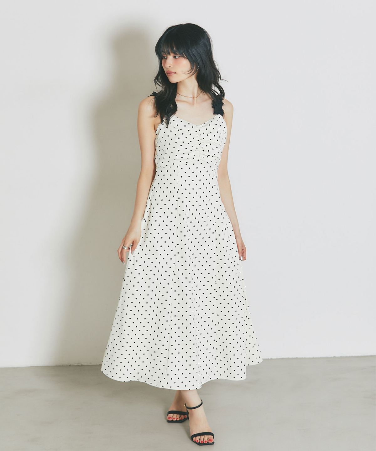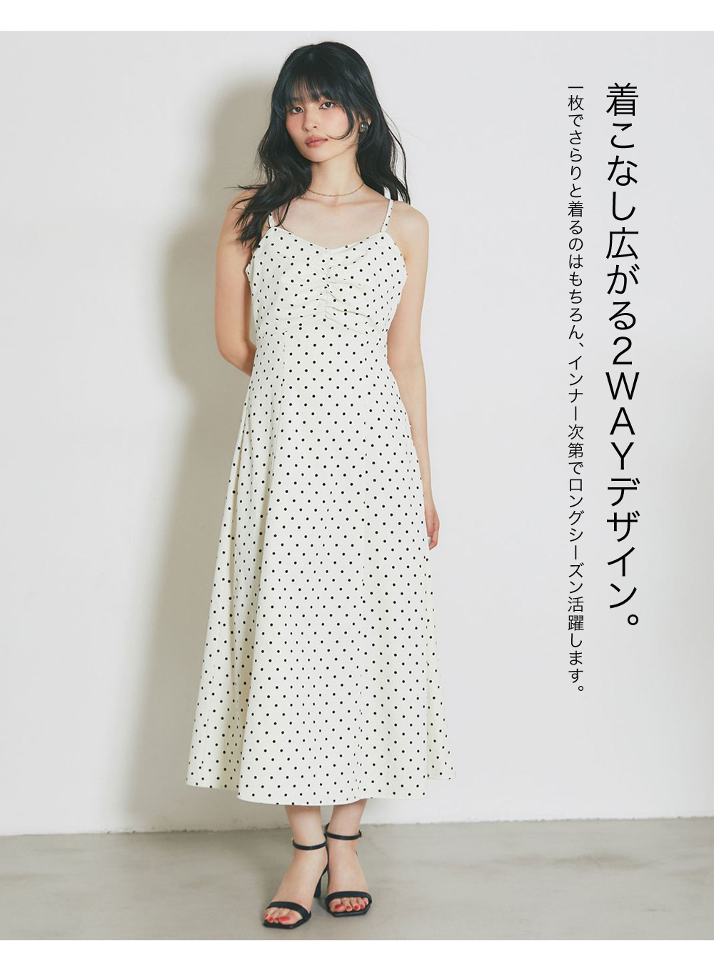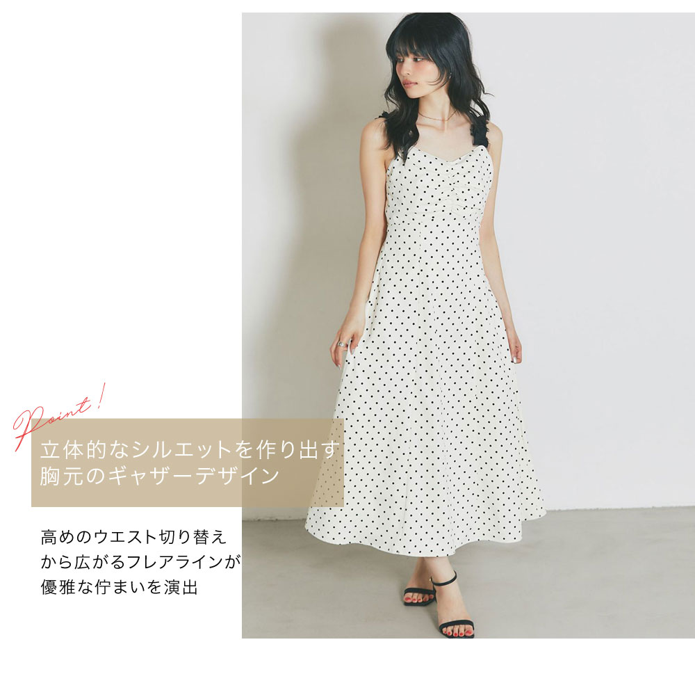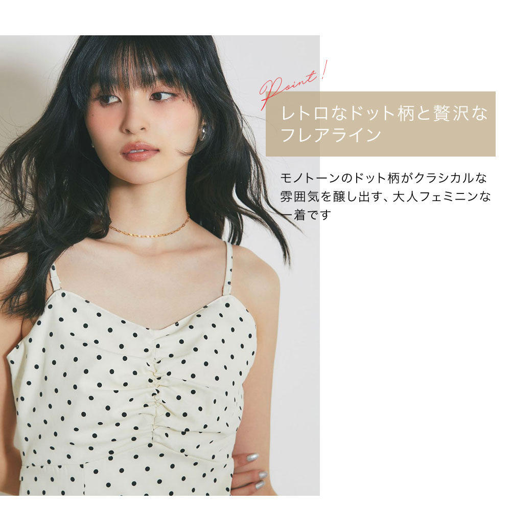 レトロなドット柄と贅沢なフレアラインが目を引く、主役級のキャミソールワンピース。