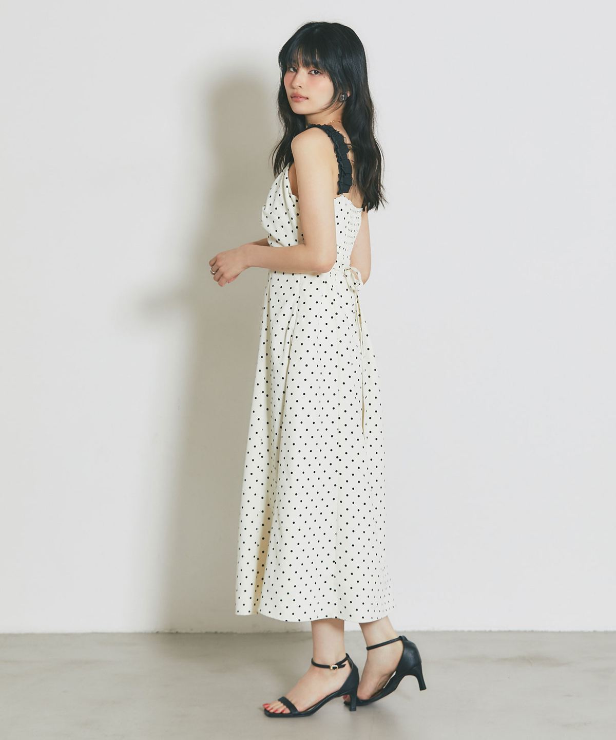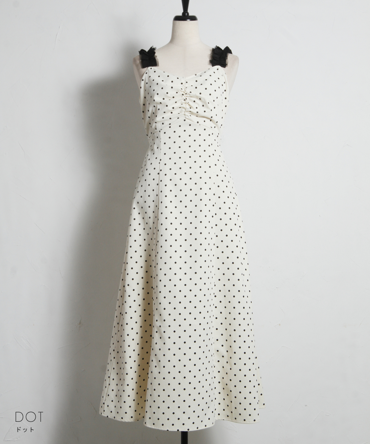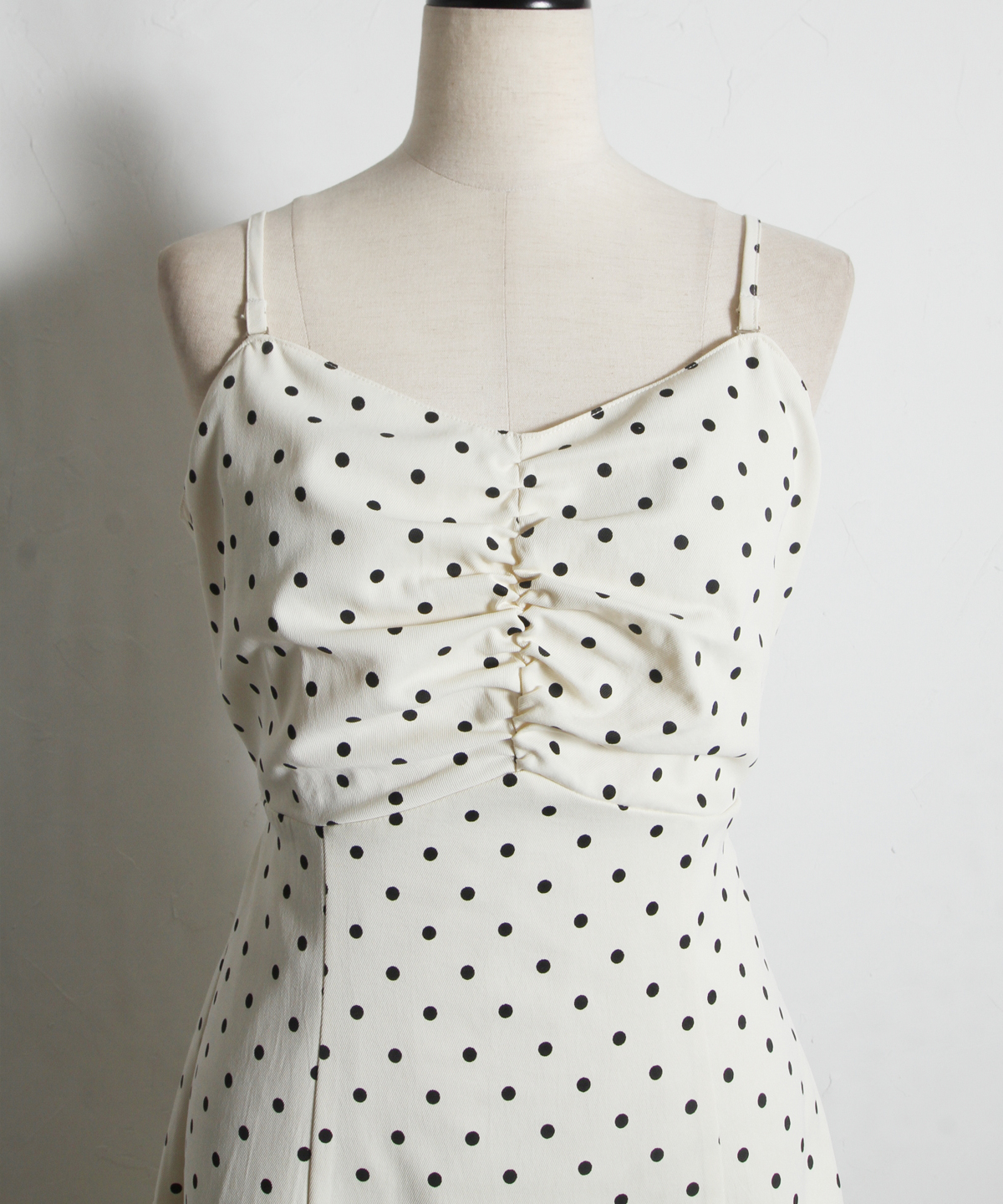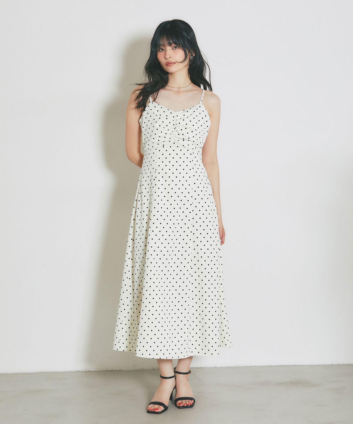 レトロなドット柄と贅沢なフレアラインが目を引く、主役級のキャミソールワンピース。