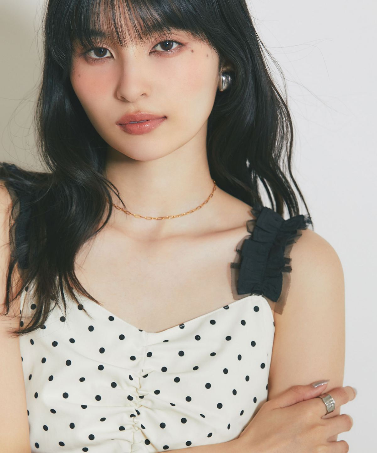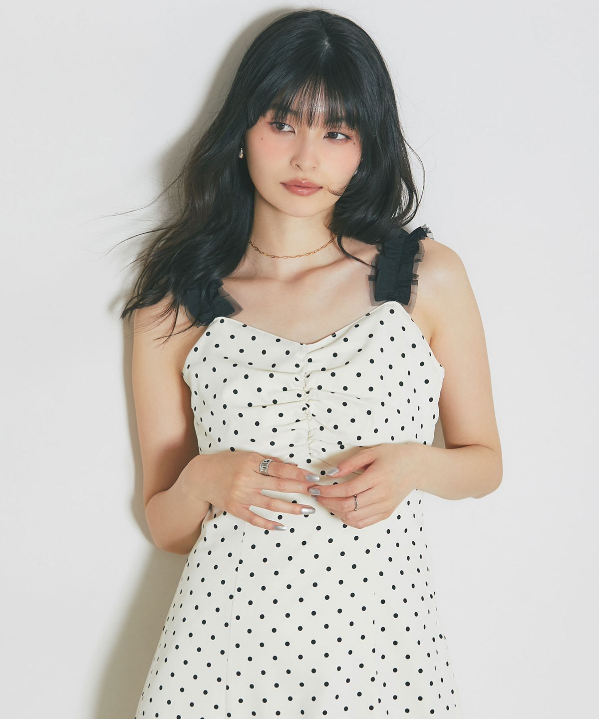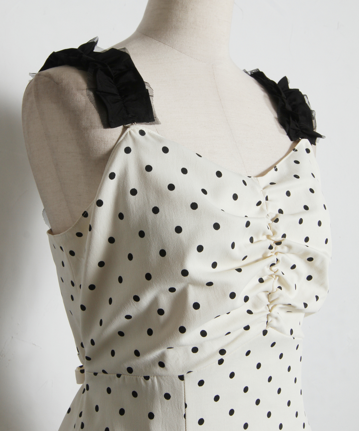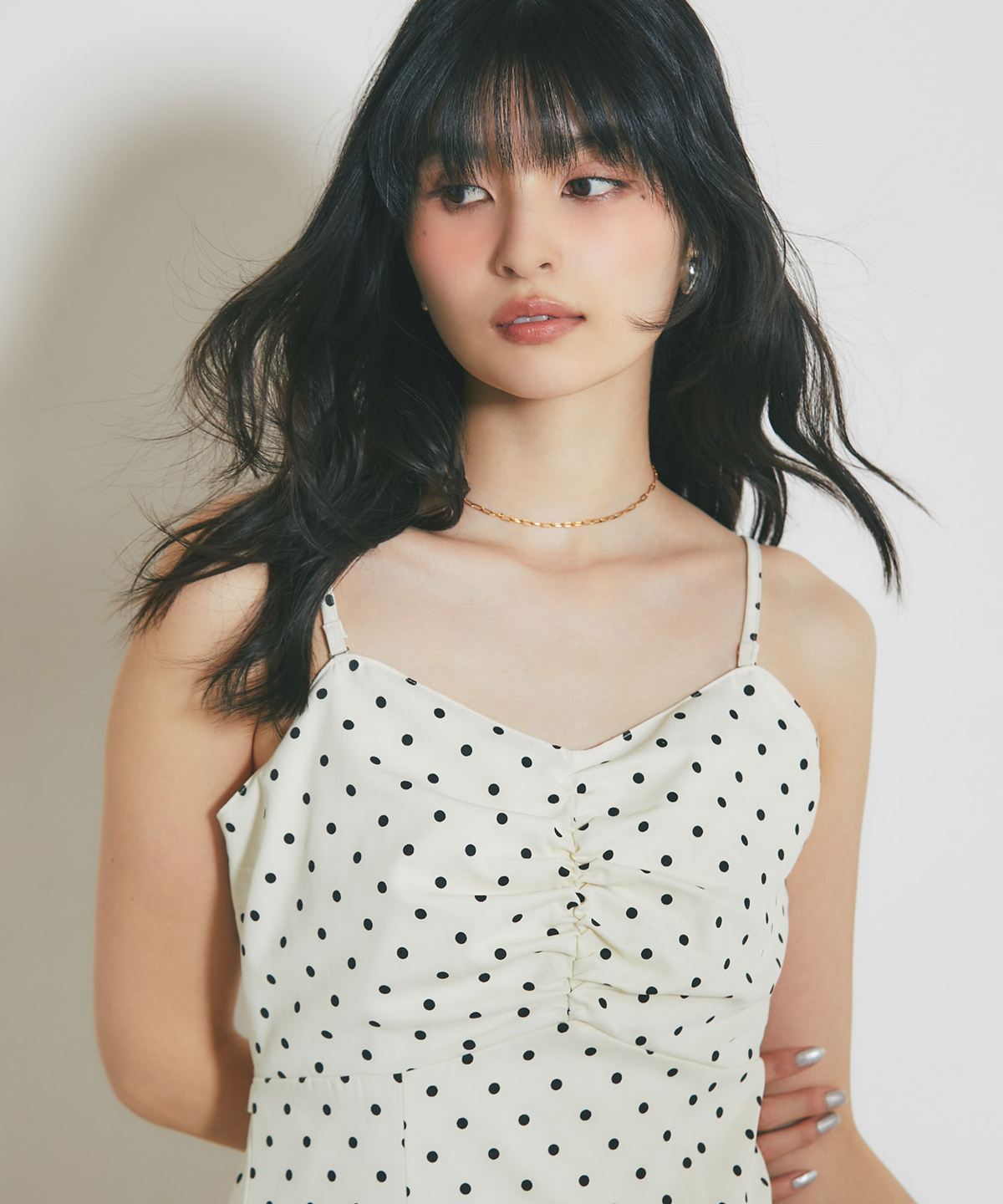 レトロなドット柄と贅沢なフレアラインが目を引く、主役級のキャミソールワンピース。