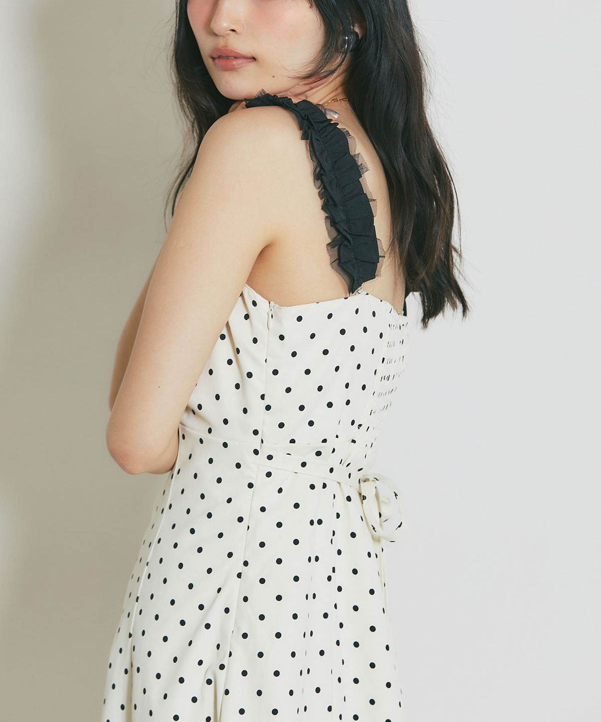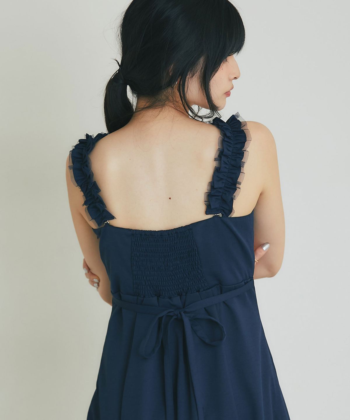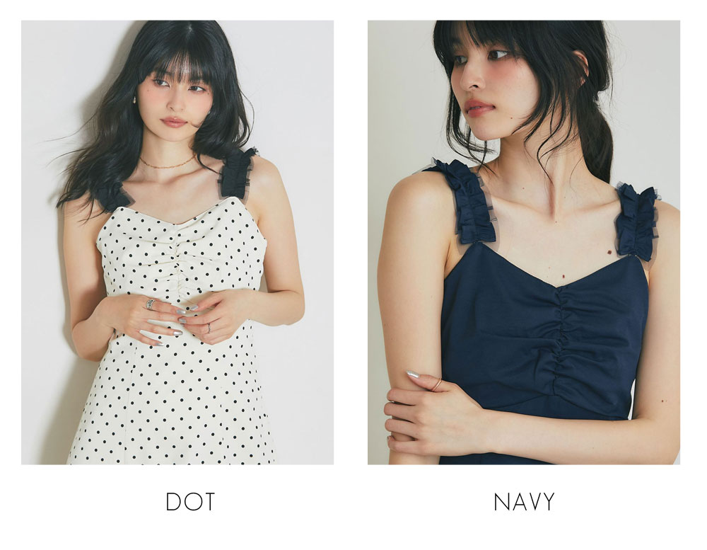 2WAYストラップで、肩紐をフリルにすれば程よいアクセントになり、ロングシーズン着回せる華やかなアイテムです。
