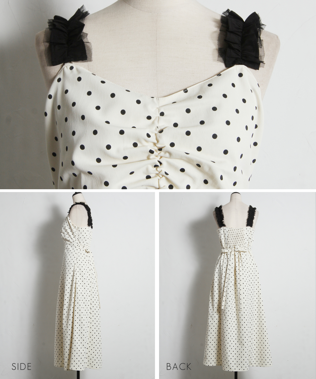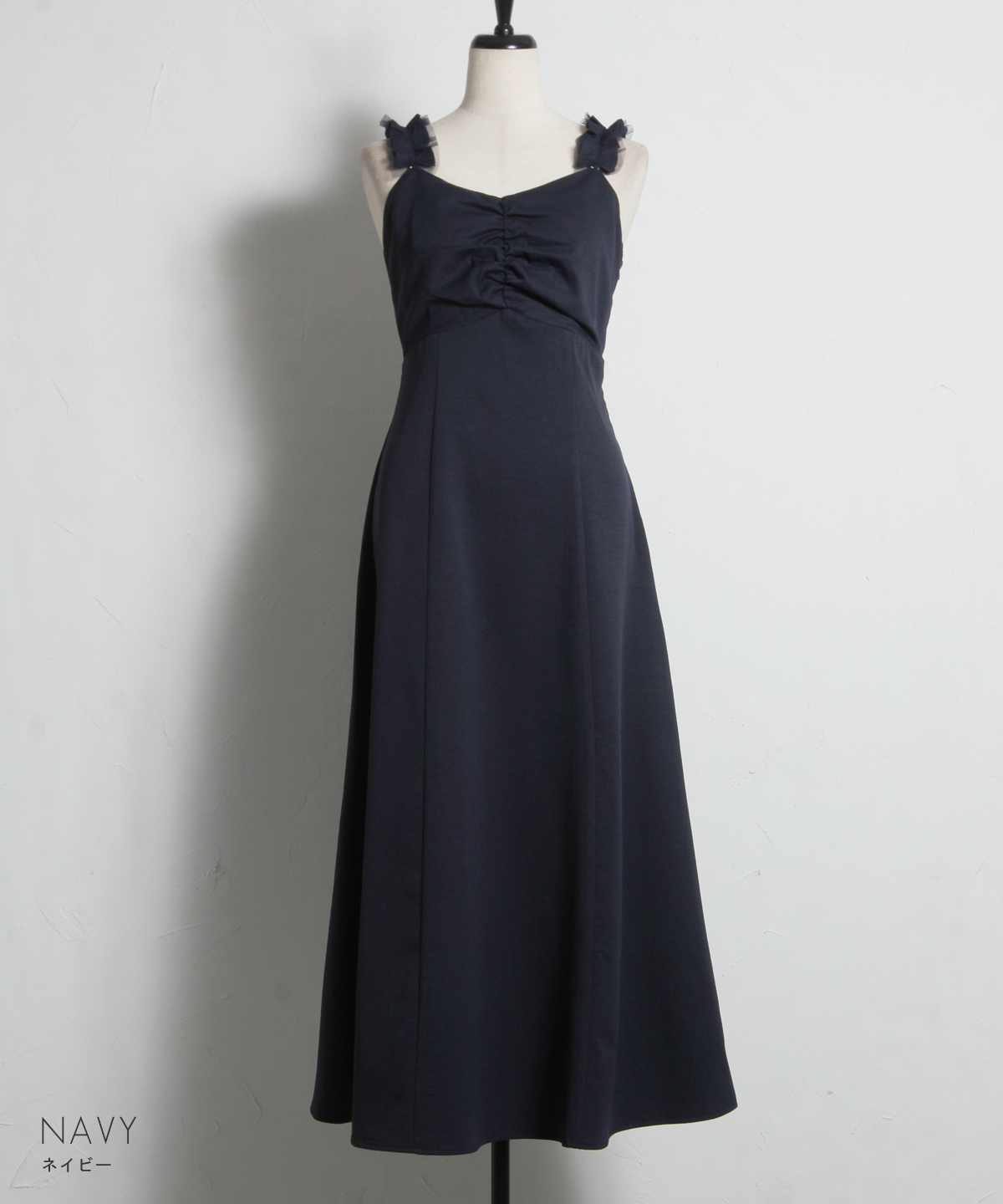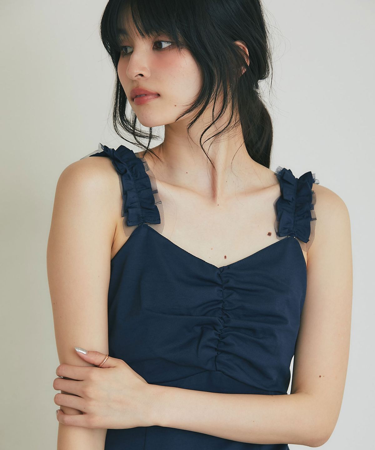 2WAYストラップで、肩紐をフリルにすれば程よいアクセントになり、ロングシーズン着回せる華やかなアイテムです。