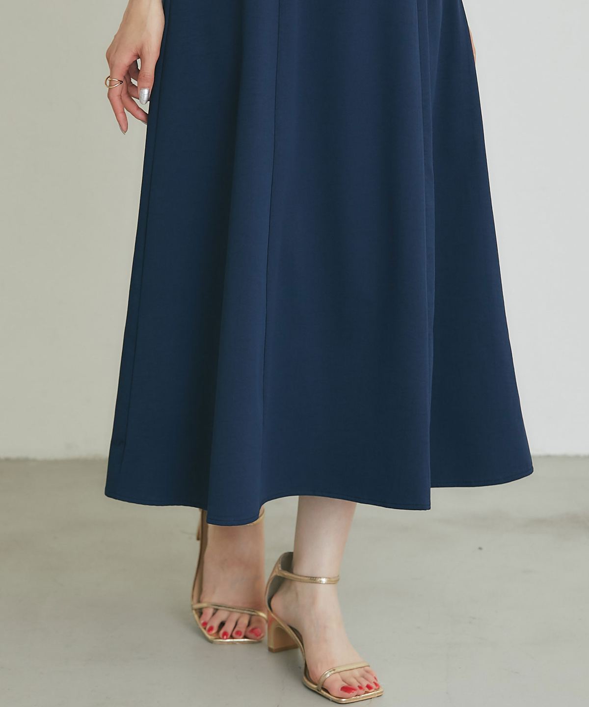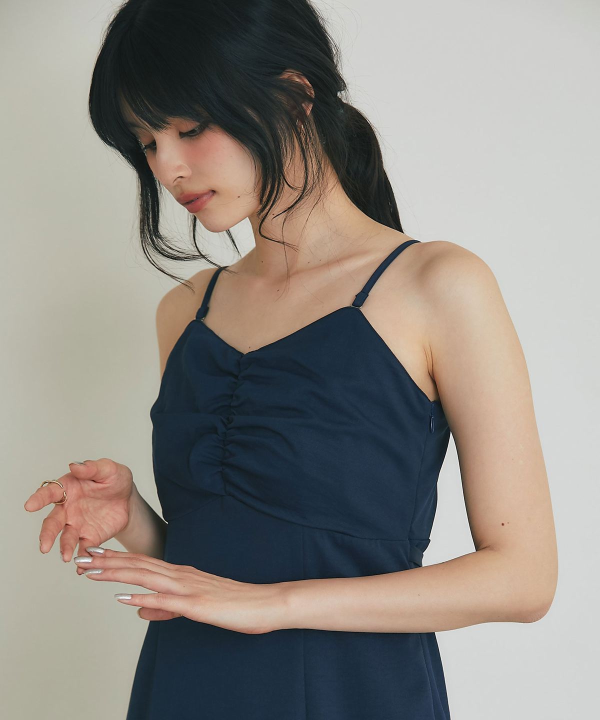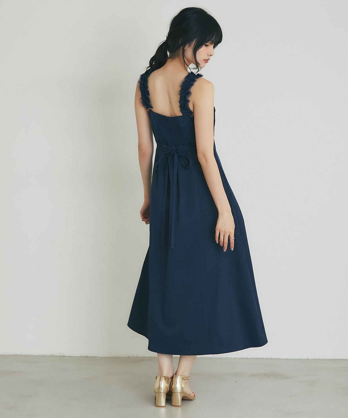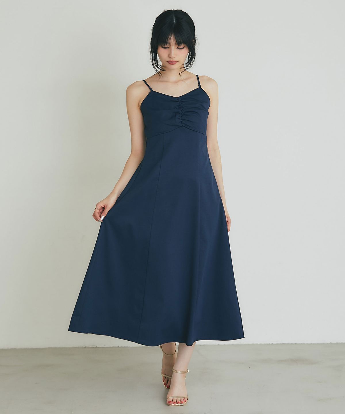 胸元のギャザーデザインが立体的なシルエットを作り出し、高めのウエスト切り替えから広がるフレアラインが優雅な佇まいを演出。