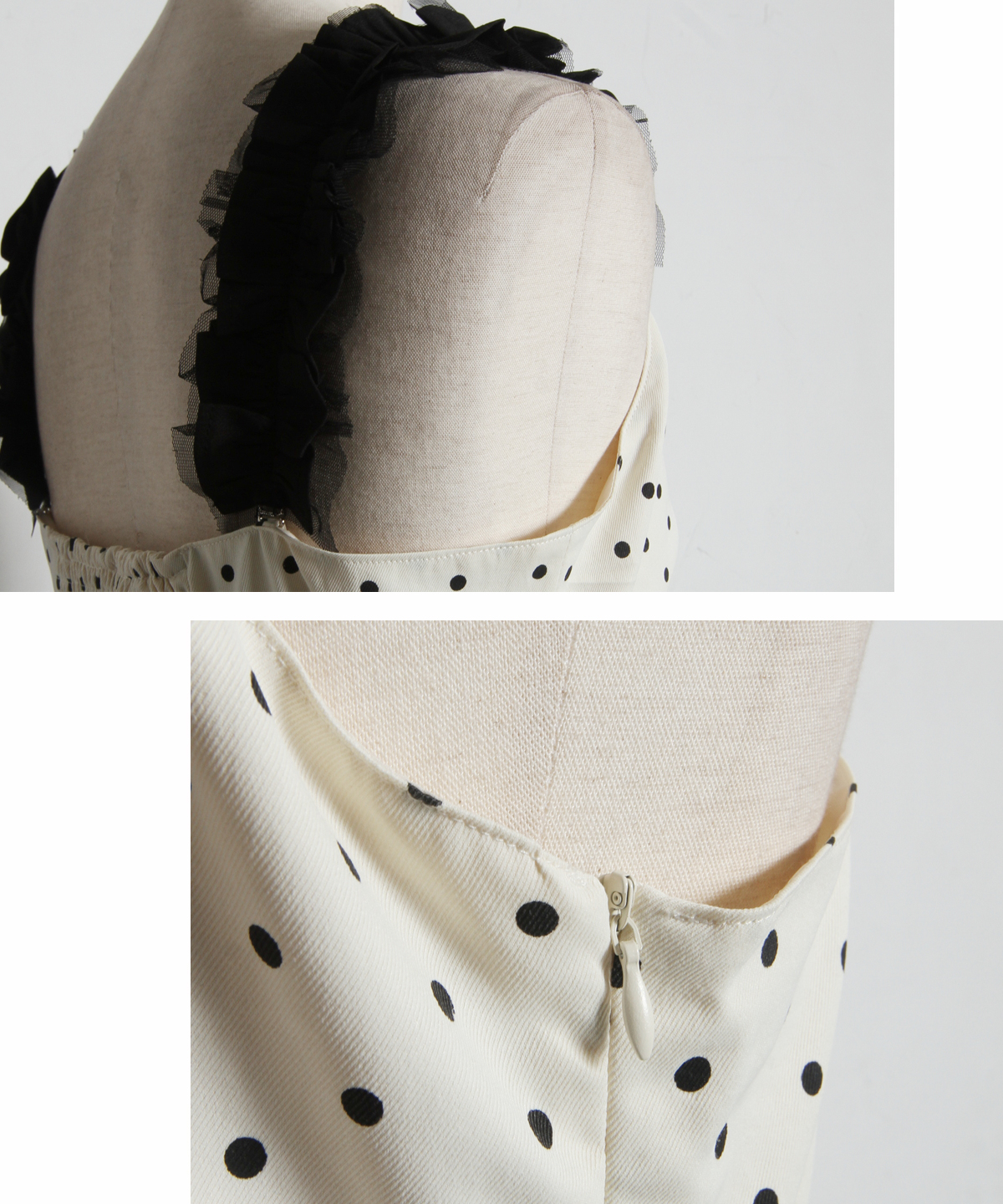 モノトーンのドット柄がクラシカルな雰囲気を醸し出す、大人フェミニンな一着です。