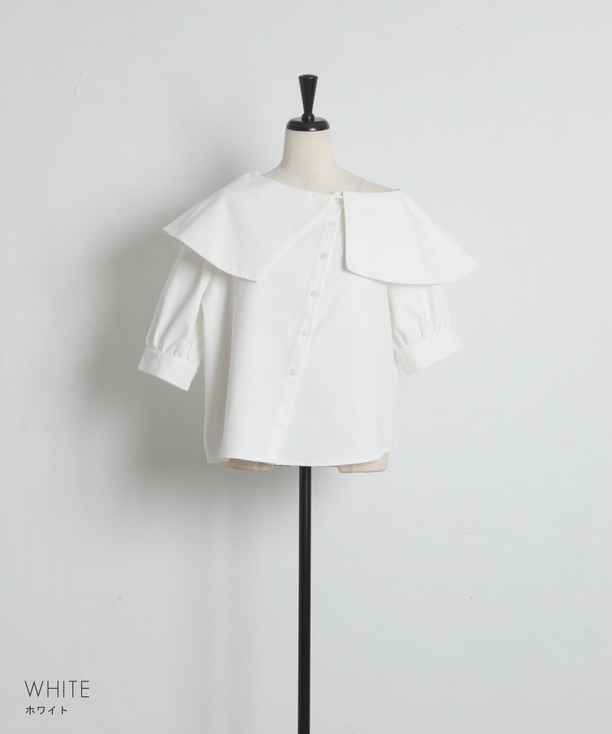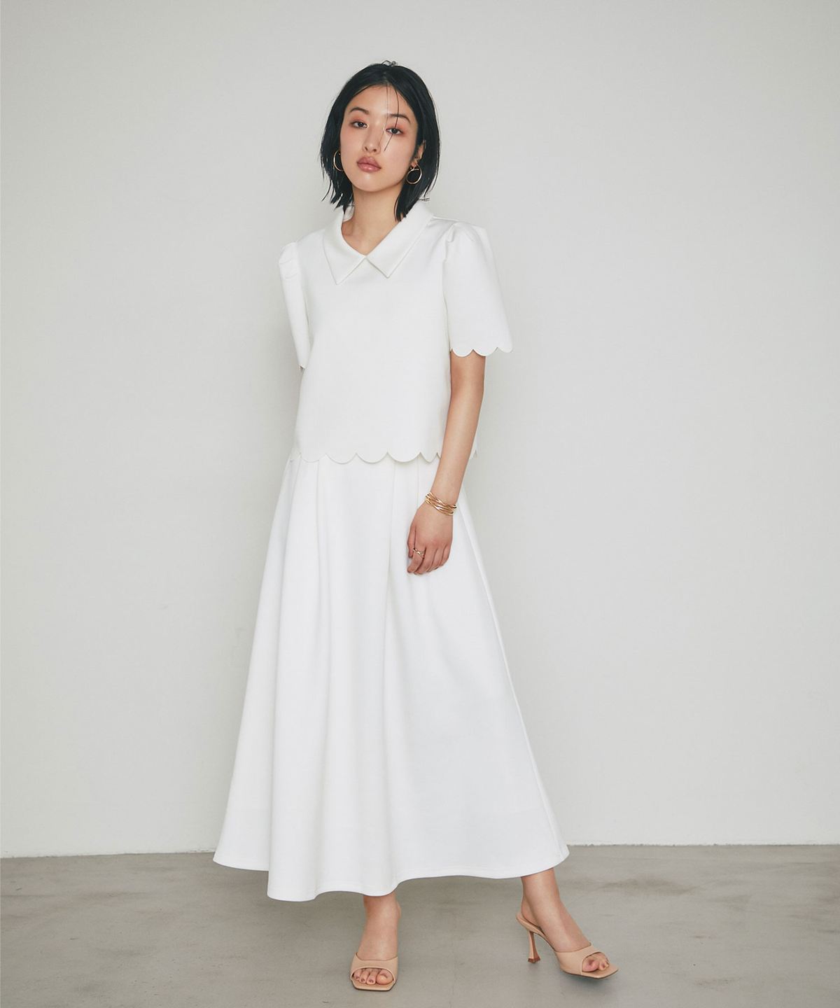 襟付きのデザインと程よいパフスリーブが、クリーンで清楚な印象を演出。