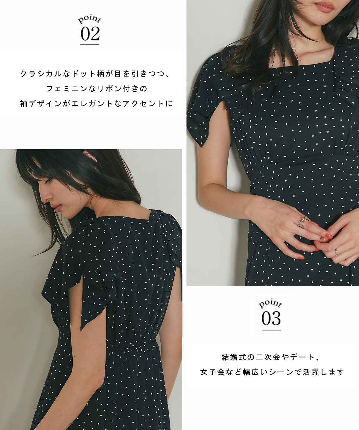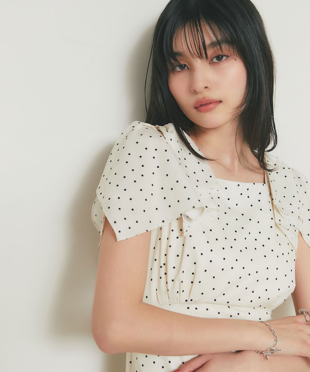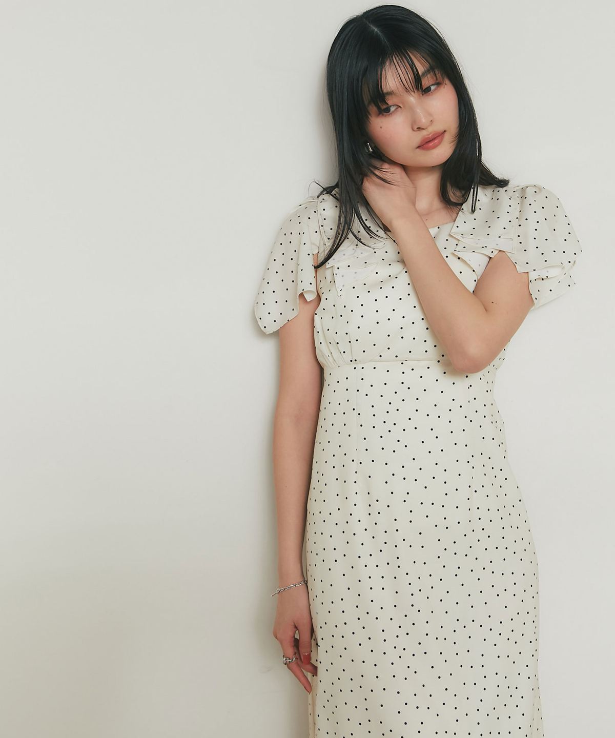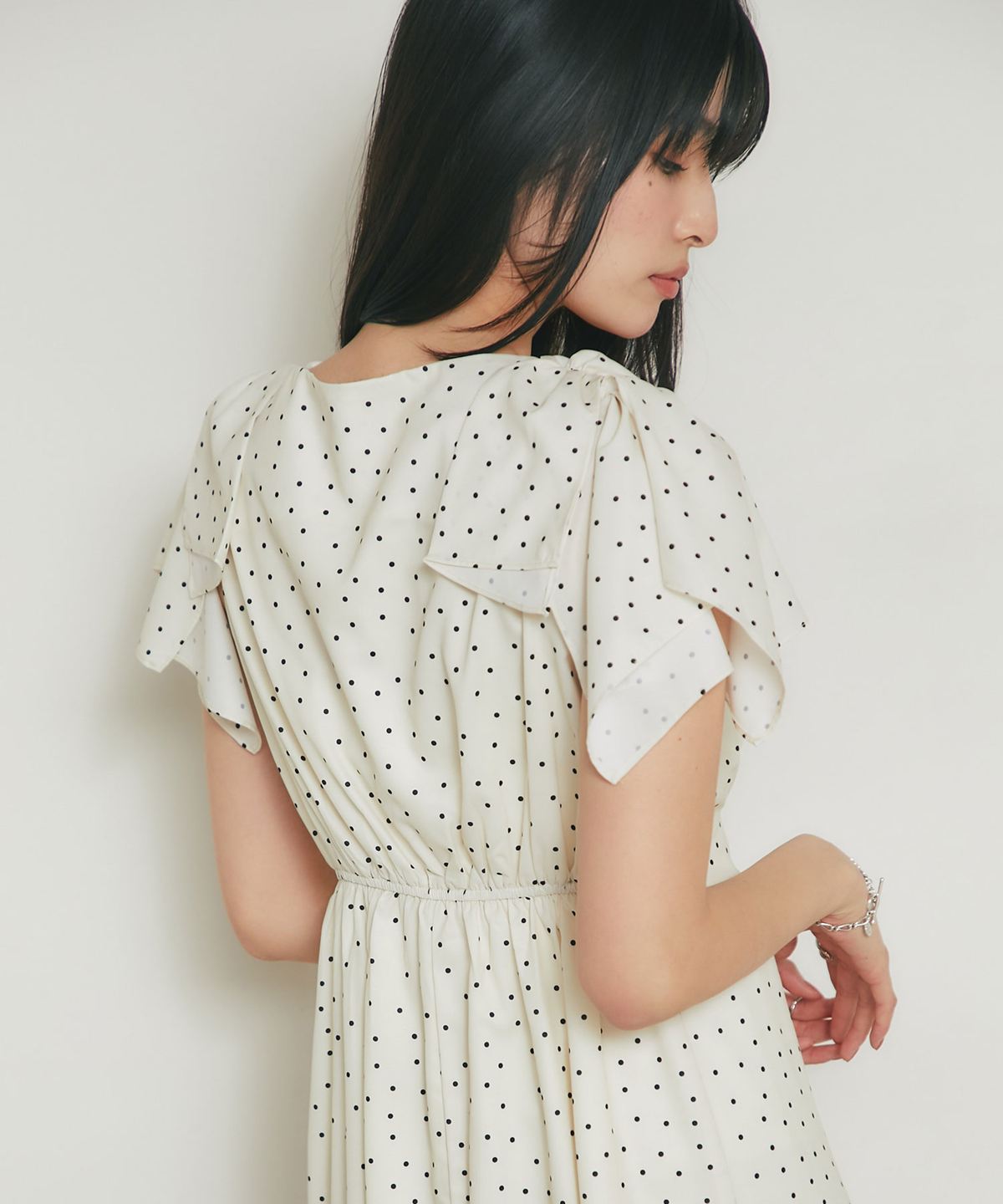 可愛らしさと大人っぽさを両立した ドット柄リボンスリーブワンピース。