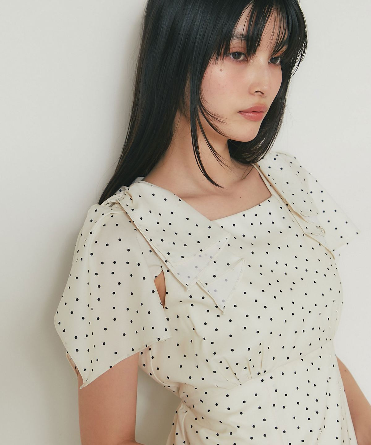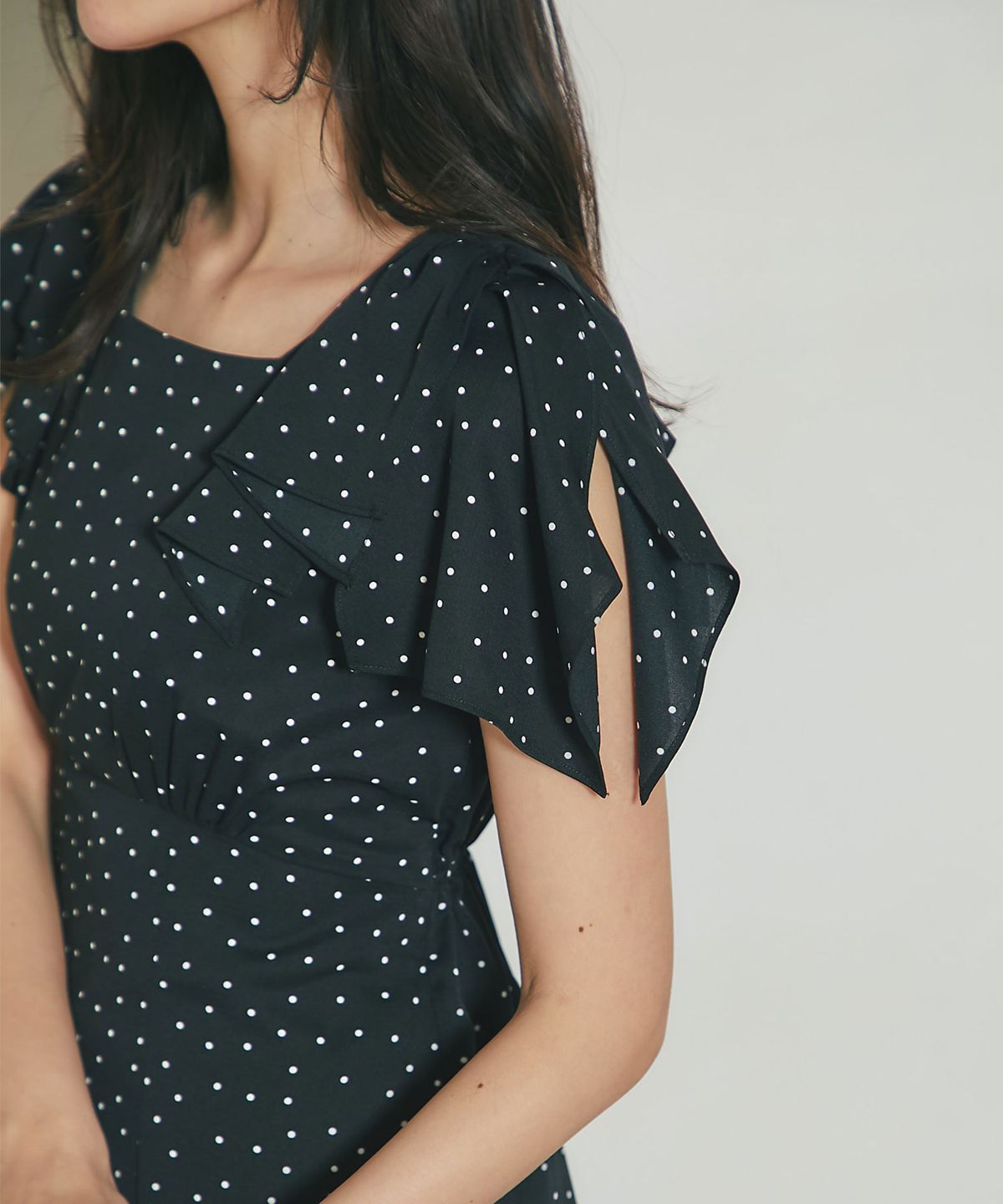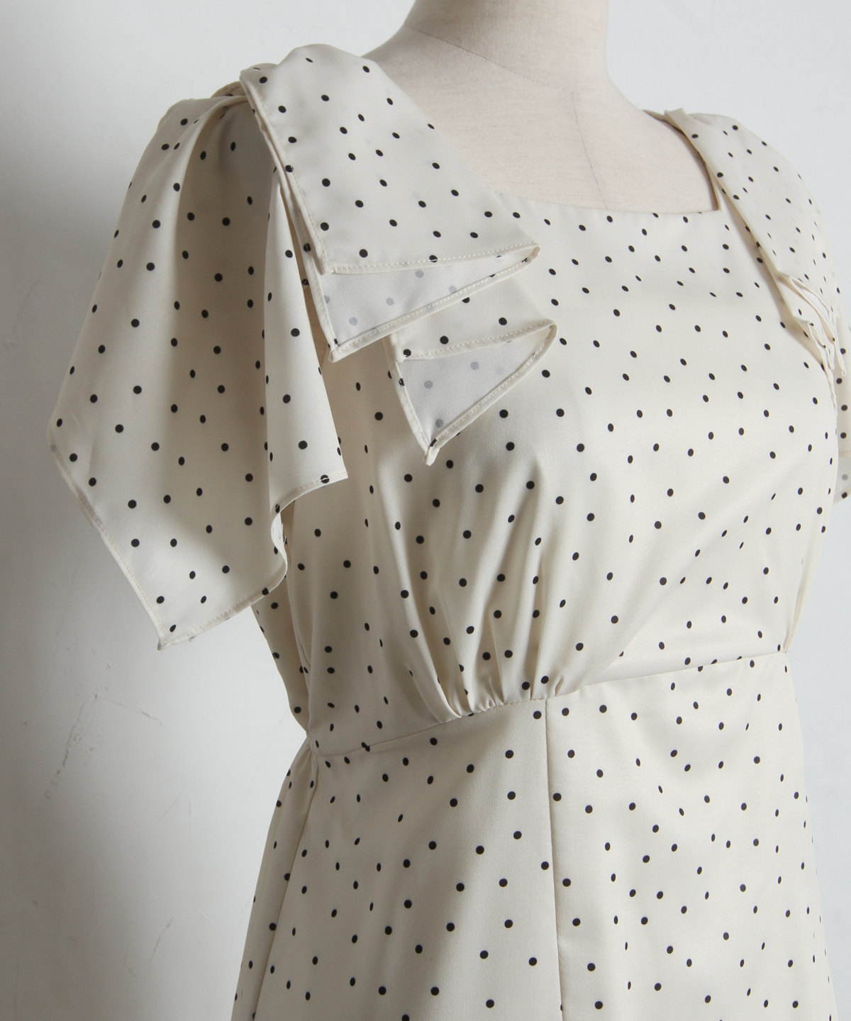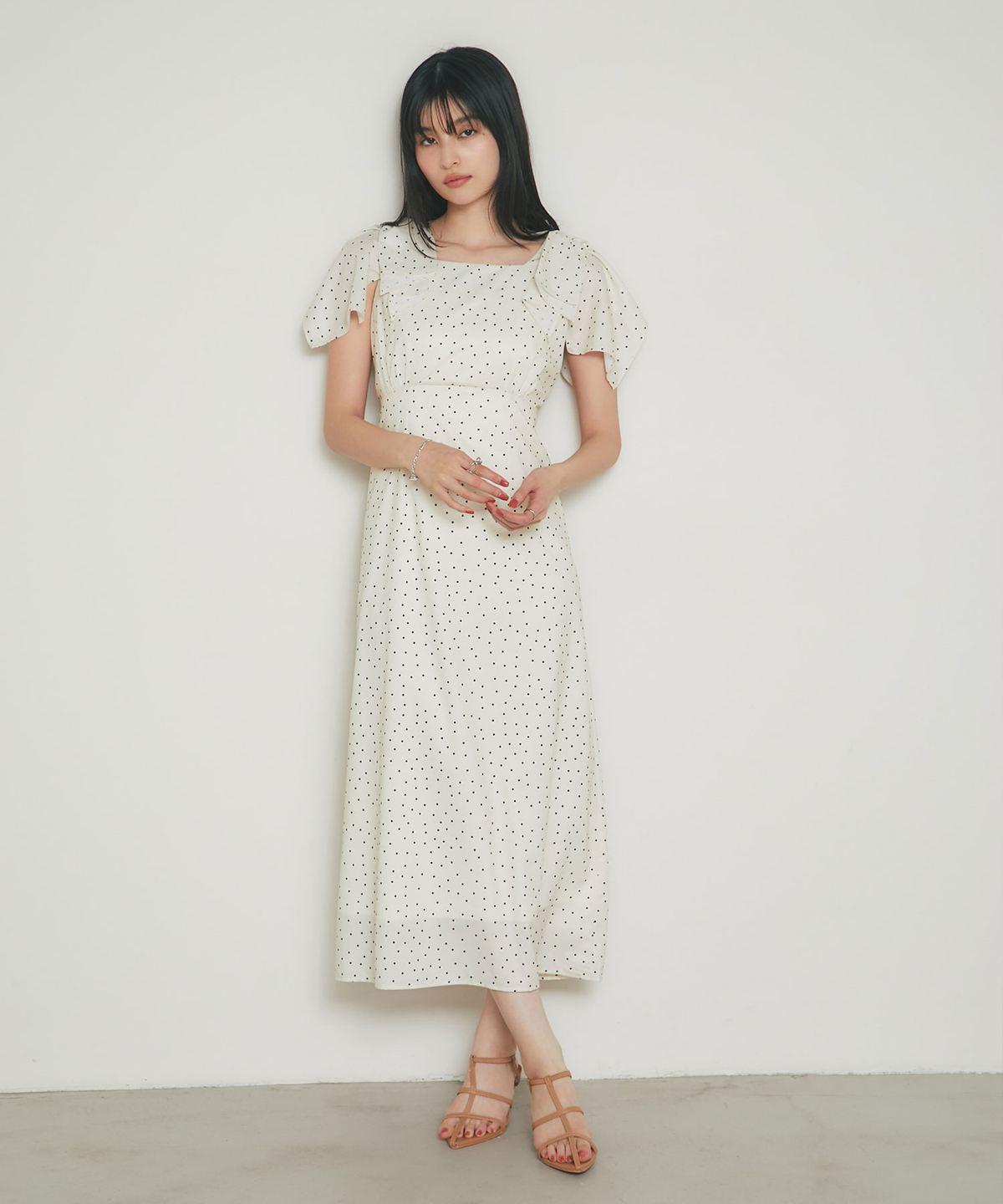 可愛らしさと大人っぽさを両立した ドット柄リボンスリーブワンピース。