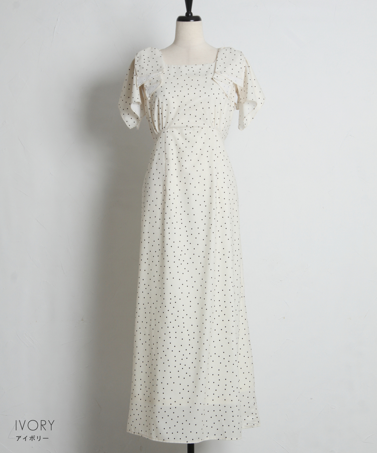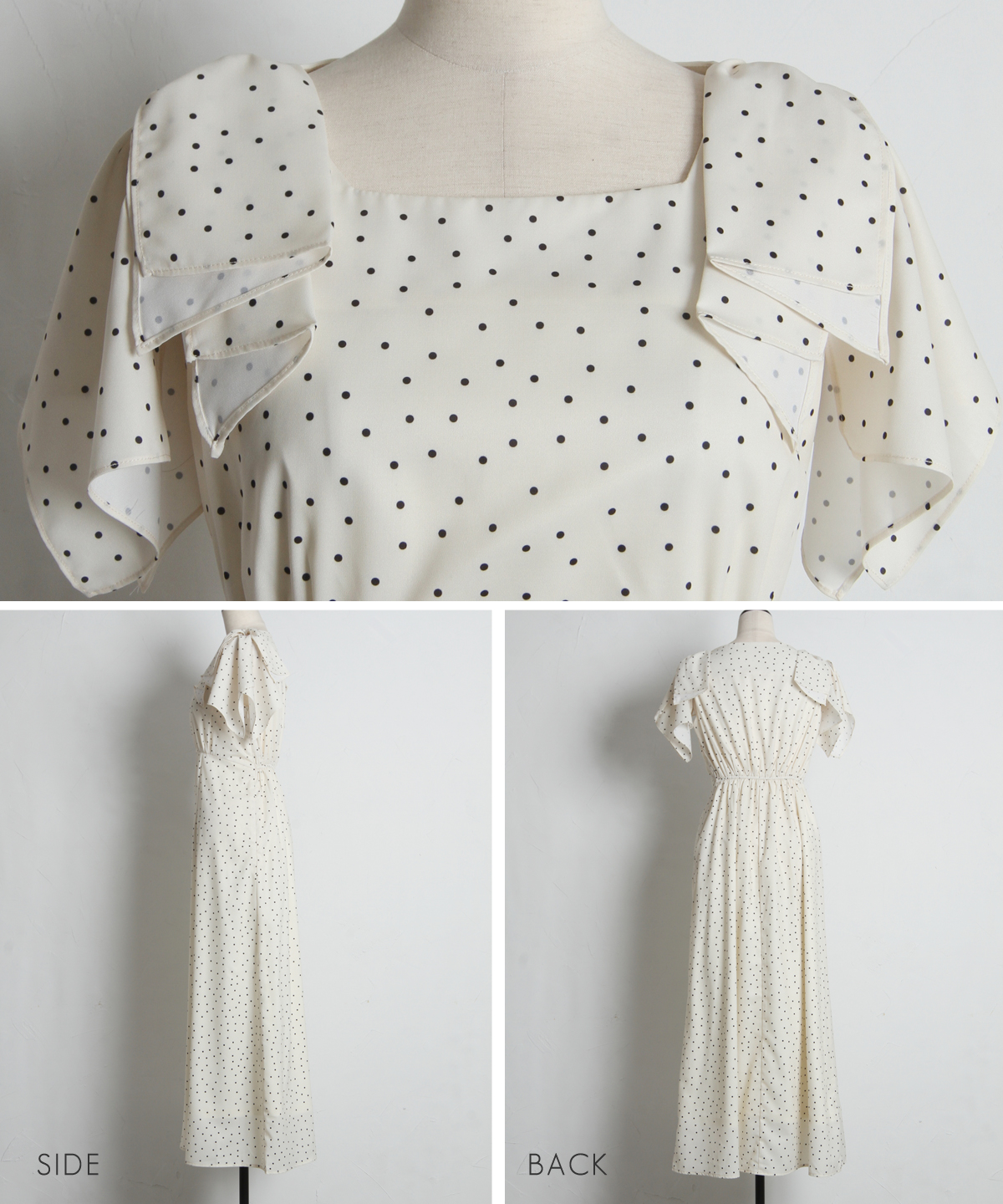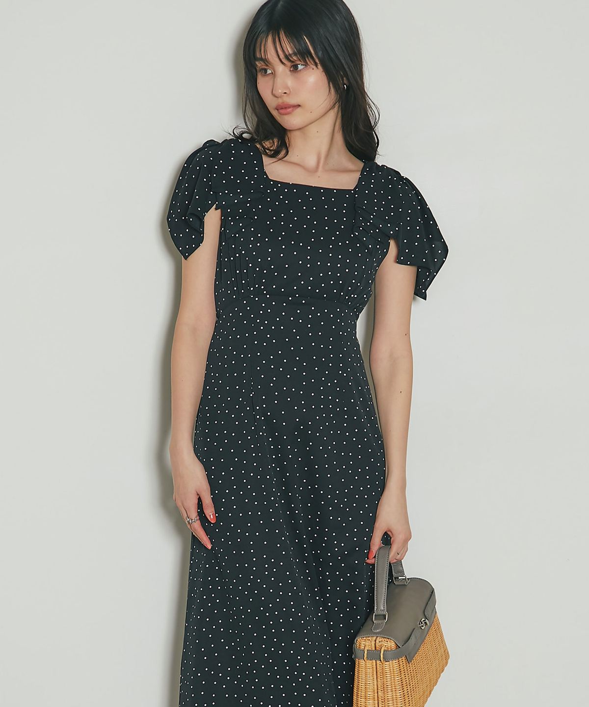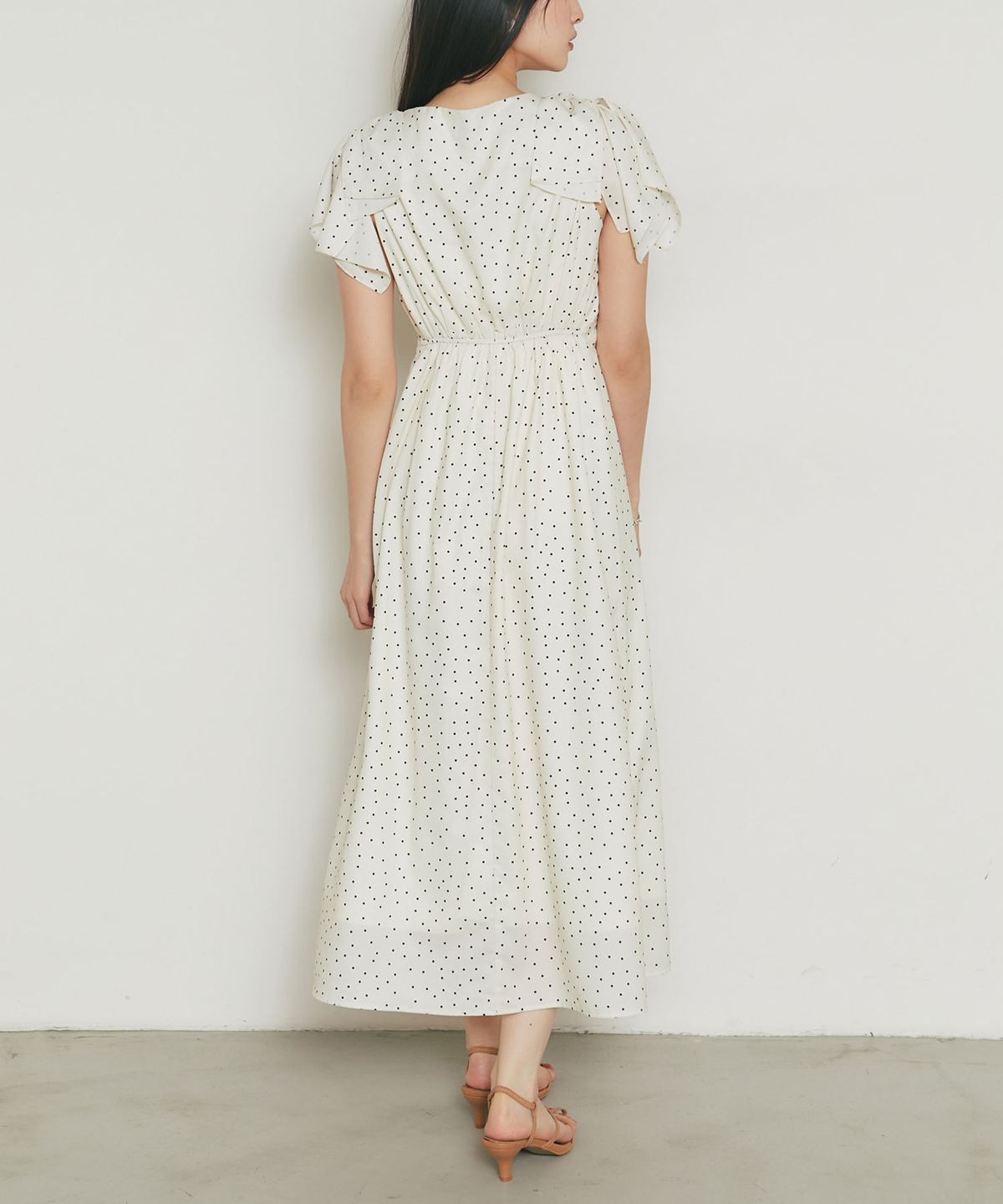 可愛らしさと大人っぽさを両立した ドット柄リボンスリーブワンピース。