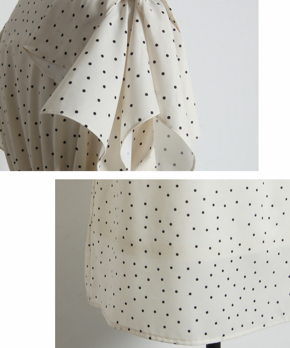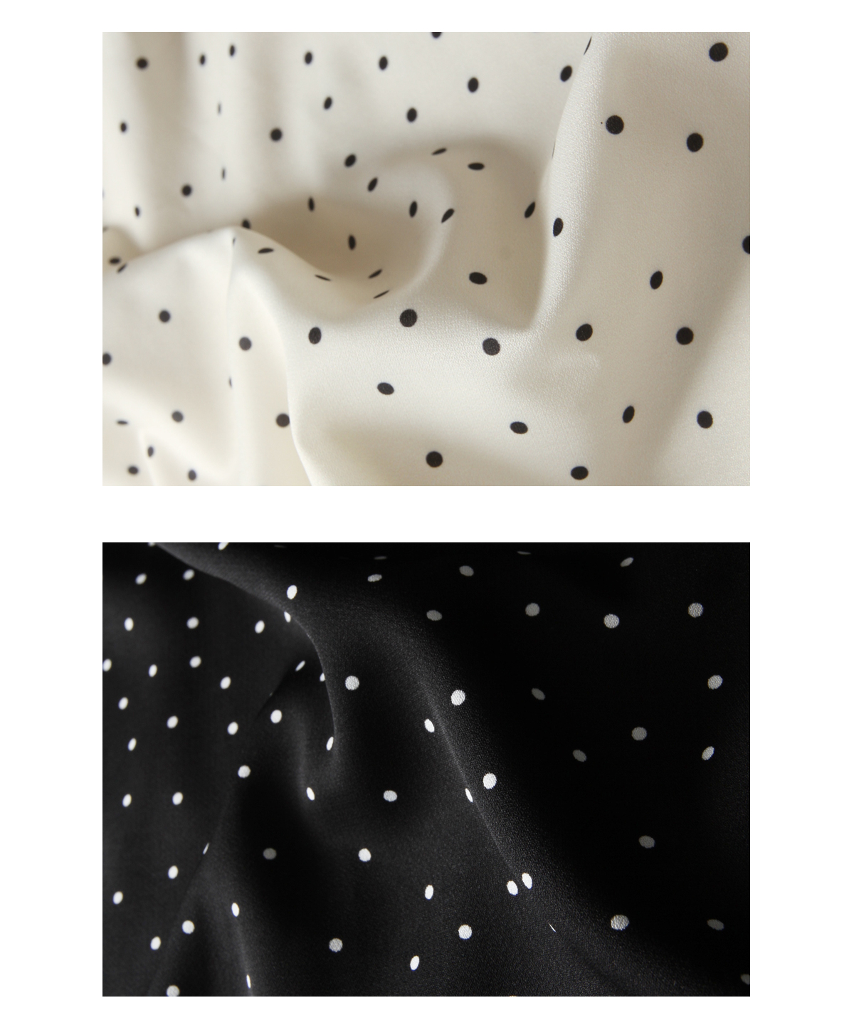 クラシカルなドット柄が目を引きつつ、フェミニンなリボン付きの袖デザインがエレガントなアクセントに。柔らかで程よい落ち感のある素材が、
