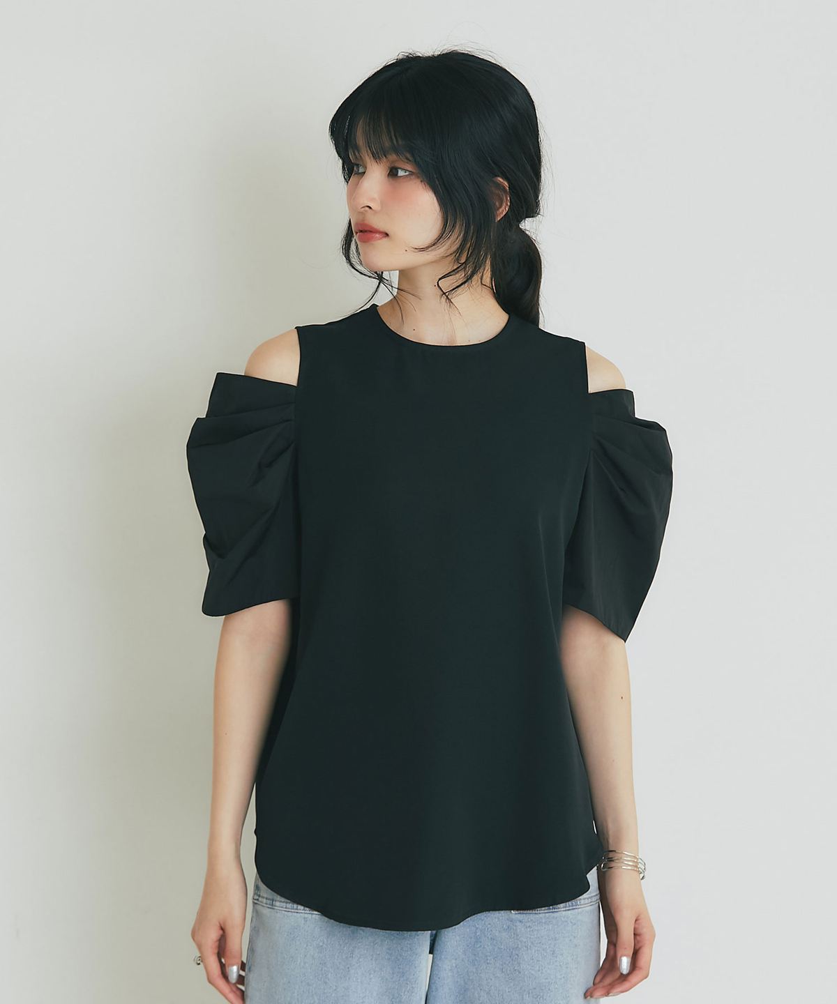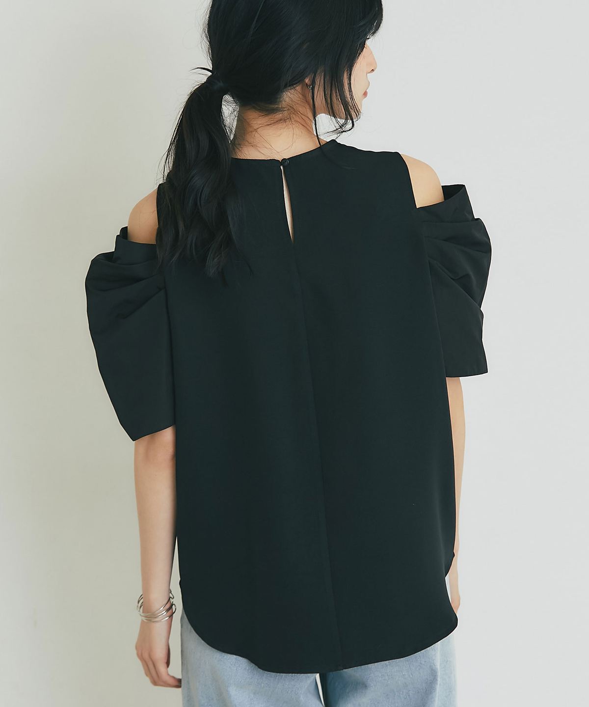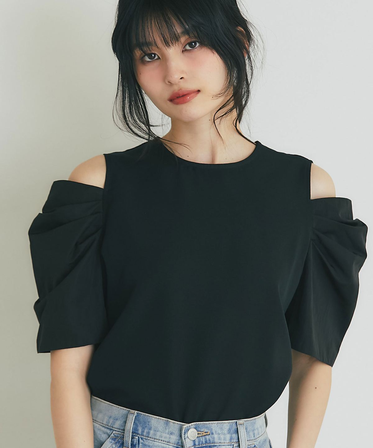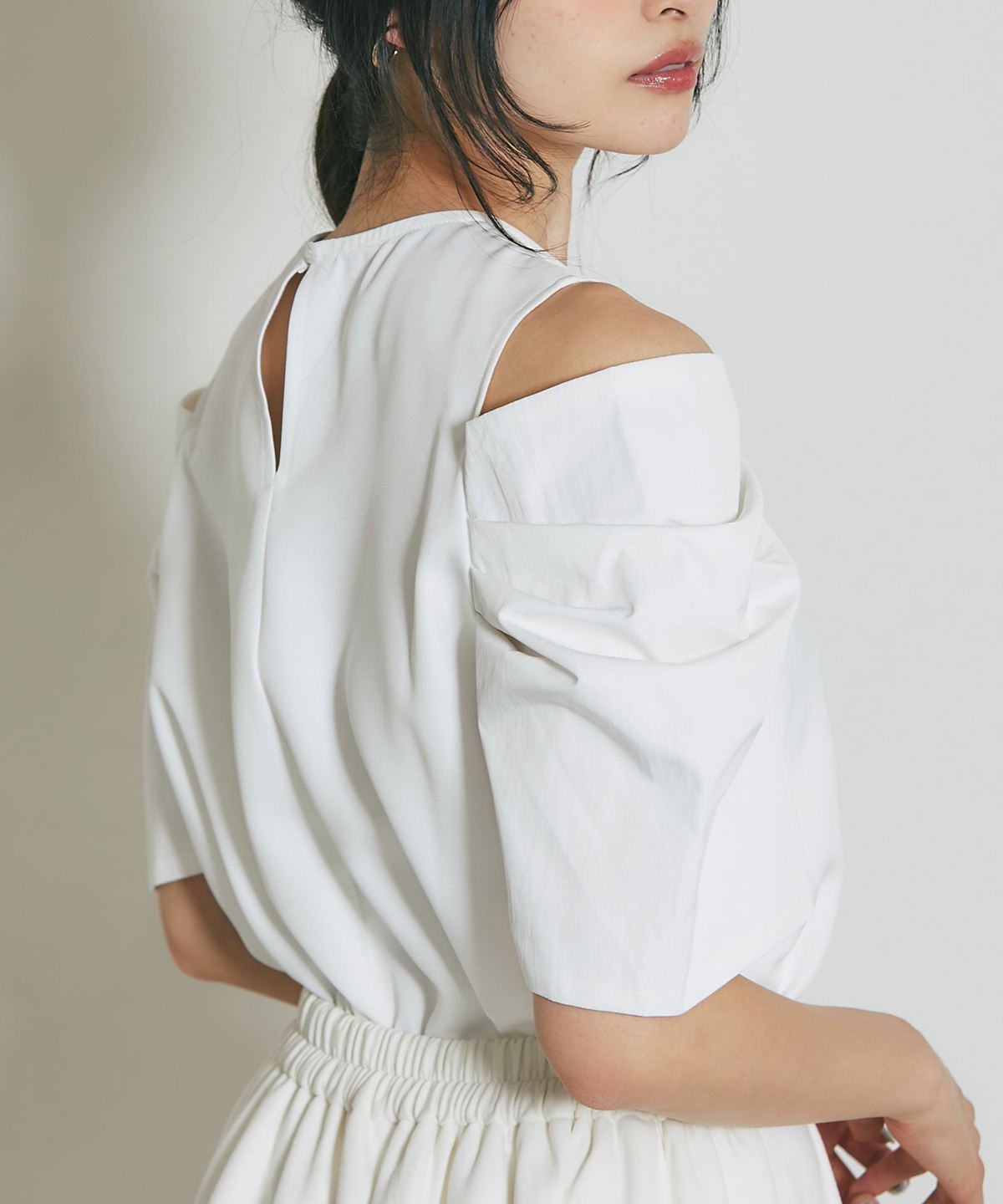 ヘルシーな肌見せとボリューム袖で魅せる、大人のモードブラウス。