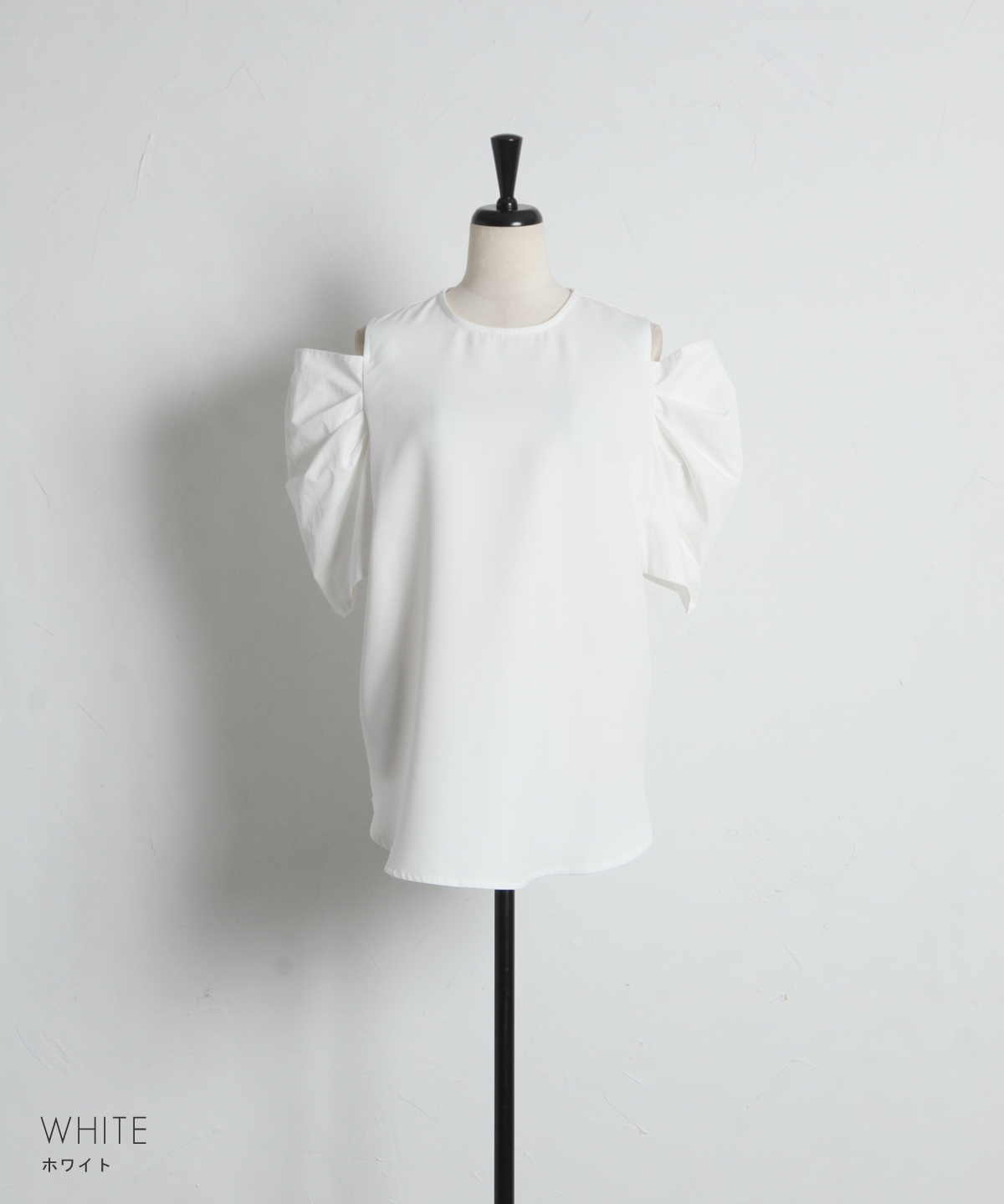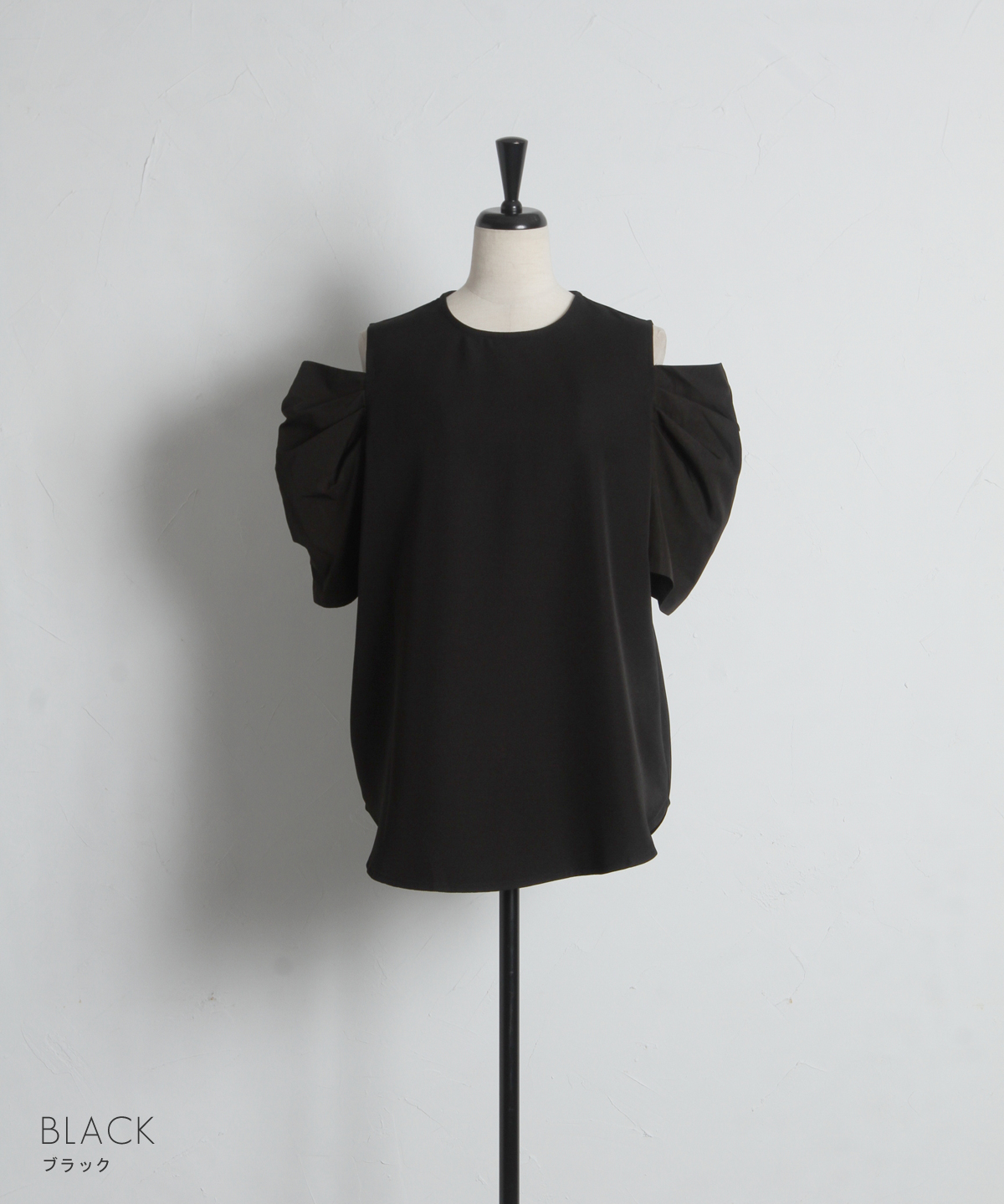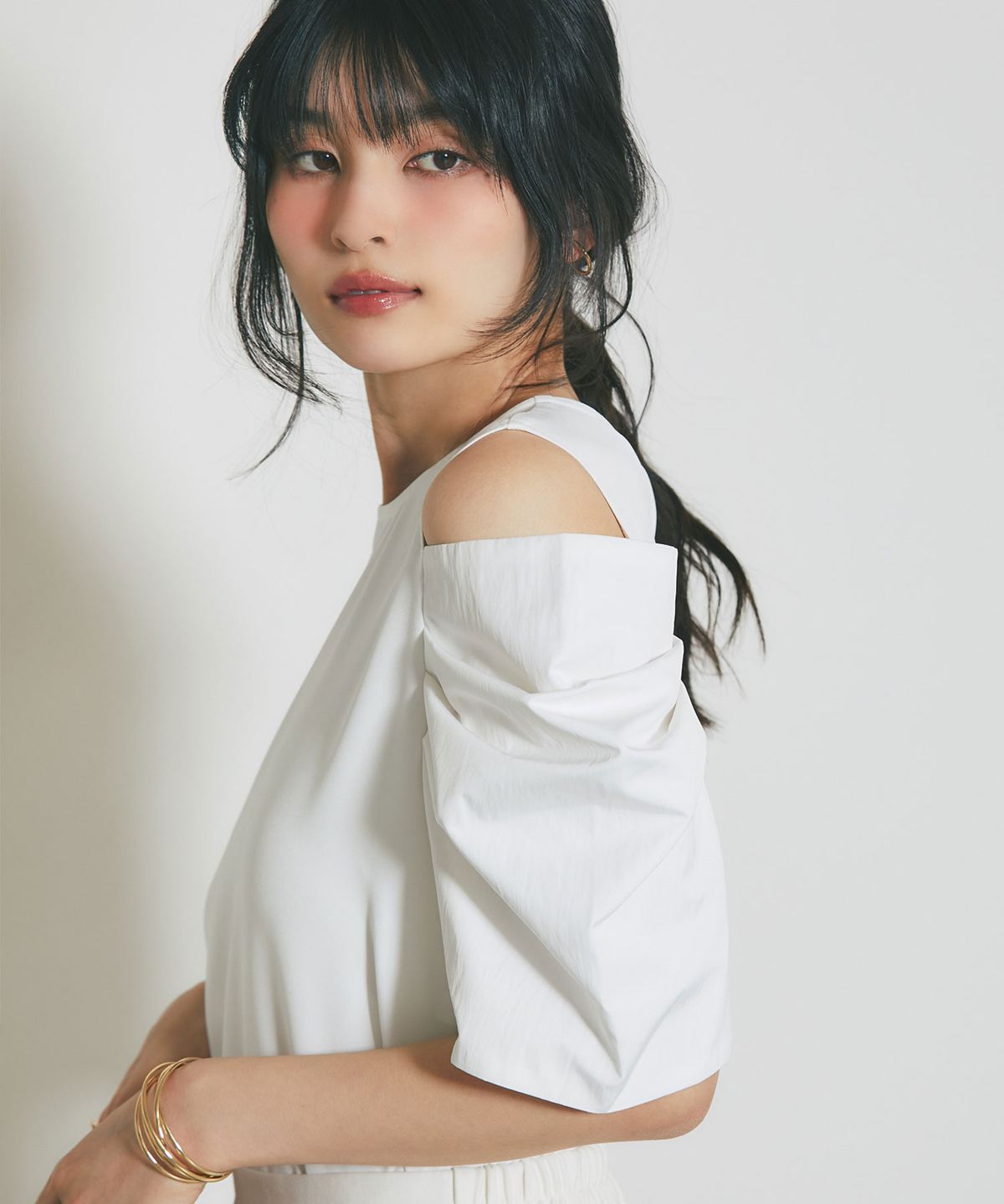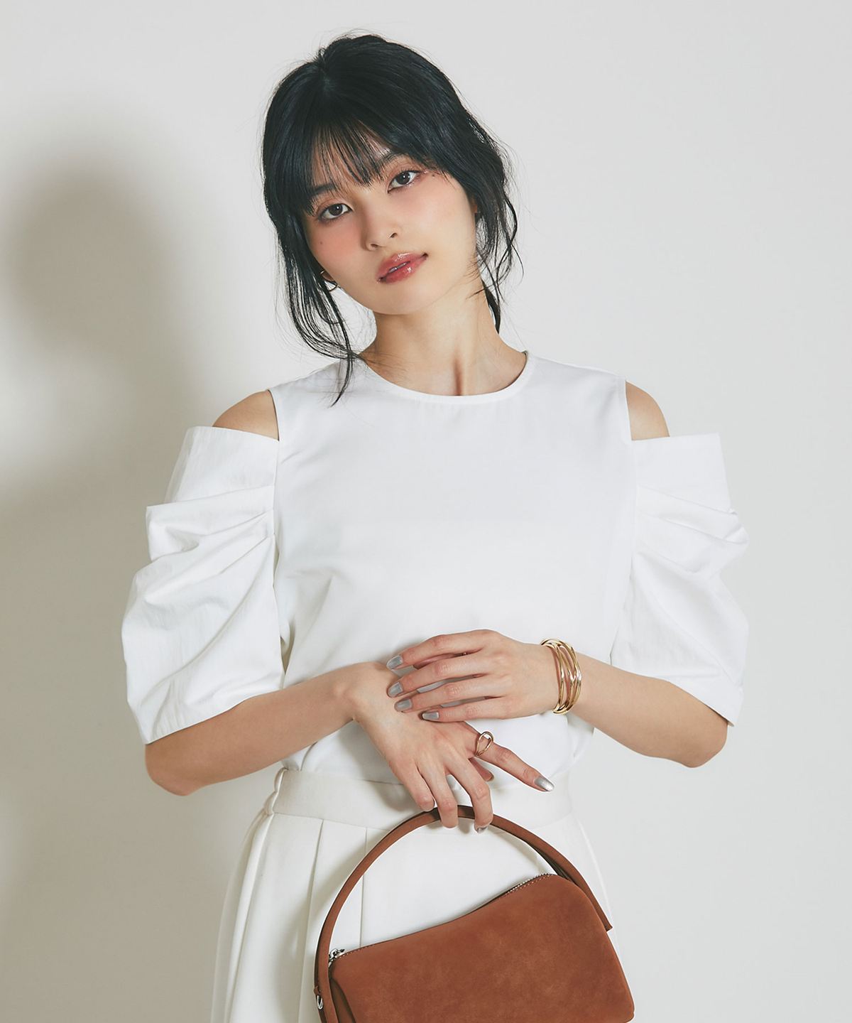 ヘルシーな肌見せとボリューム袖で魅せる、大人のモードブラウス。