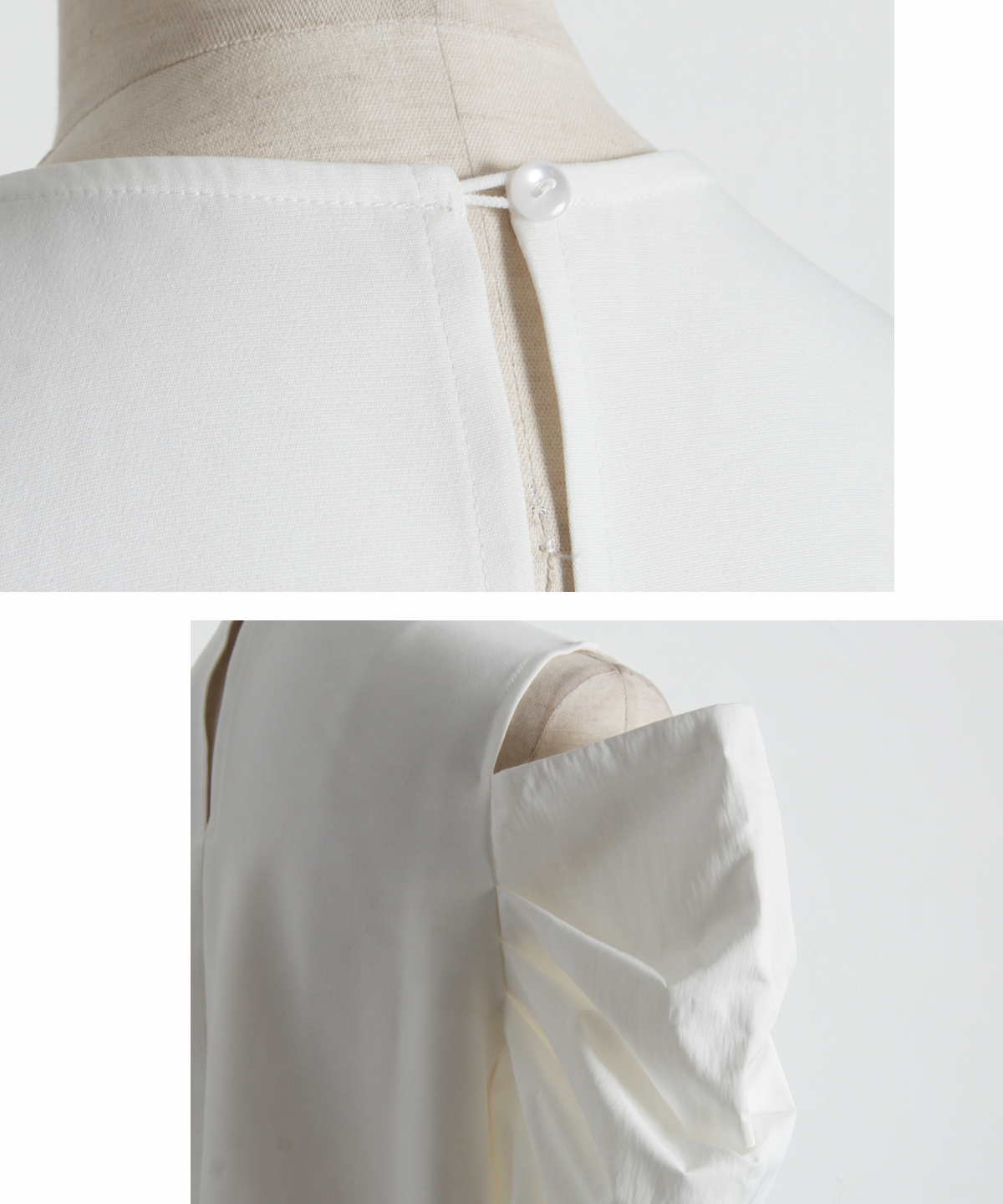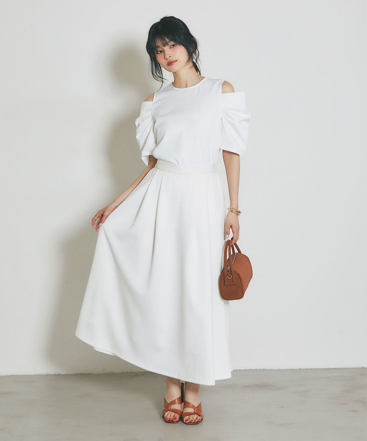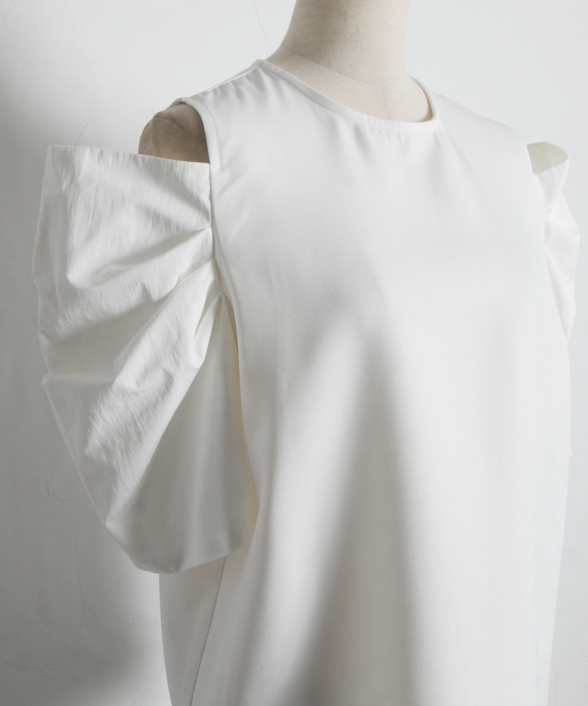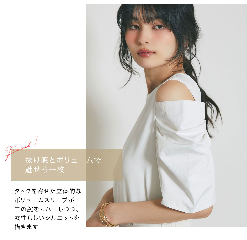 タックを寄せた立体的なボリュームスリーブが二の腕をカバーしつつ、女性らしいシルエットを描きます。