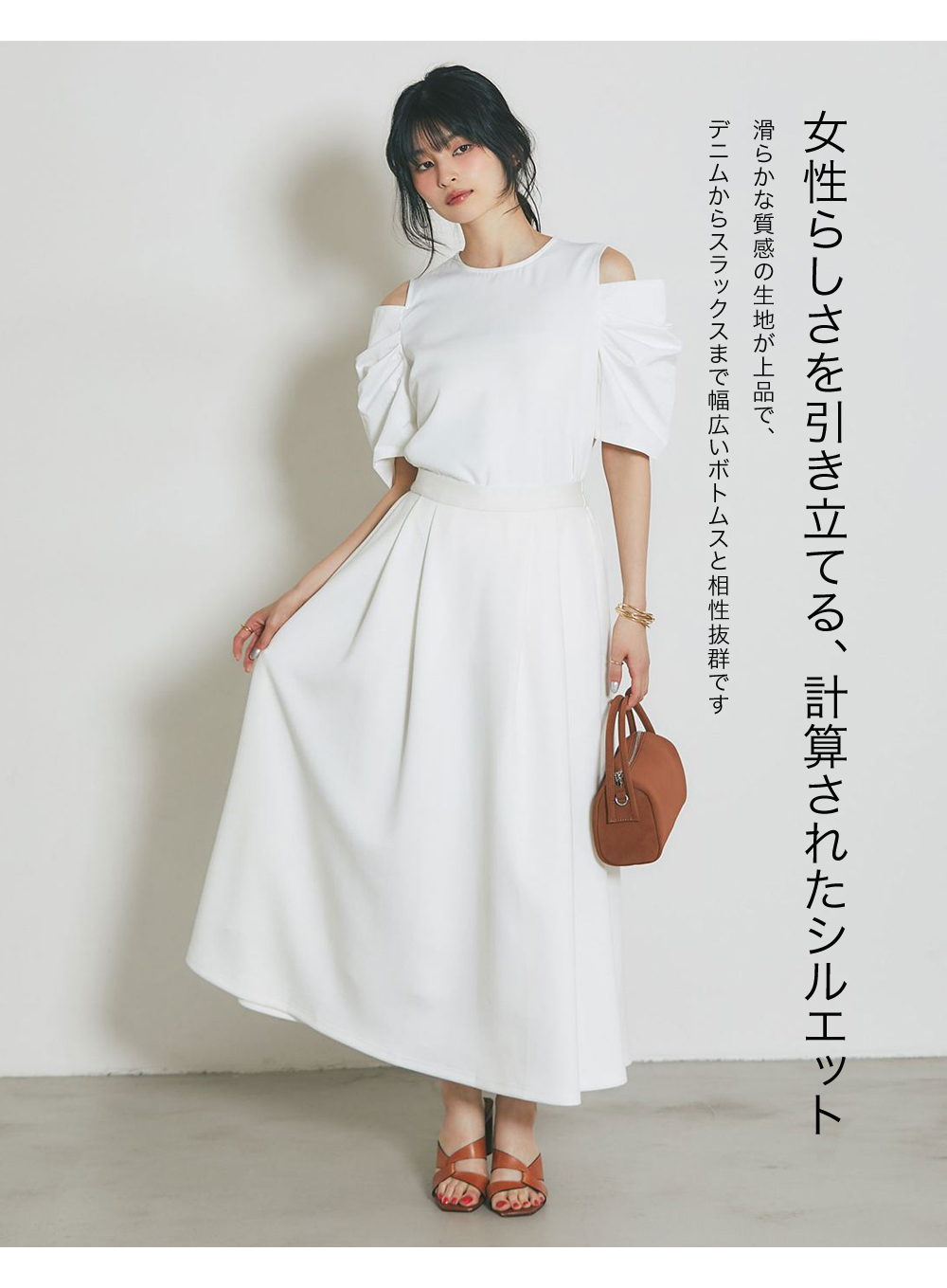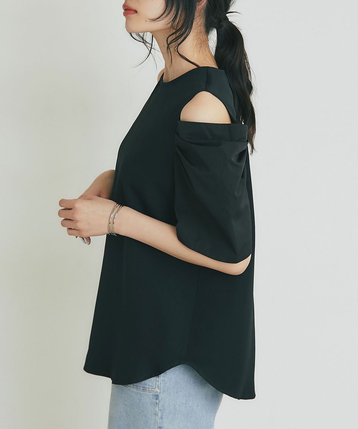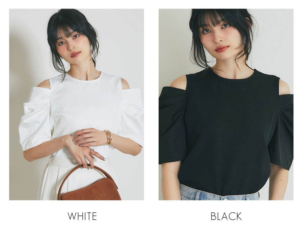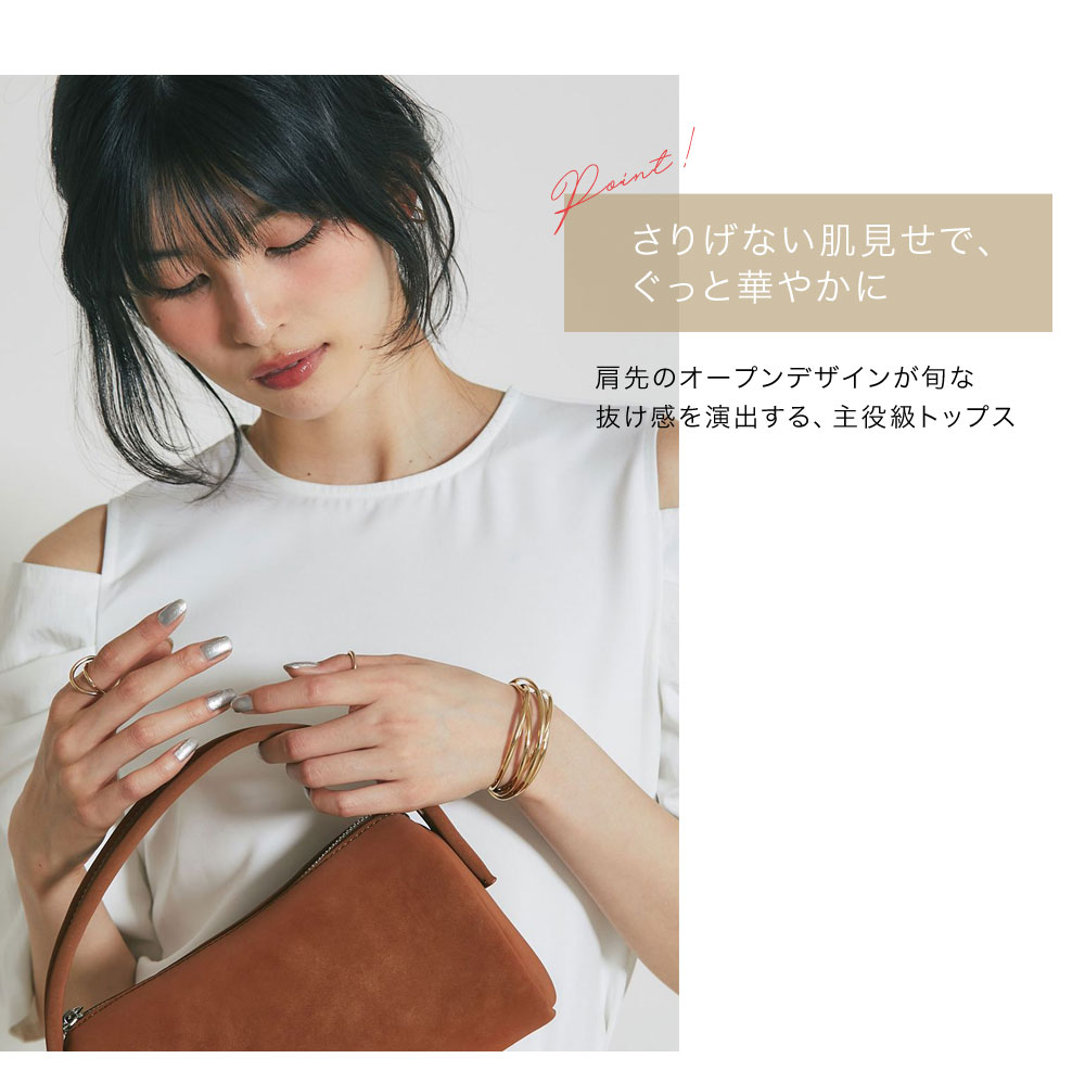 肩先のオープンデザインが旬な抜け感を演出する、主役級トップス。