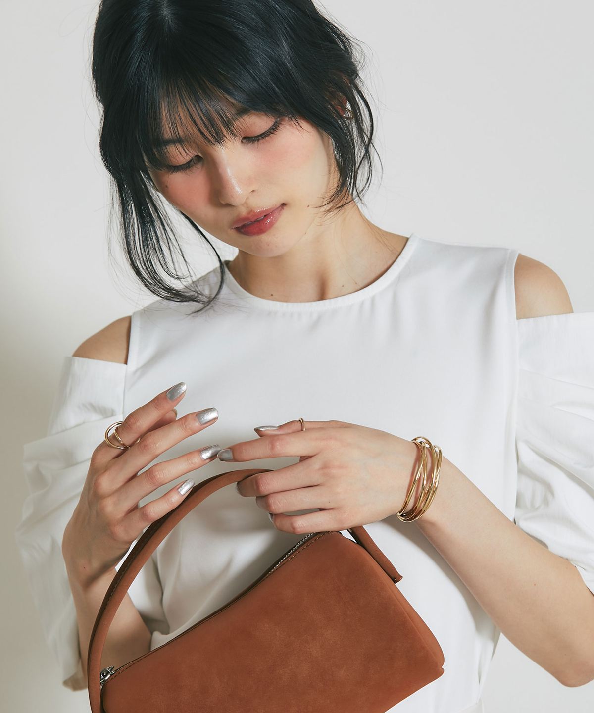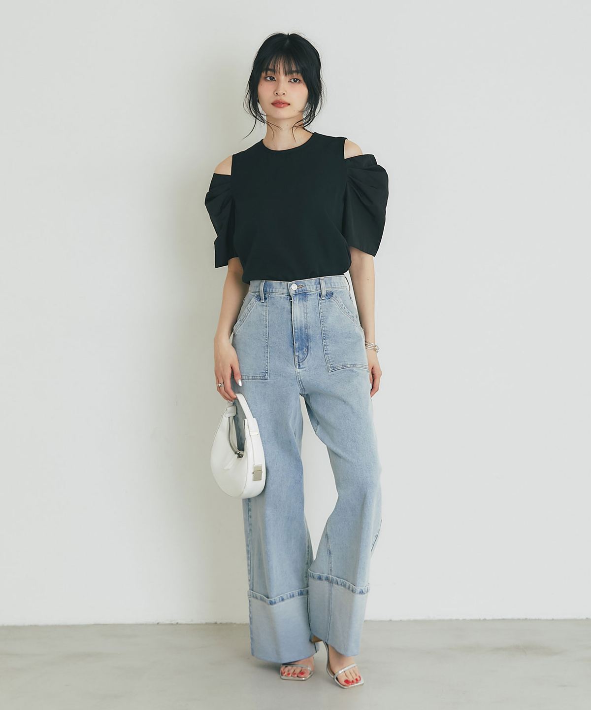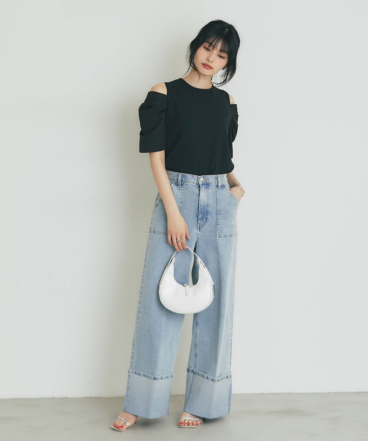 肩先のオープンデザインが旬な抜け感を演出する、主役級トップス。